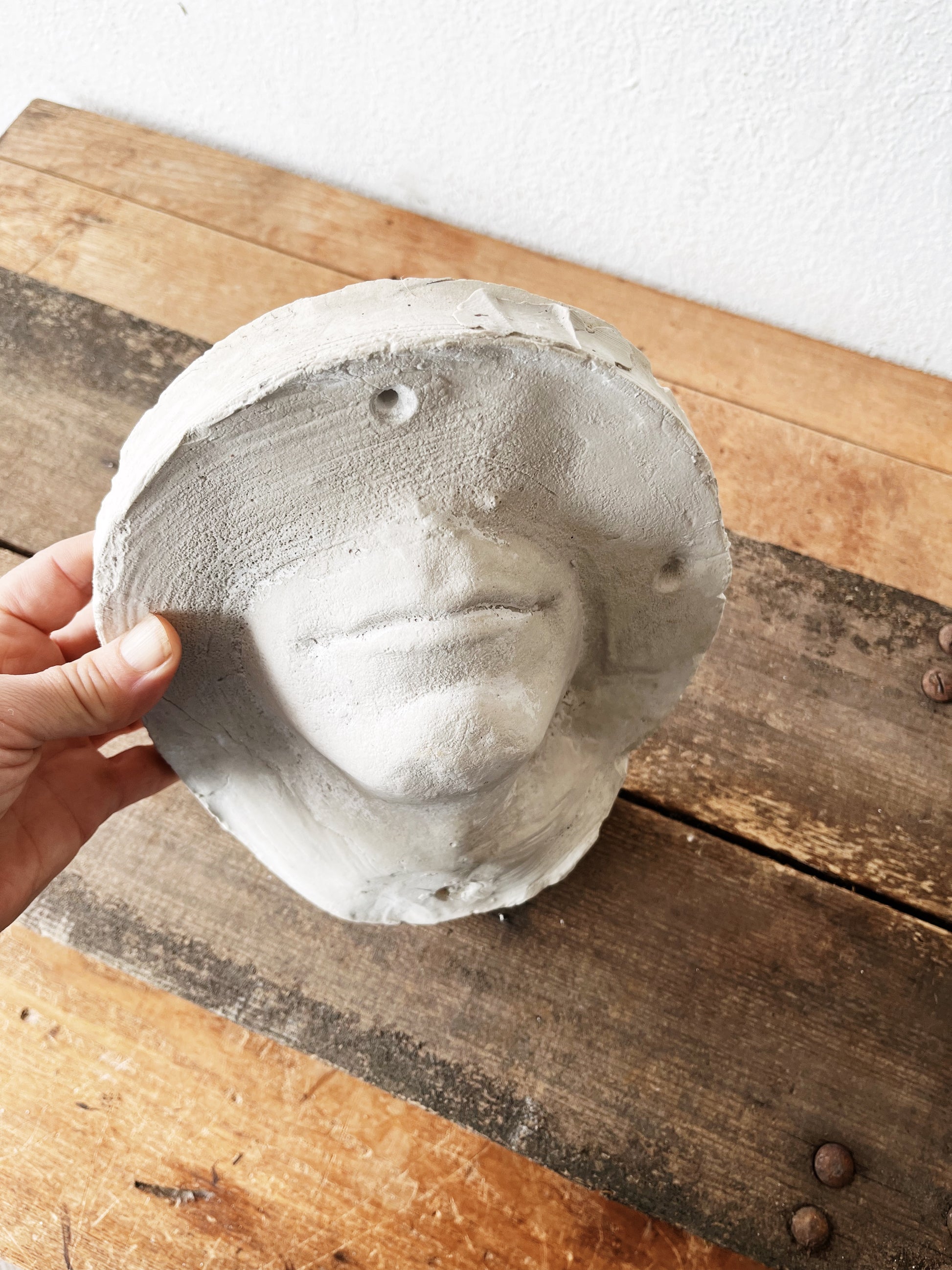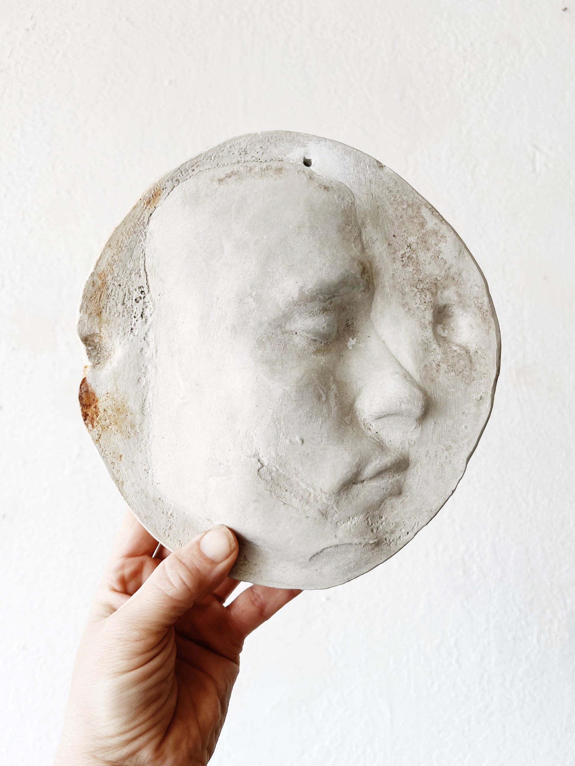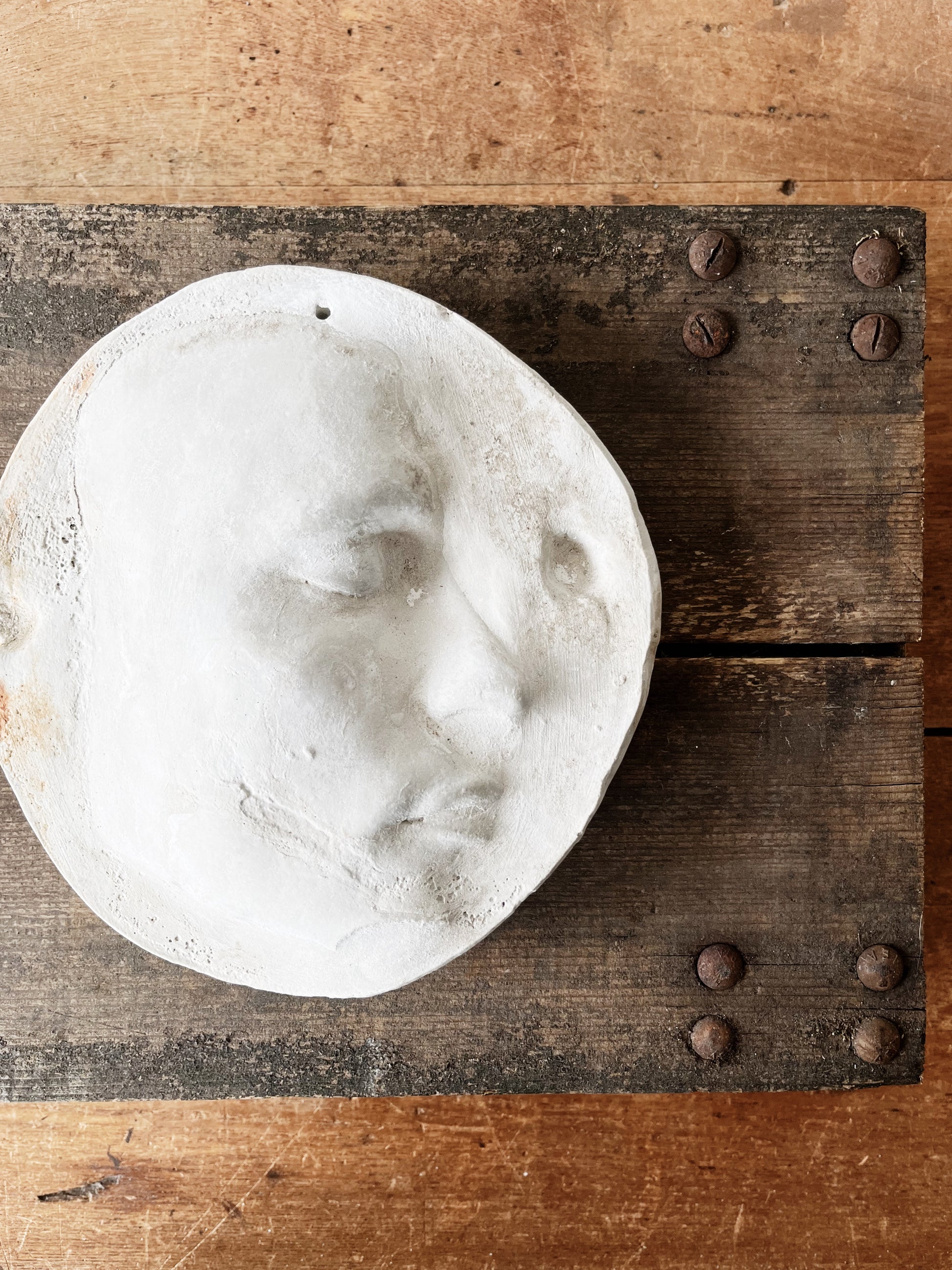 Austere and ethereal plaster masks. Love how the forms elevate the familiar. Each lovely and intriguing in its own way. Holes for hanging. Artist unknown