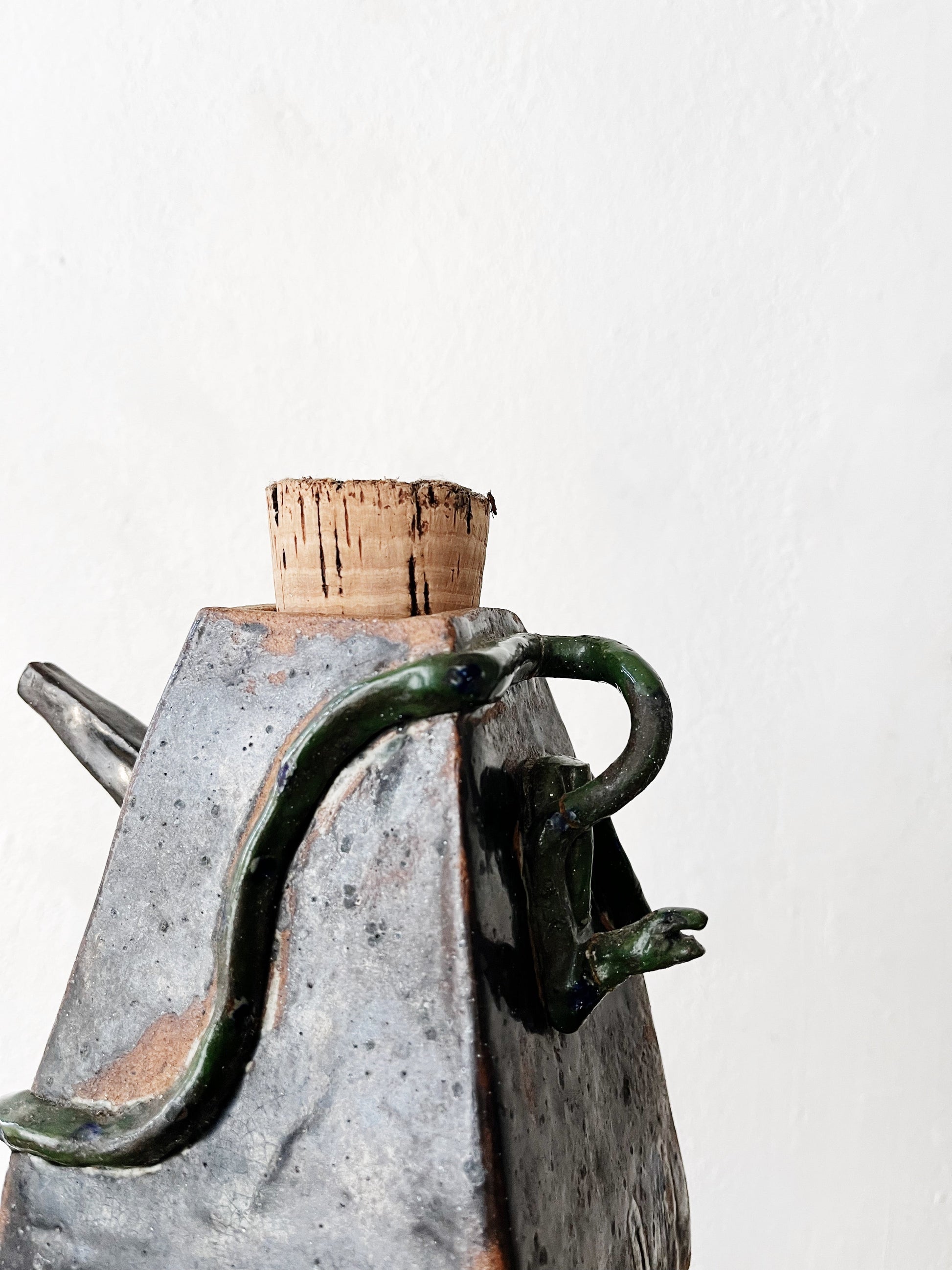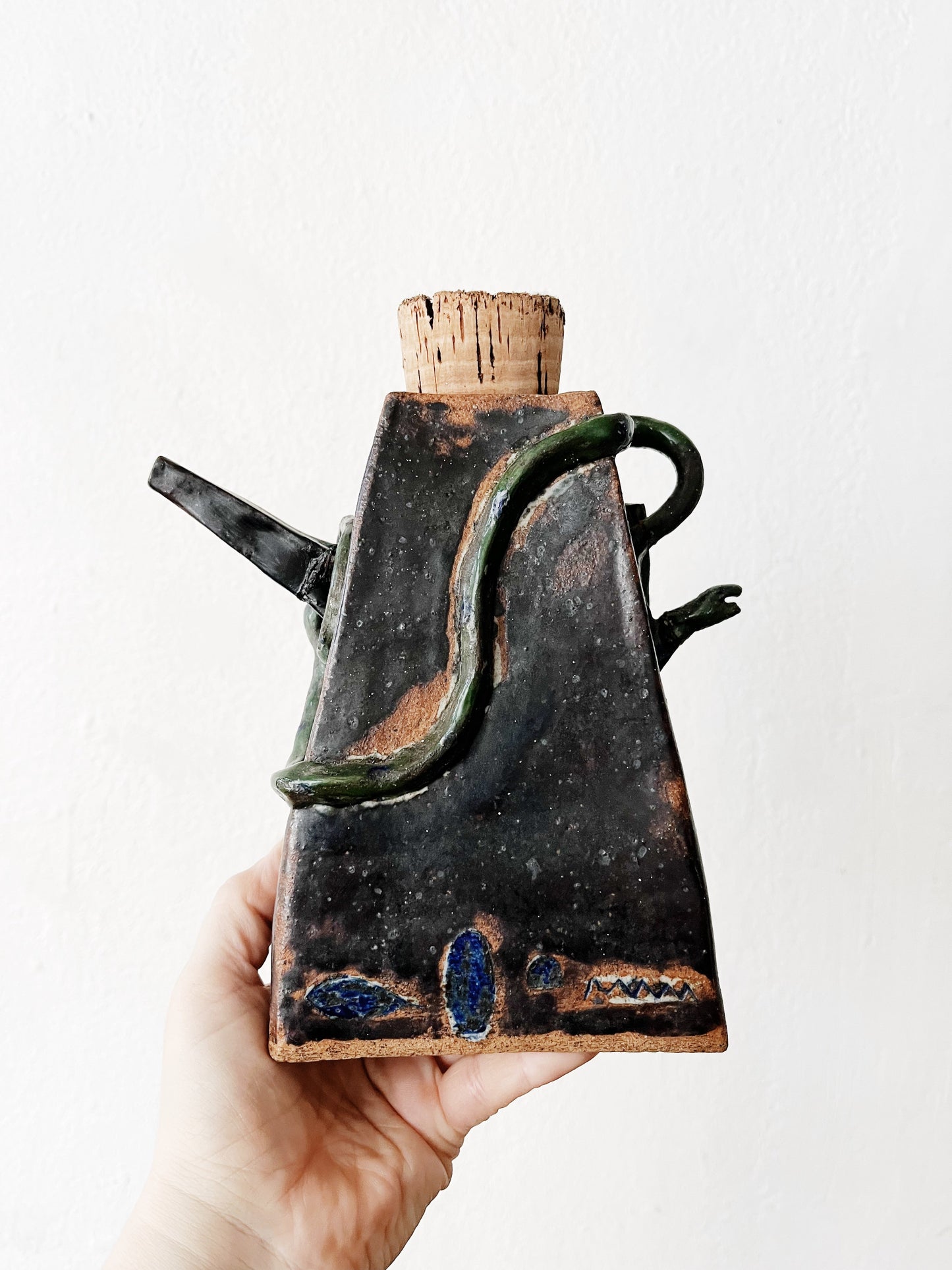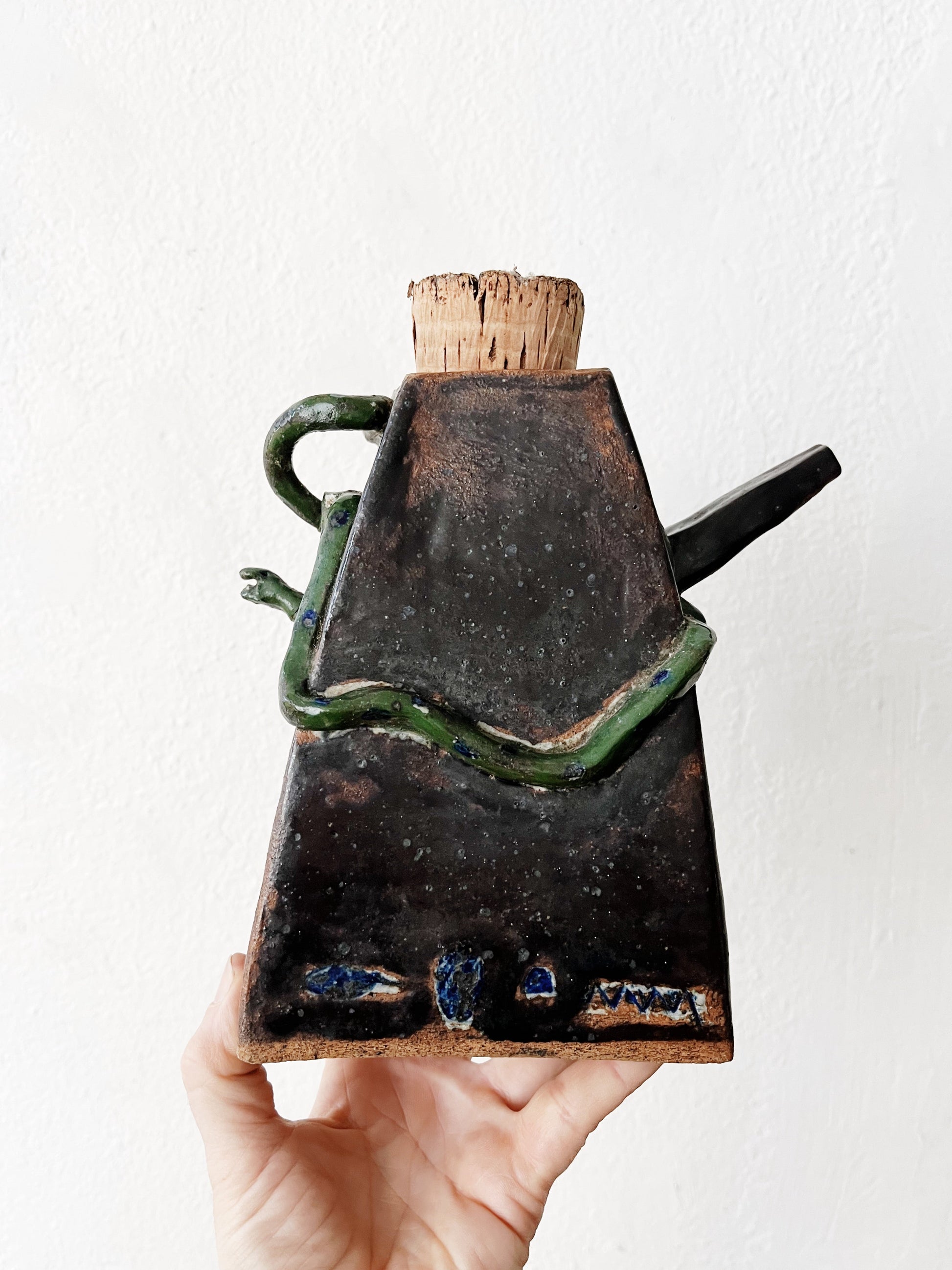 Wow what a piece! A slab built teapot or pourer. Slinking snake wraps around. Thick cork atop. Brutalist surrealism is a wonderful genre.
