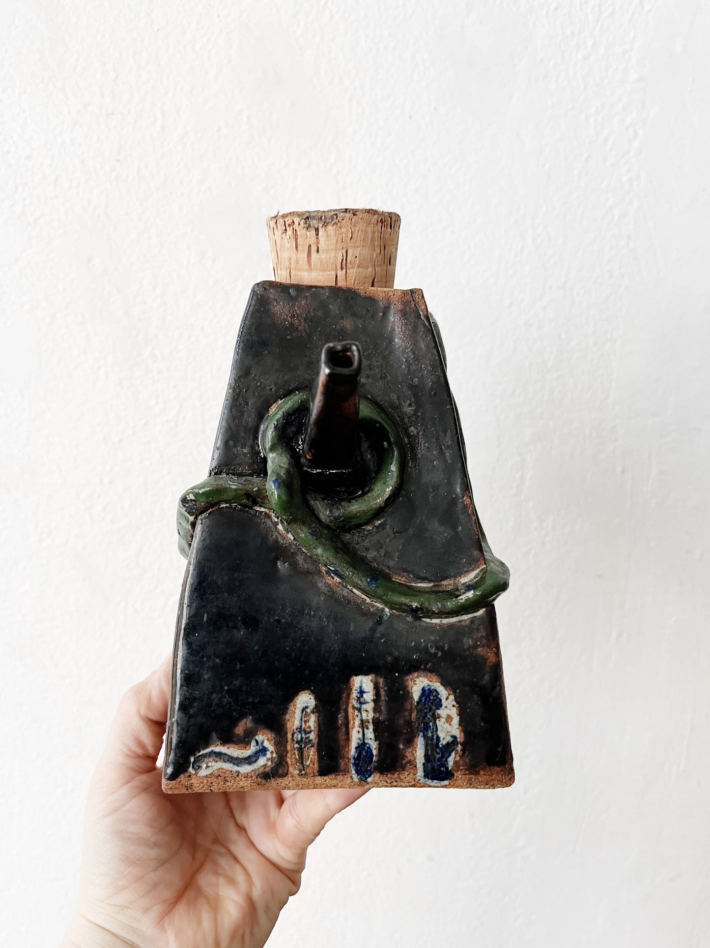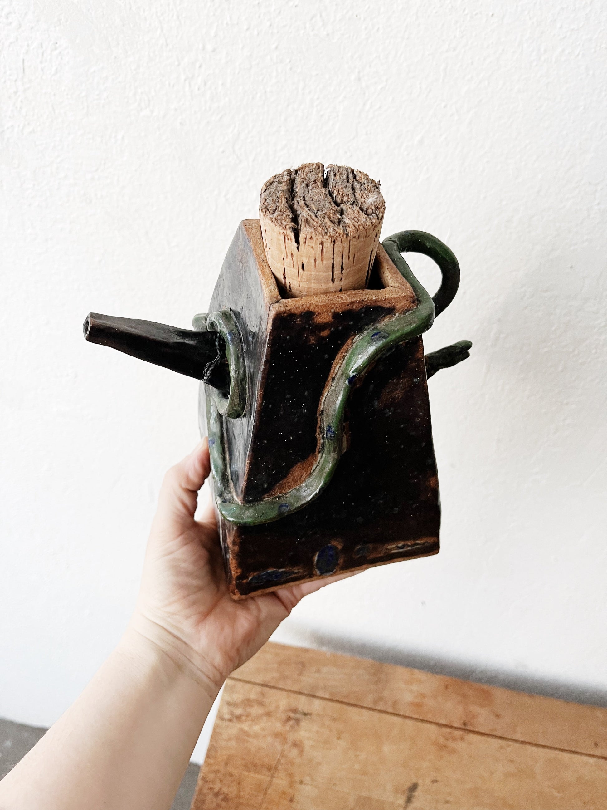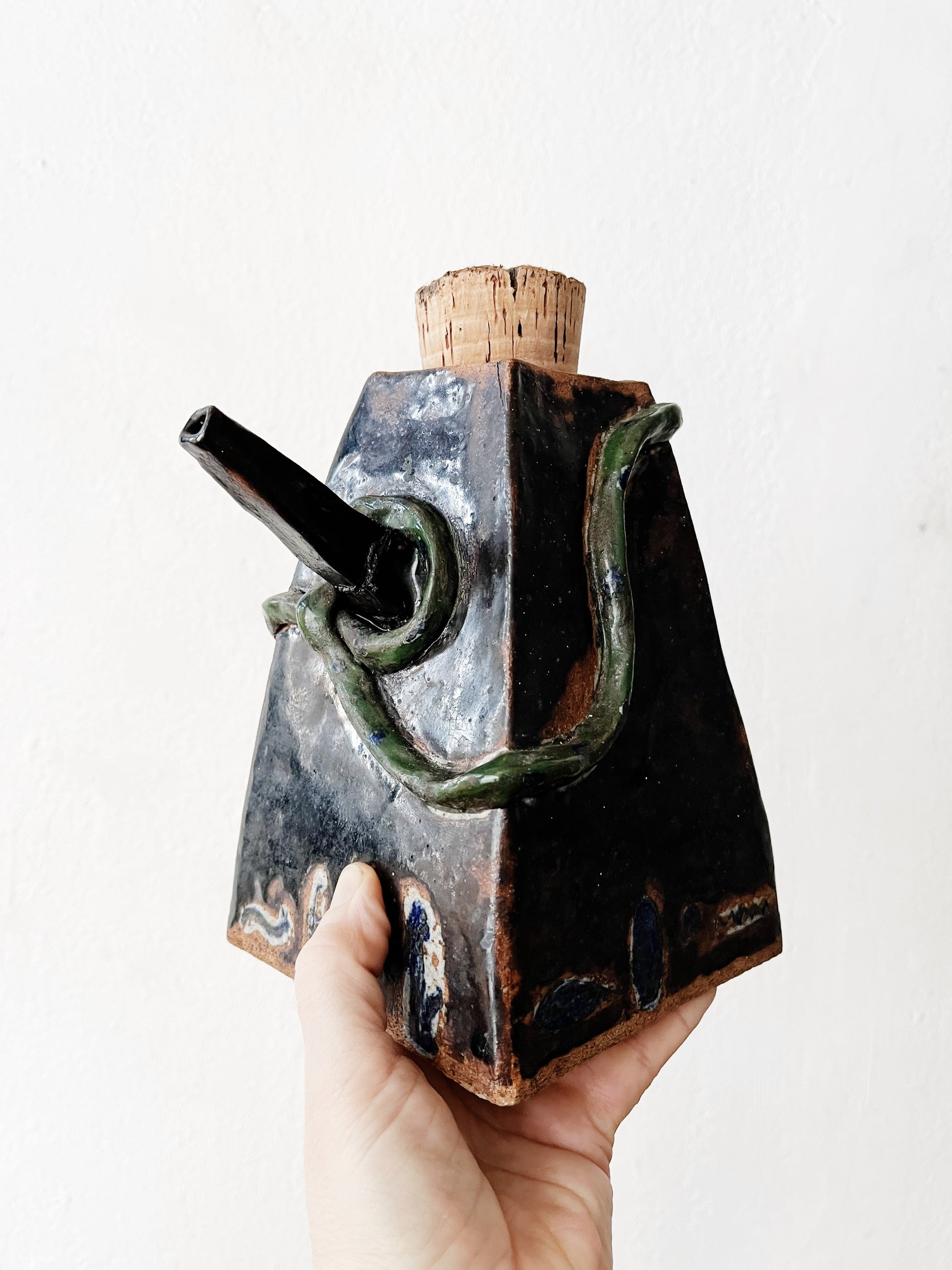 Wow what a piece! A slab built teapot or pourer. Slinking snake wraps around. Thick cork atop. Brutalist surrealism is a wonderful genre.