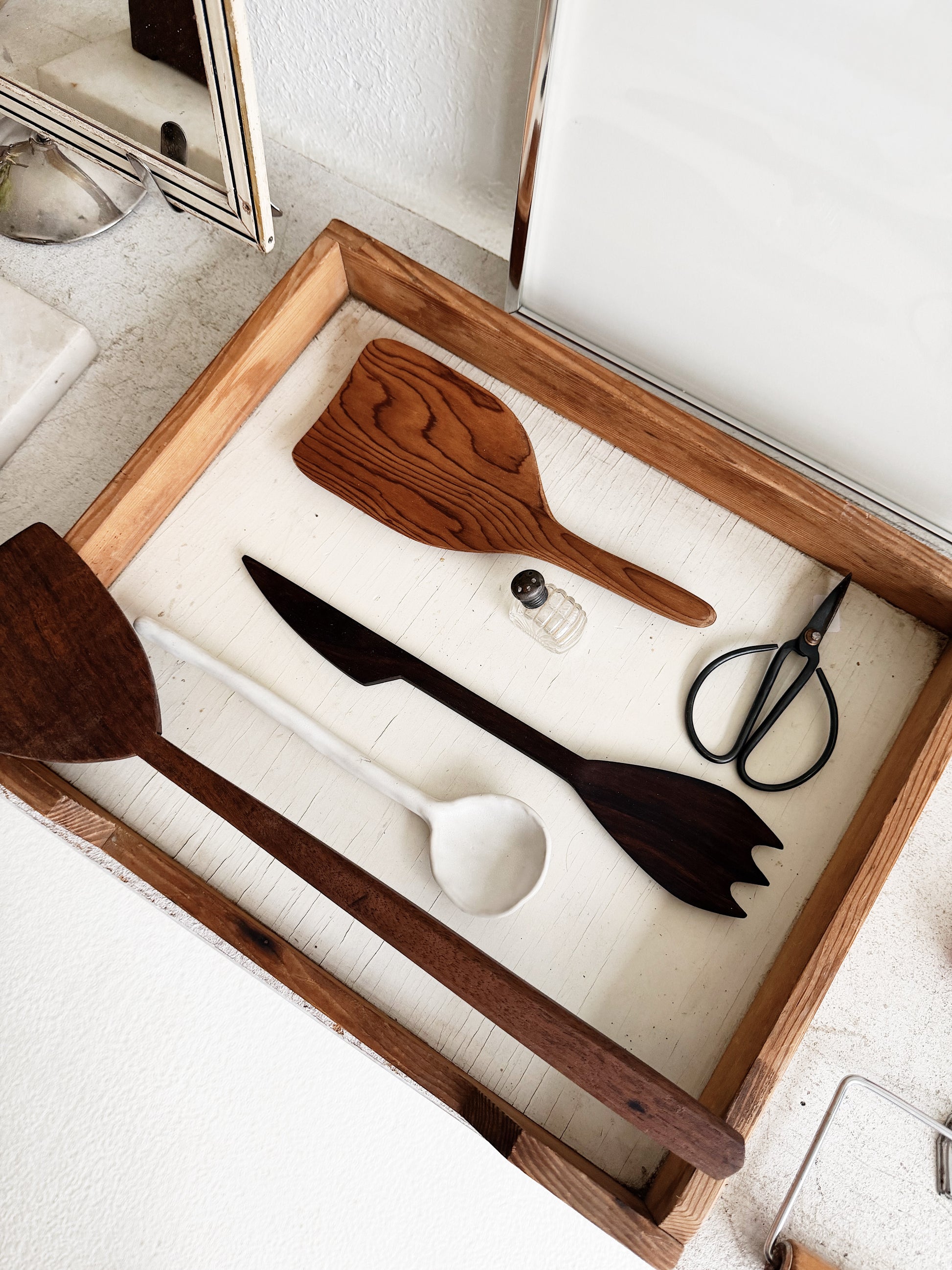 Form meets function in these hand crafted utensils. Collected for their organic and 'off' shapes. Each shows the work of the maker. Gorgeous wood and one Clay piece