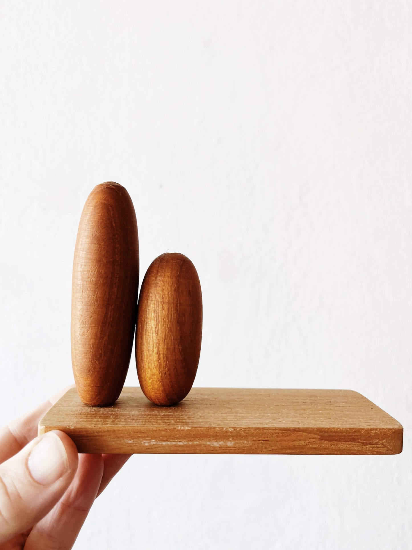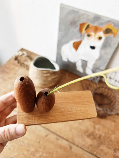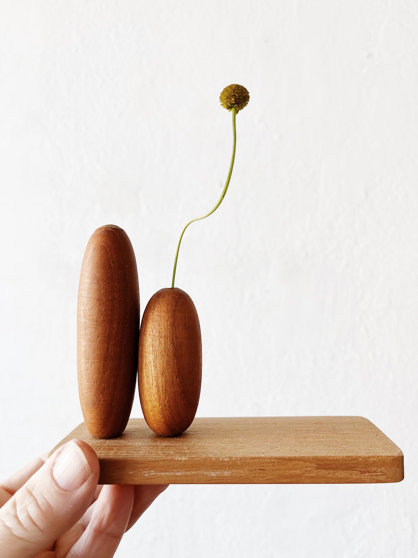 Hand made teak weed vase by Plern Du. Modernist styling for a stem or two