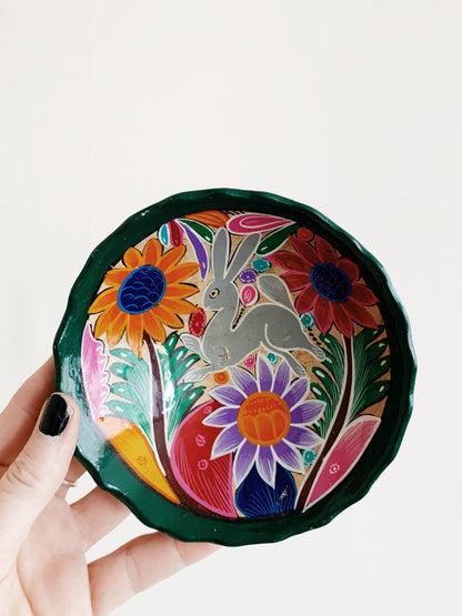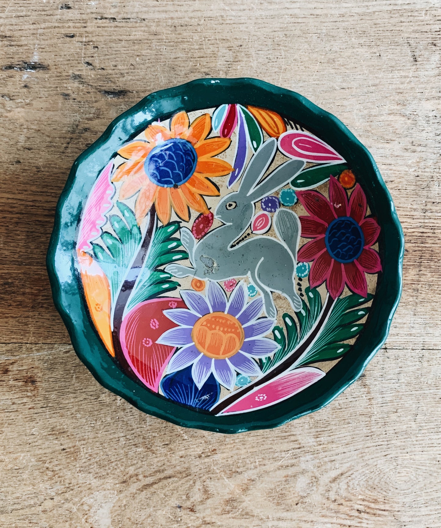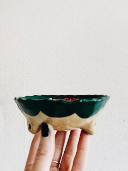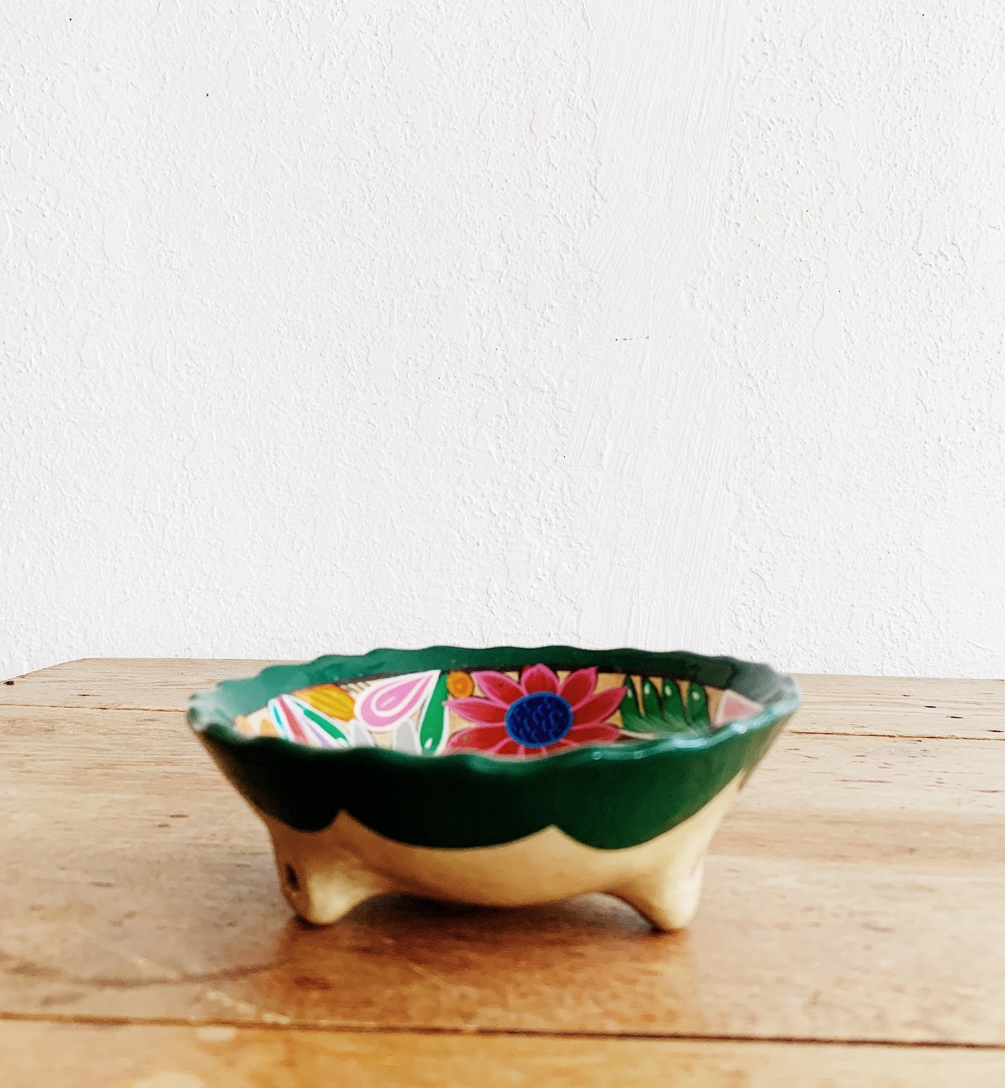Beautifully hand painted footed clay dish. Made in Mexico.