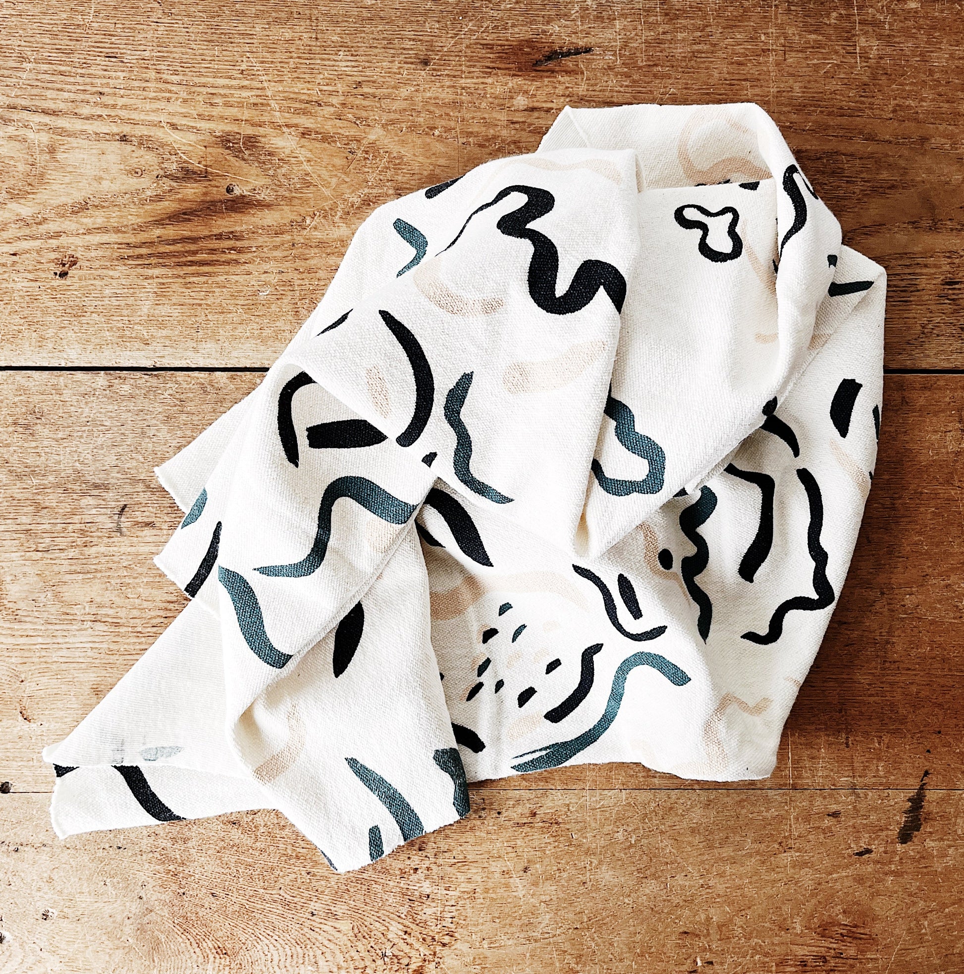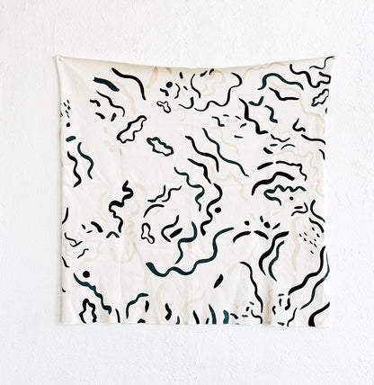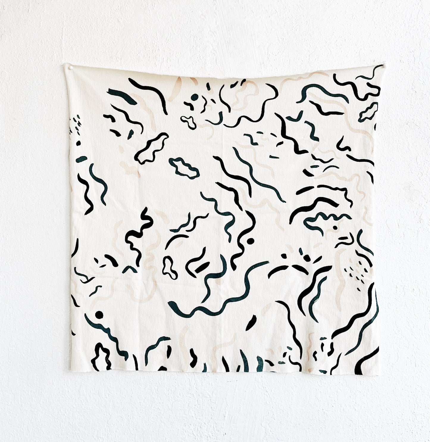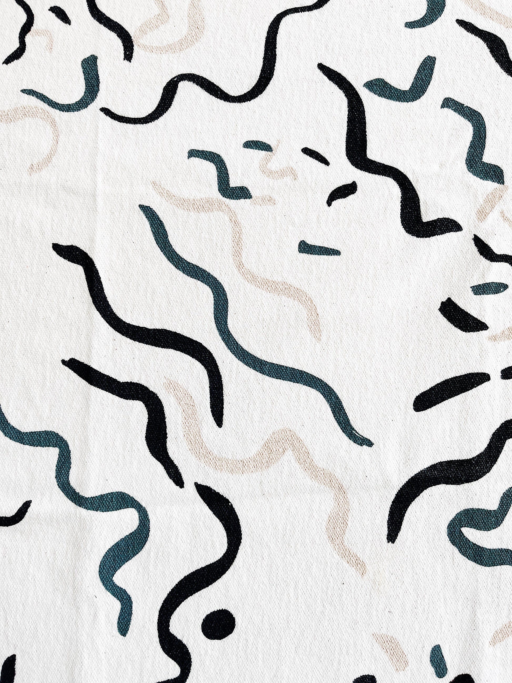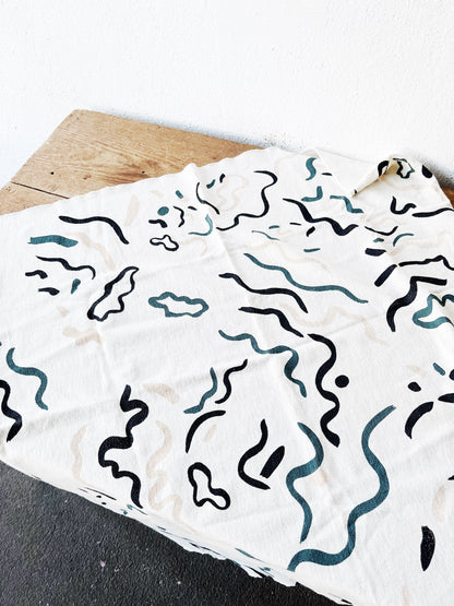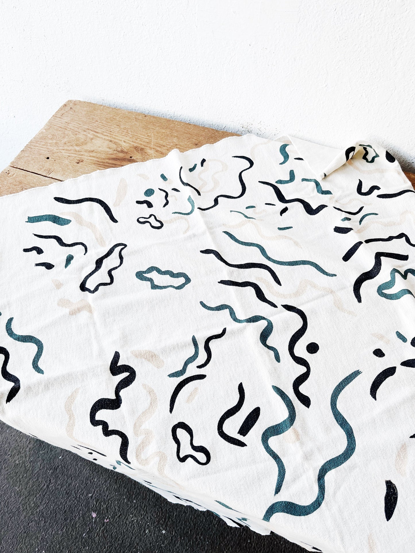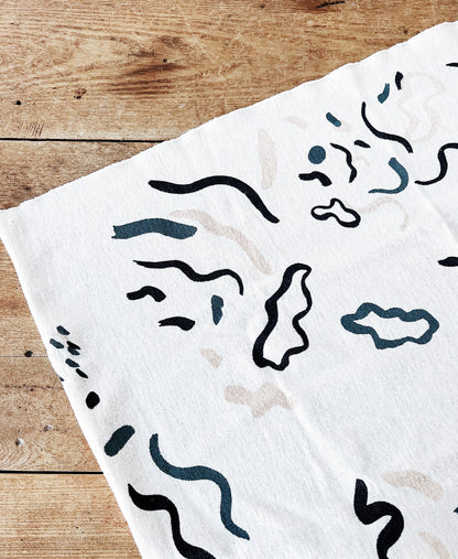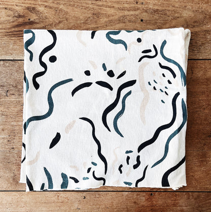 Hand printed fabric square with abstract design. Warm white cotton jersey with painted shapes in black, green and buff. Make your own pillow, frame as art