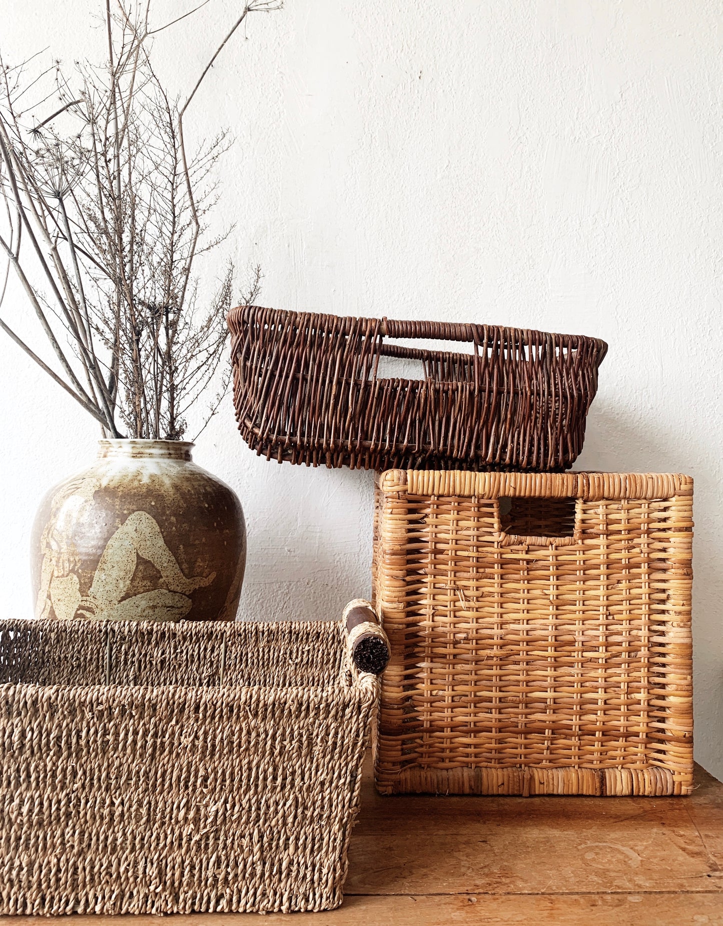 dark willow/ twig with integrated handles ( on top in photo) 18x12x7”.