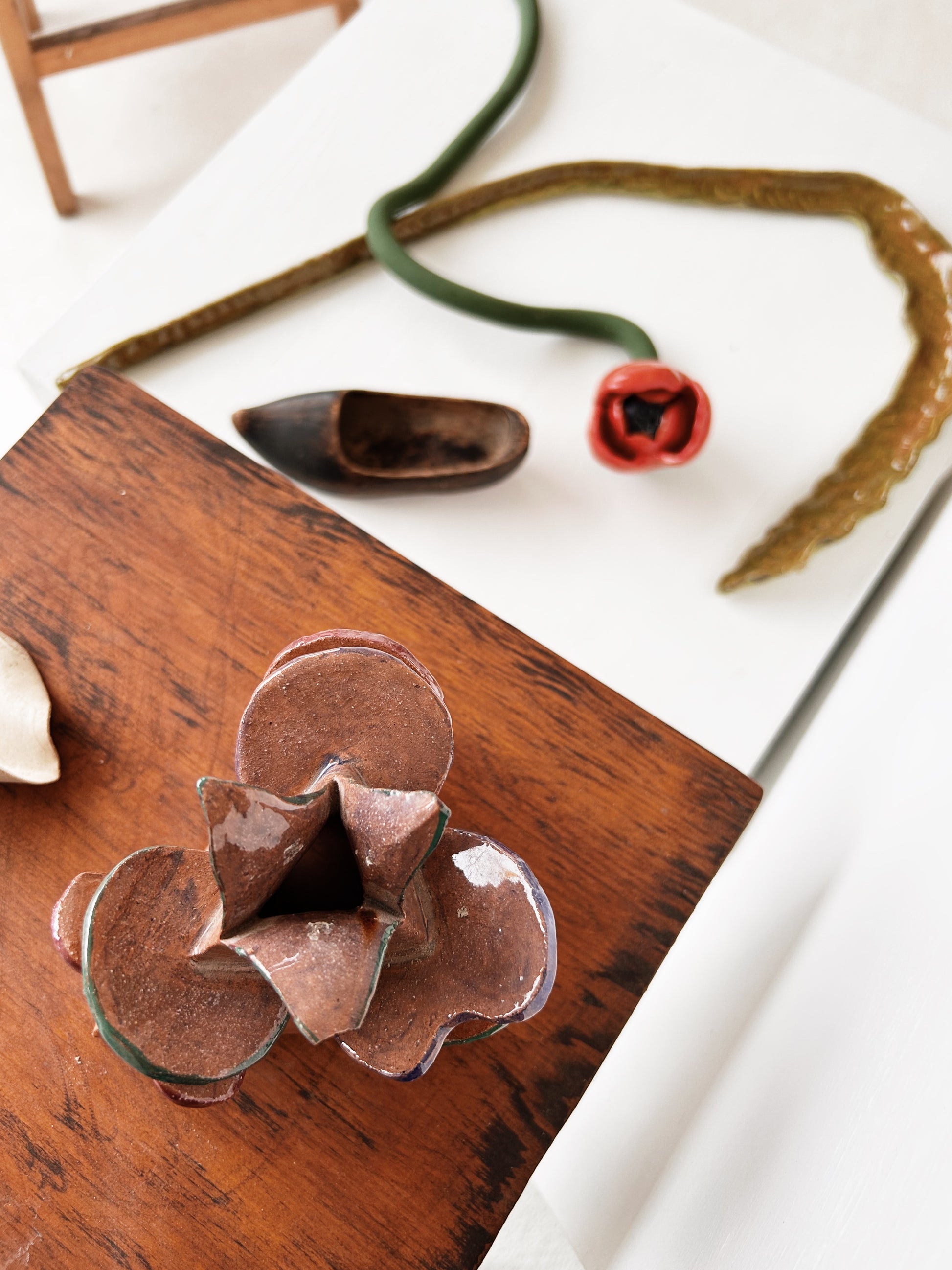 Whimsical ceramic sculpture, handmade. Holds a standard taper or makes a wonderful incense hut.