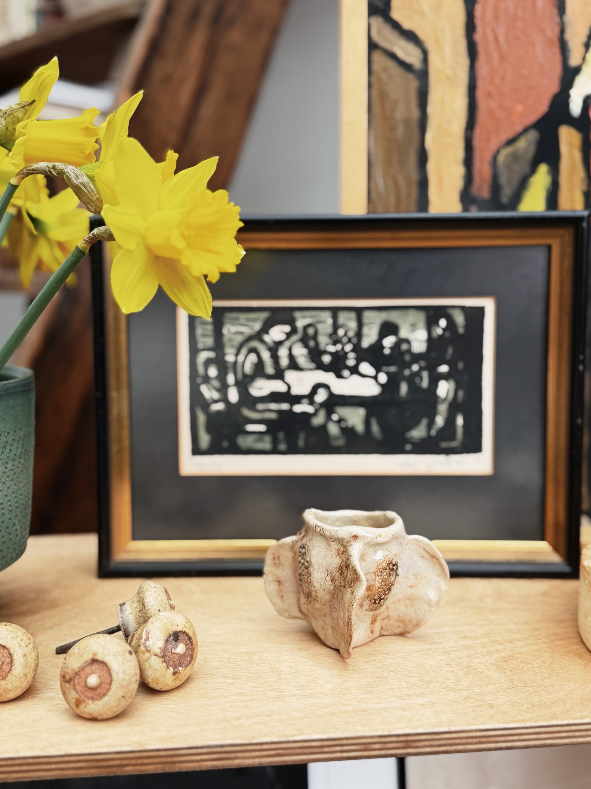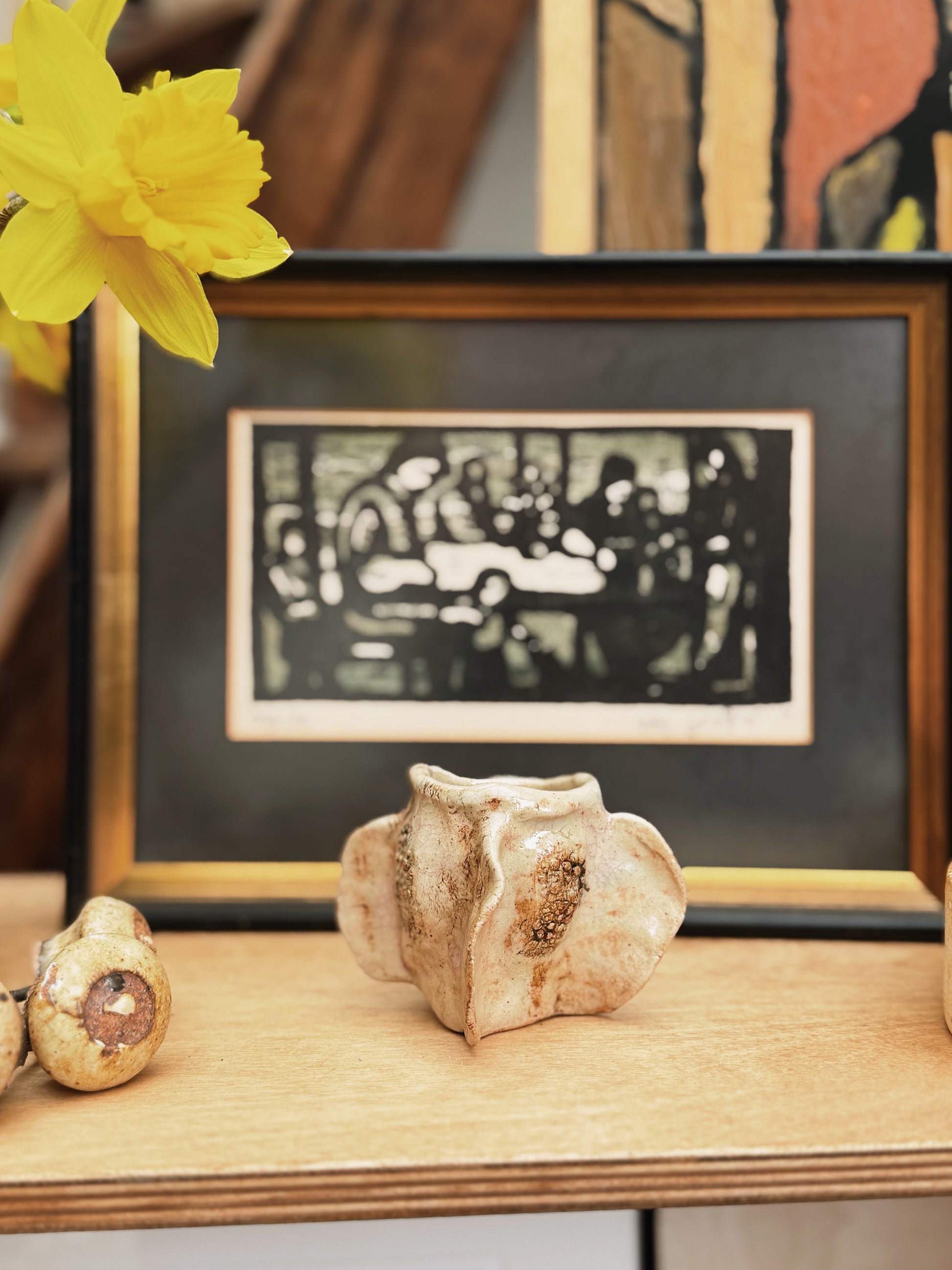 A little pinched vessel with wings, perfect for dispensing a pinch of salt. Signed