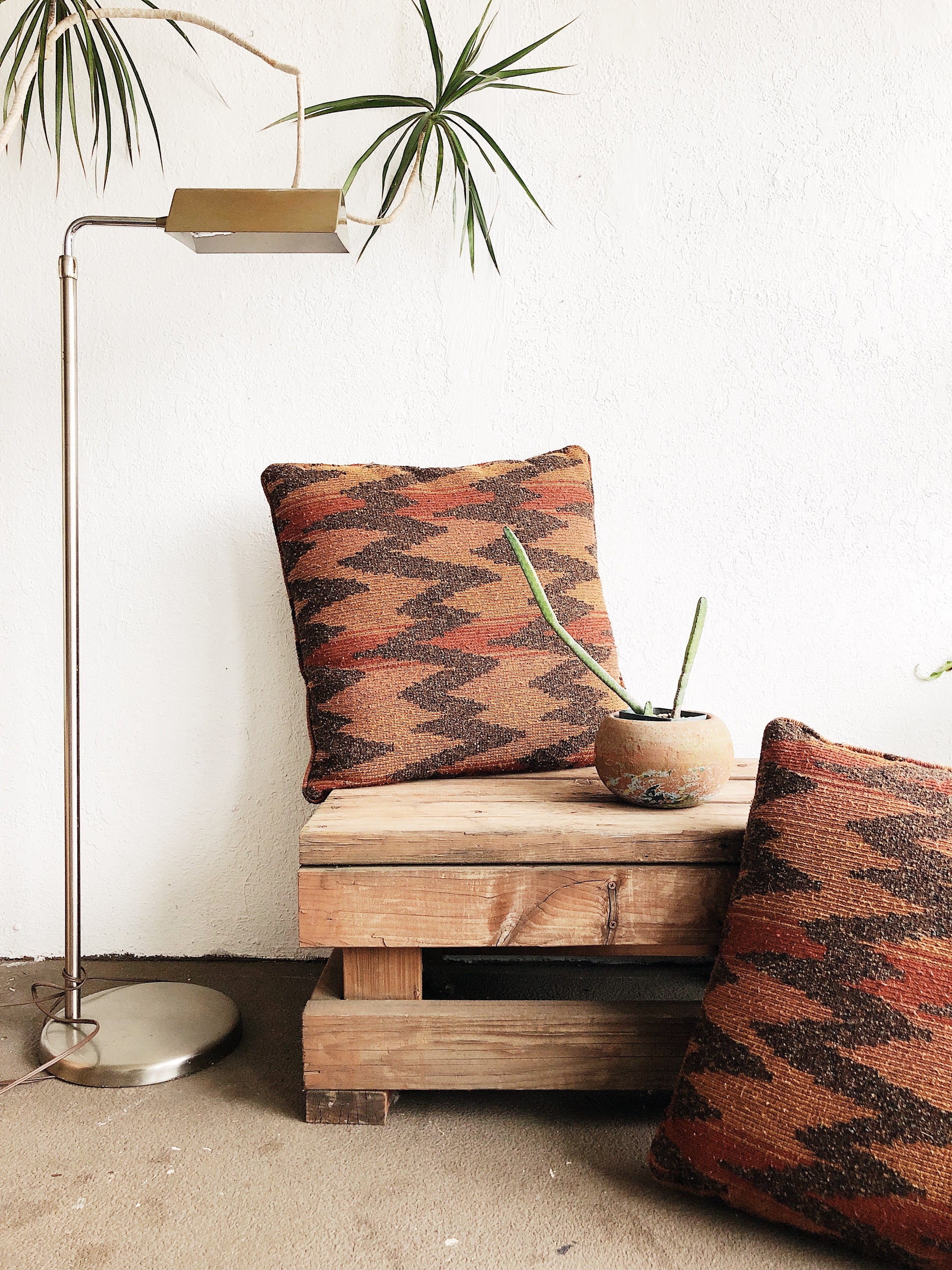 Chunky and super solid. Great old low table handmade. Also functions sturdily as a bench to sit on