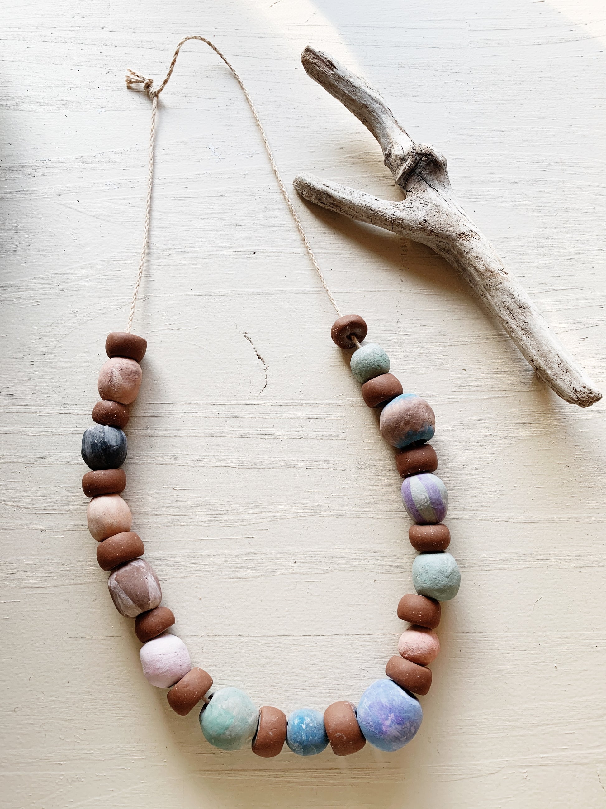 Wonderful handmade clay bead necklace. Chunky watercolor painted beads. Chalky matte finish, desert tones. 27 beads on natural cotton cord.