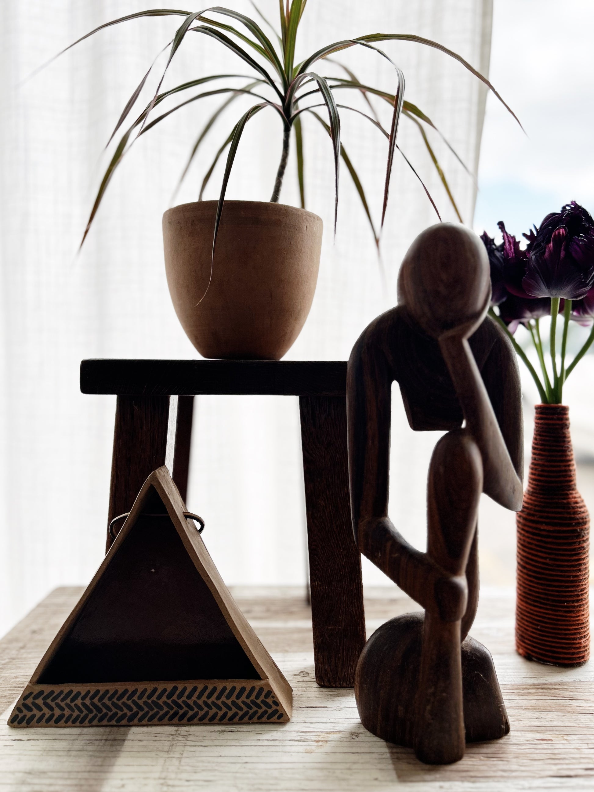A nice looking feeder for small songbirds. Fill the trough with small seeds and watch them perch on the edge. Rawhide hanger