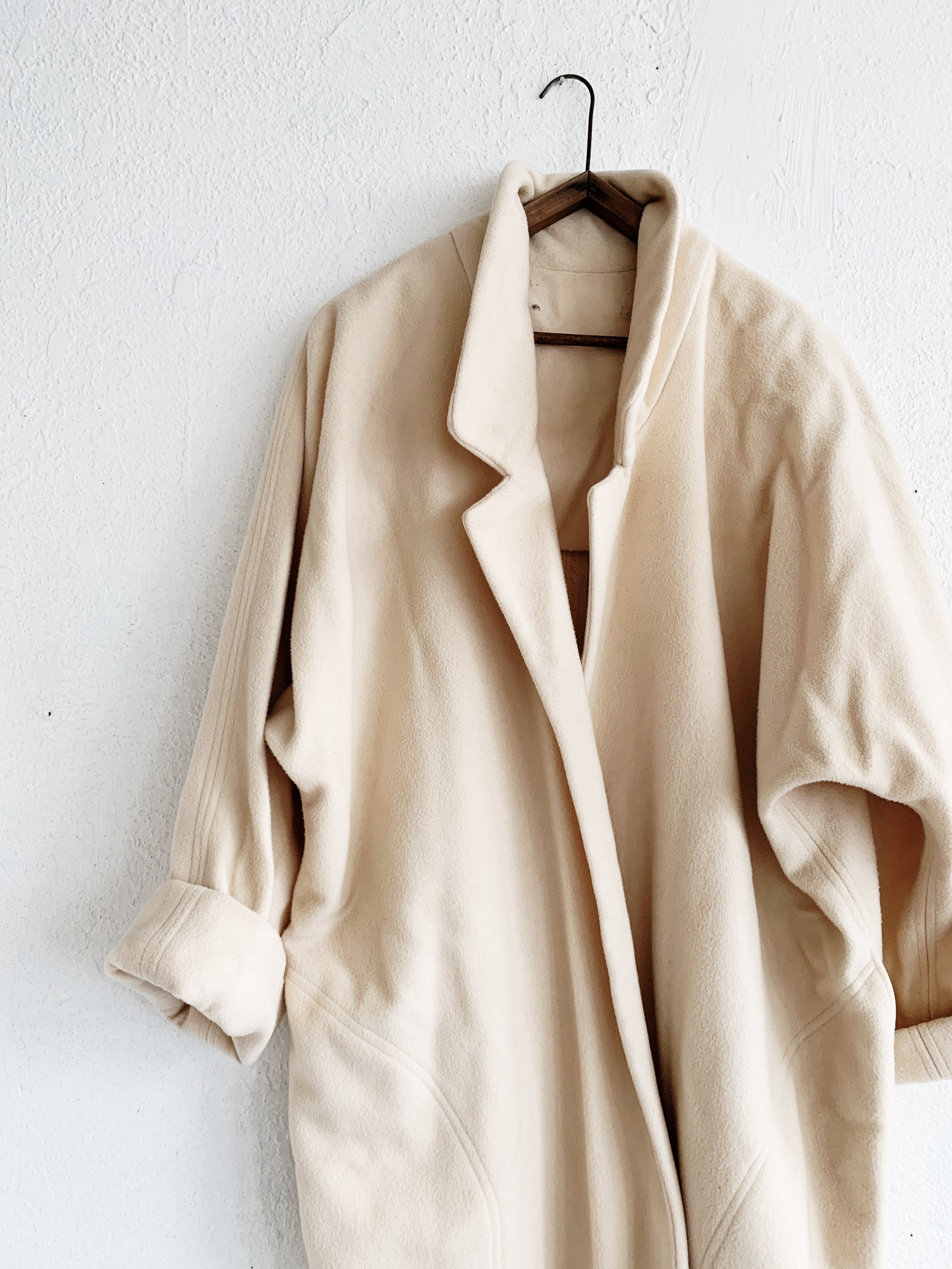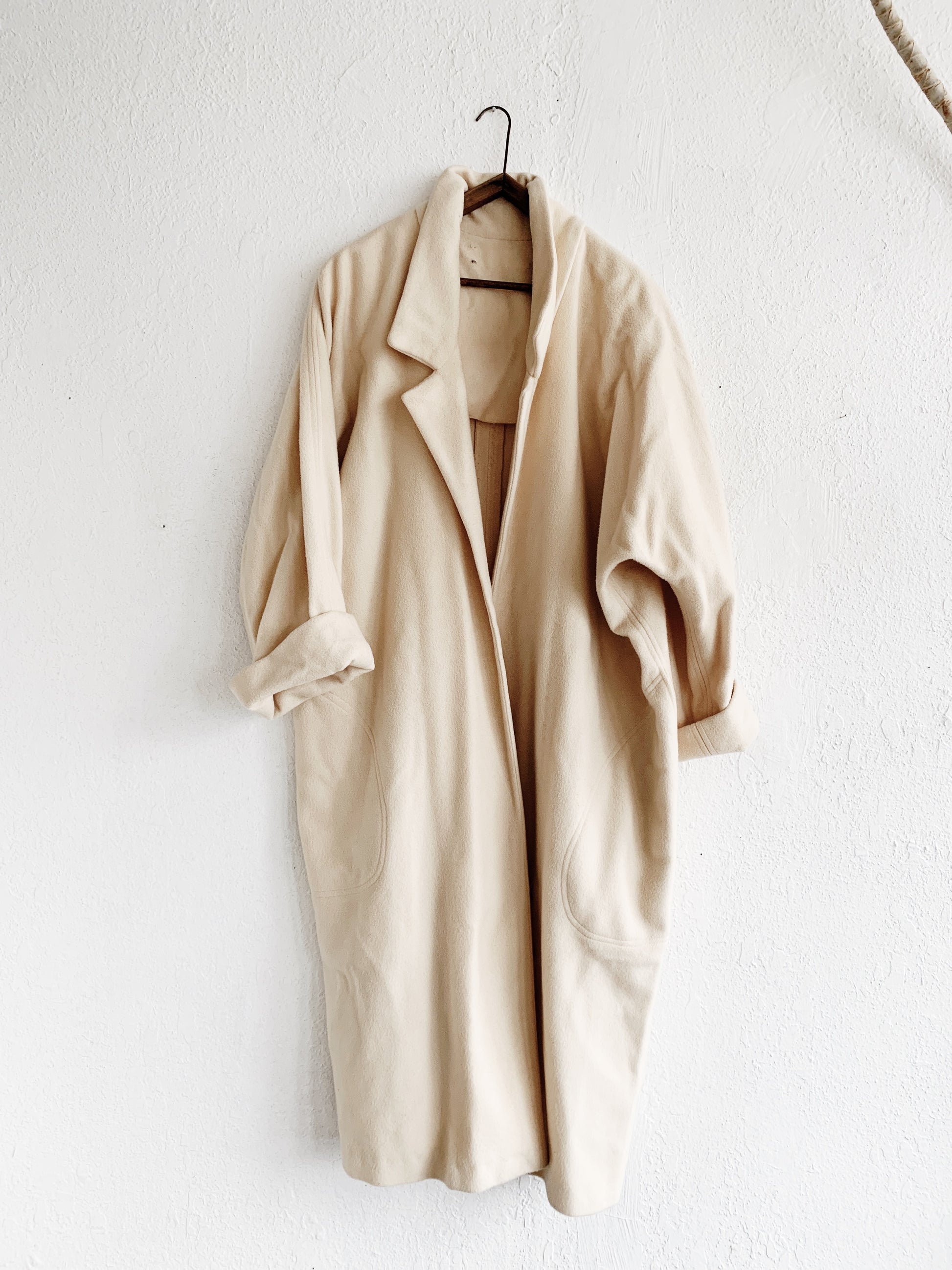 Gorgeous expertly handmade cashmere coat with pockets. This is an oversized, large fit. Best on a medium to tall frame. Cut is like a robe, with long dolman sleeve that cuffs. Beautifully made! In excellent condition