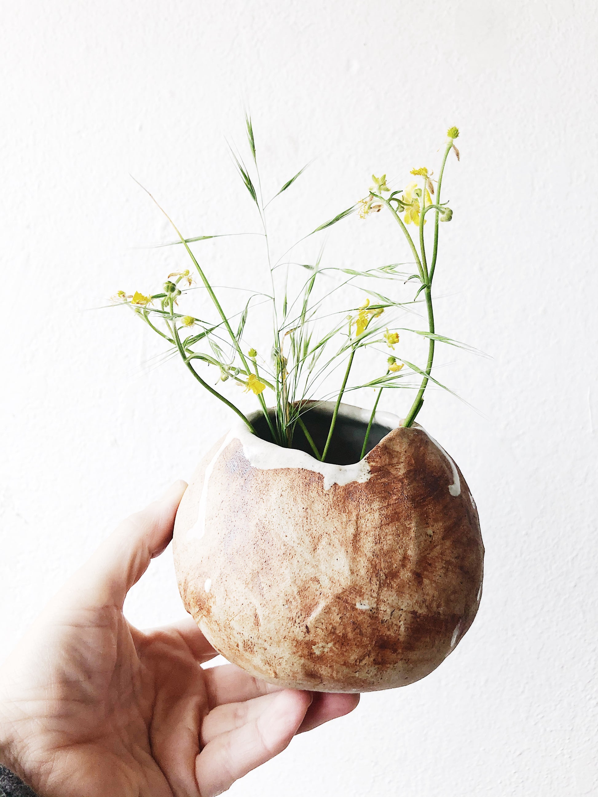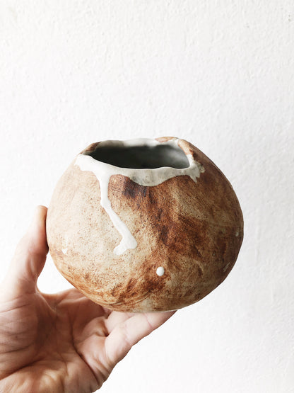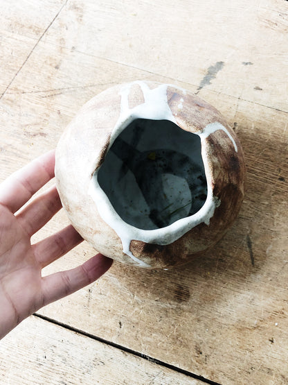 Really pretty glaze and organic shape to this handmade vase. Ochre and white drips. Really lovely. Signed.