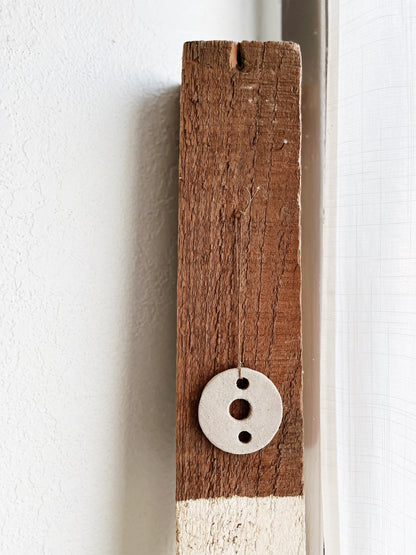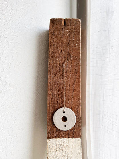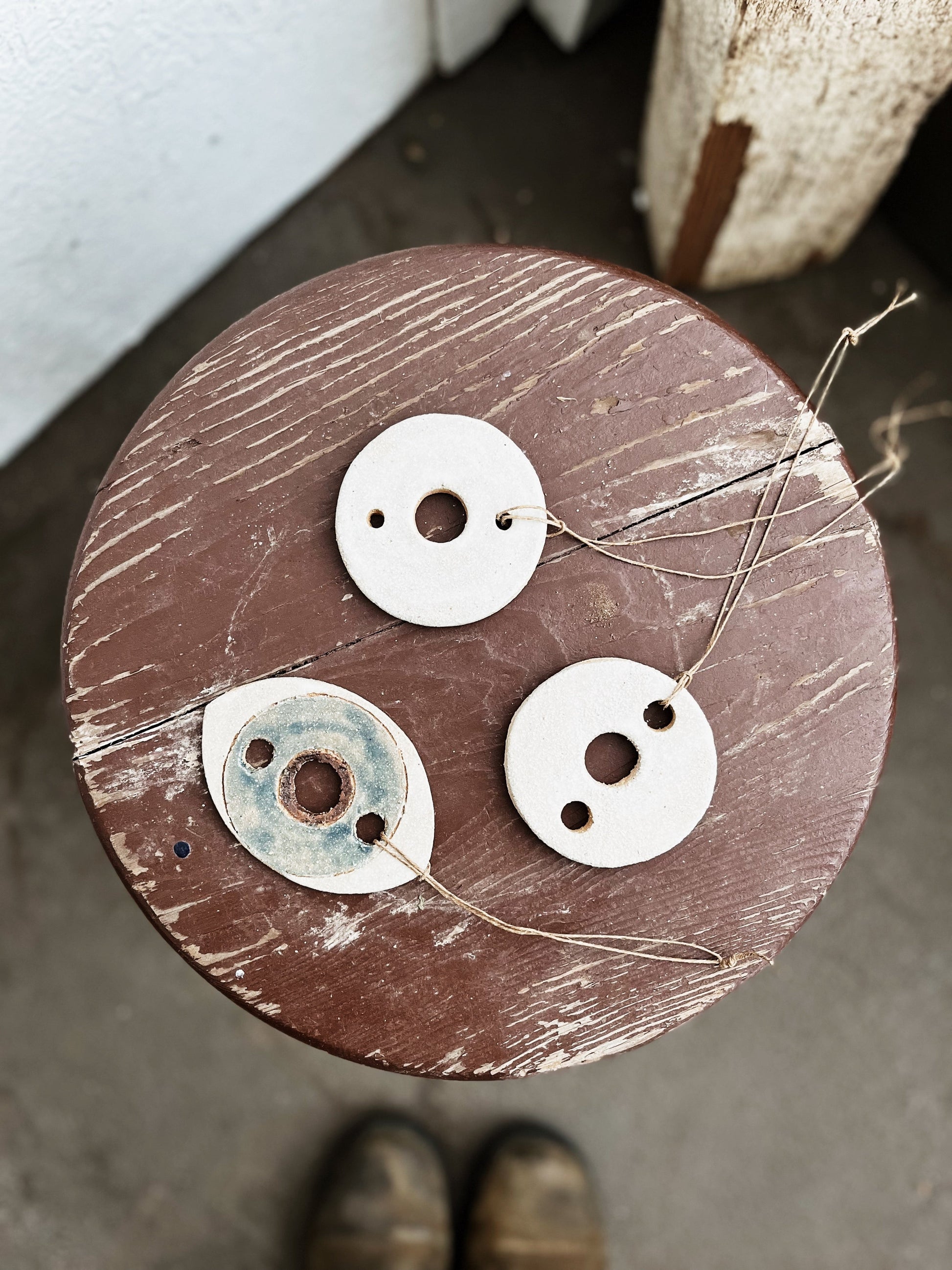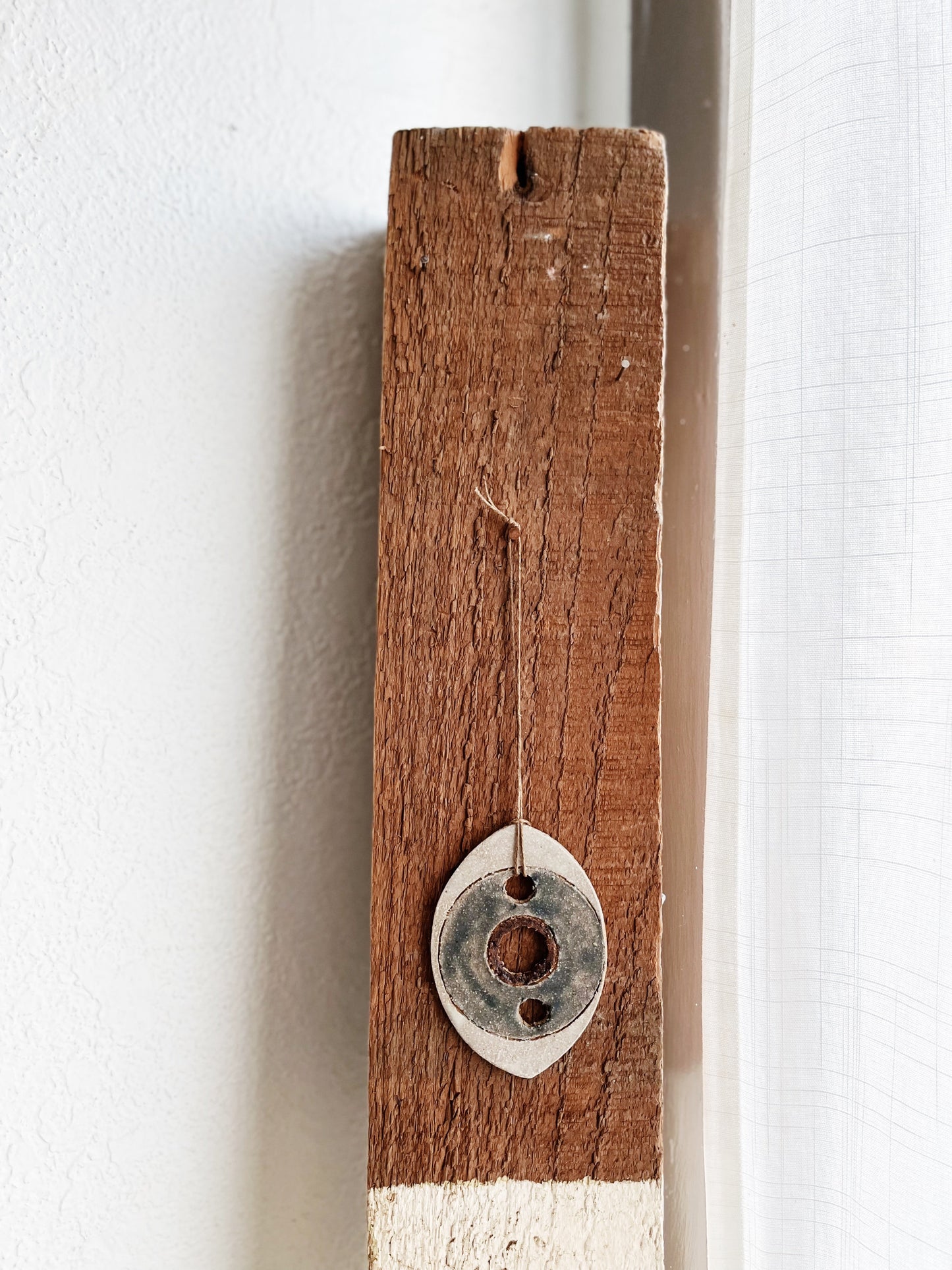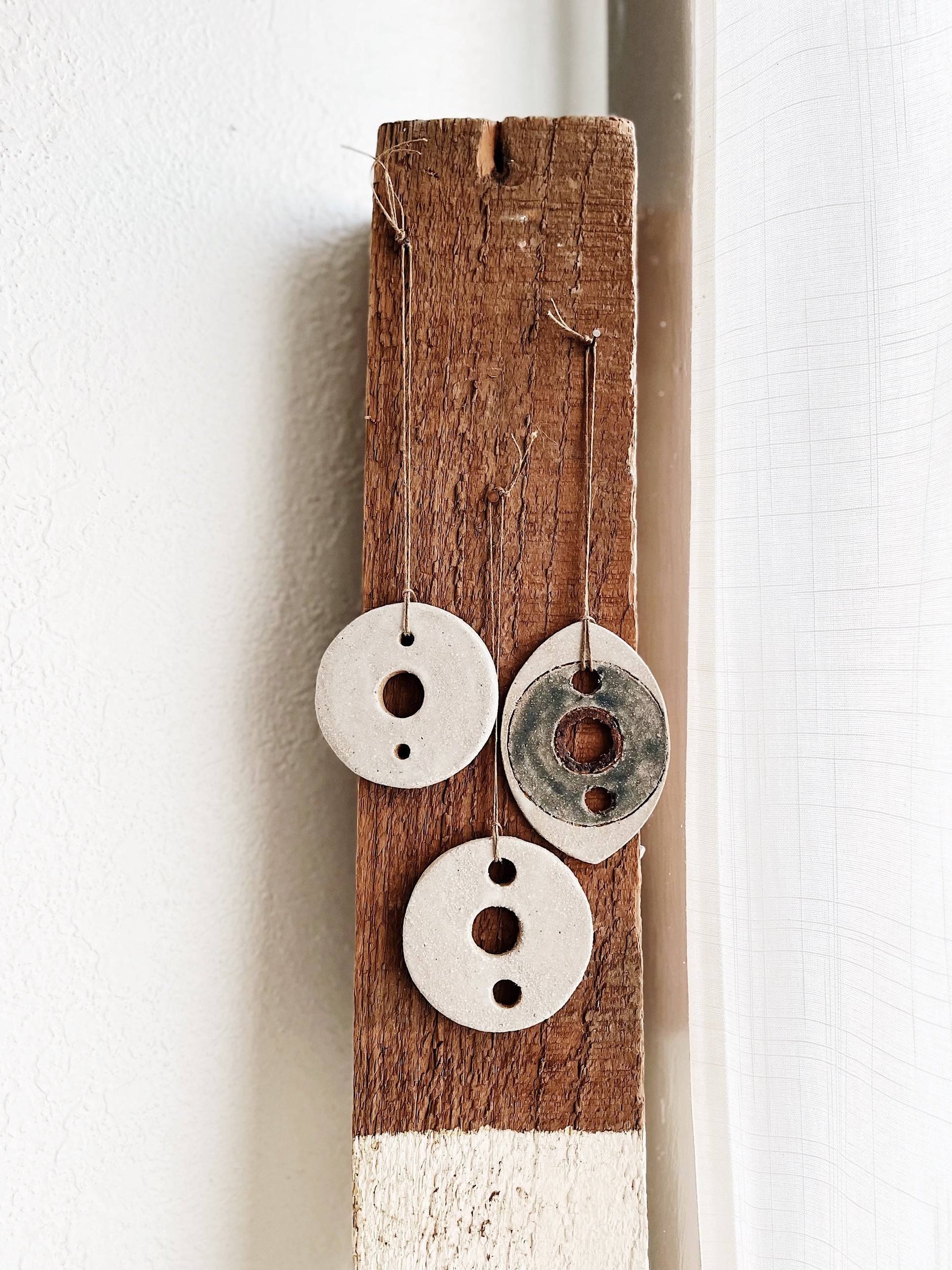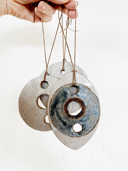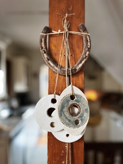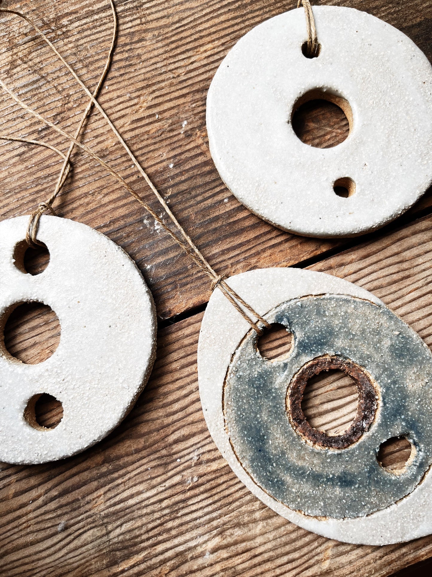 Handmade ceramic amulets that make lovely ornaments. We’ve strung them with old waxed Japanese fishing line