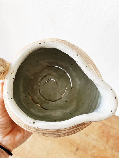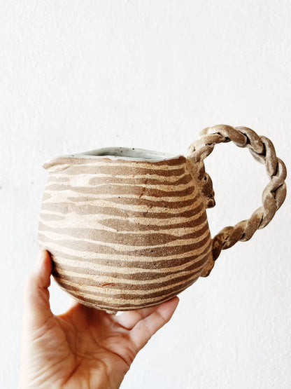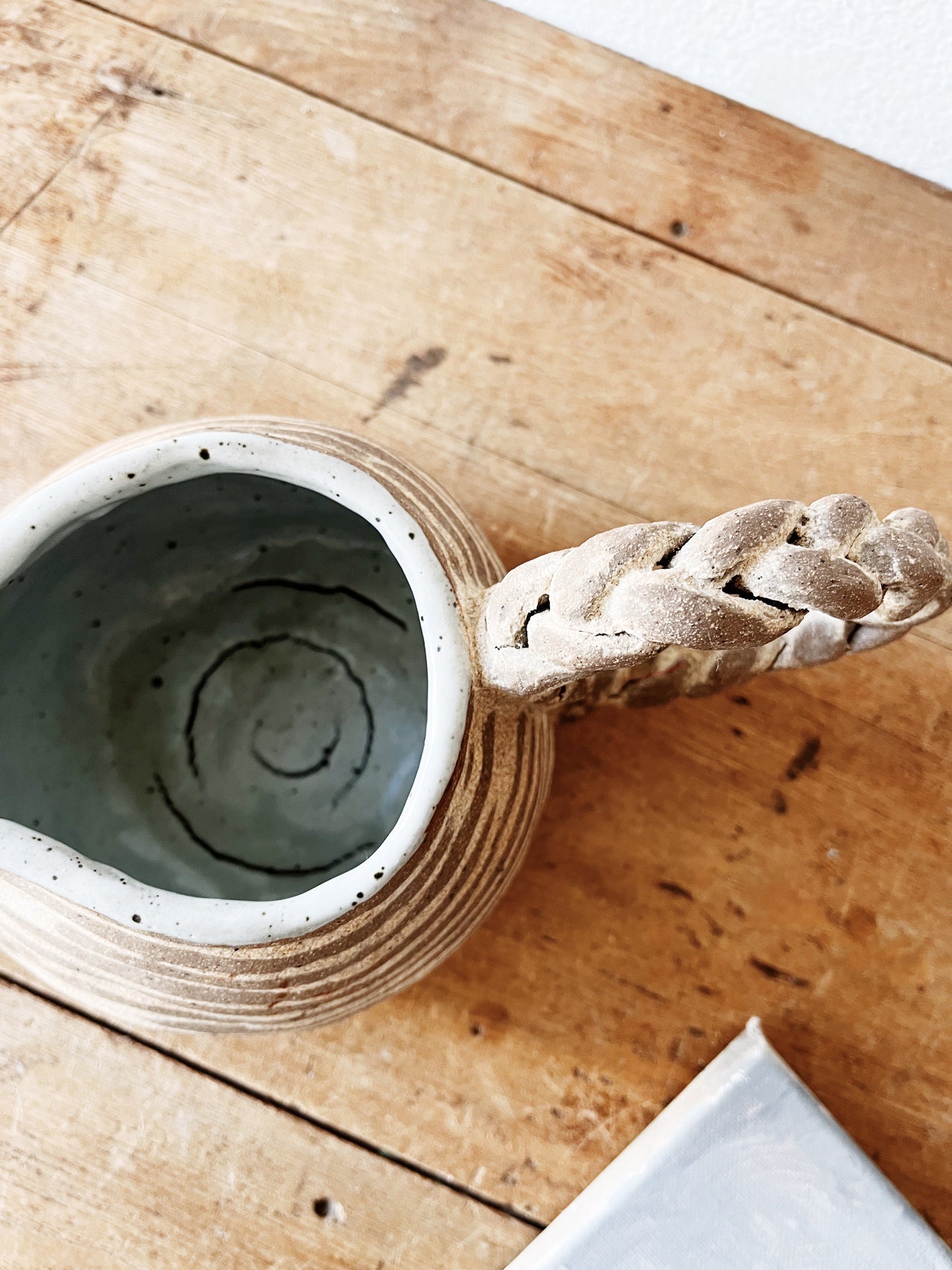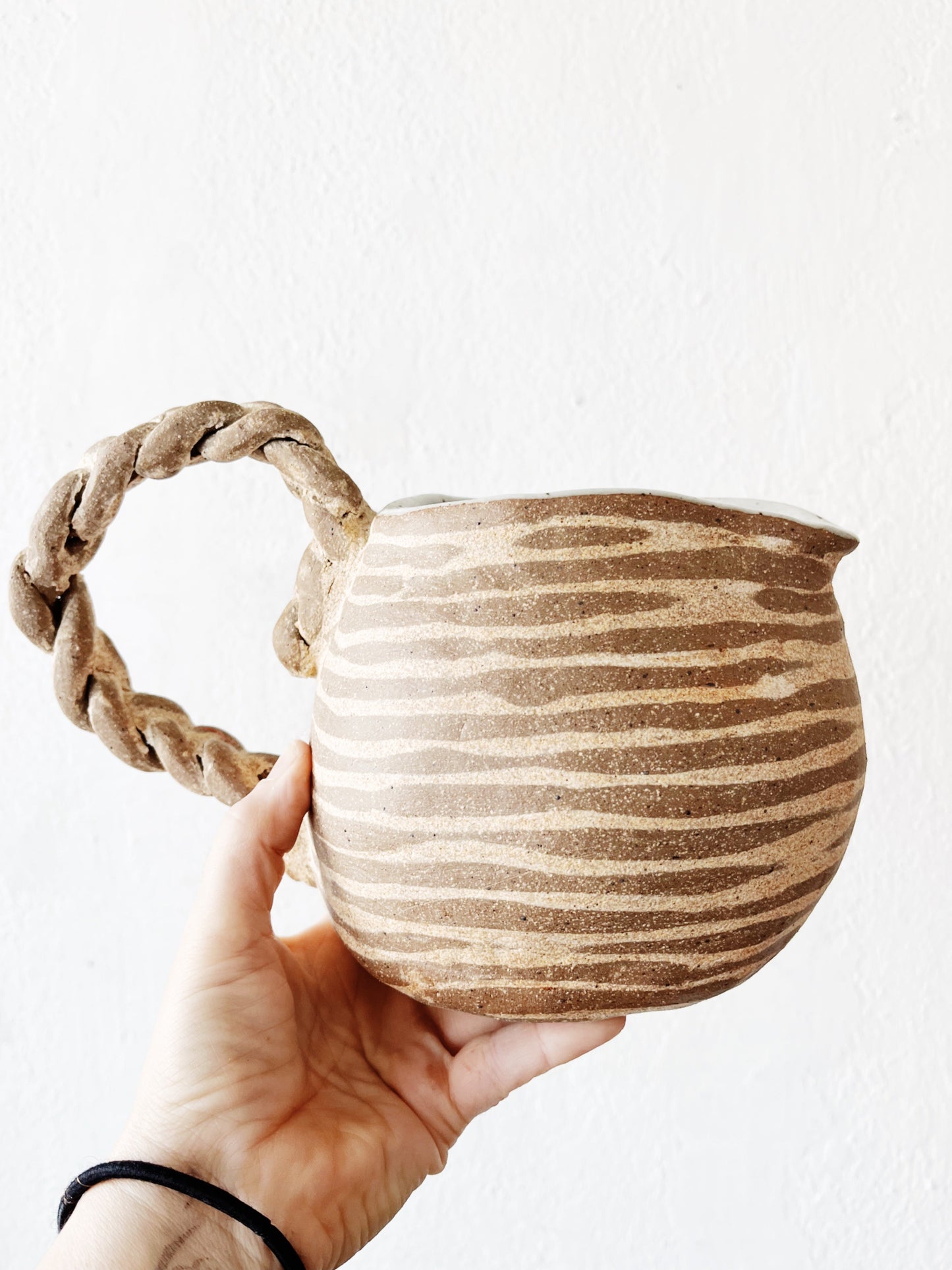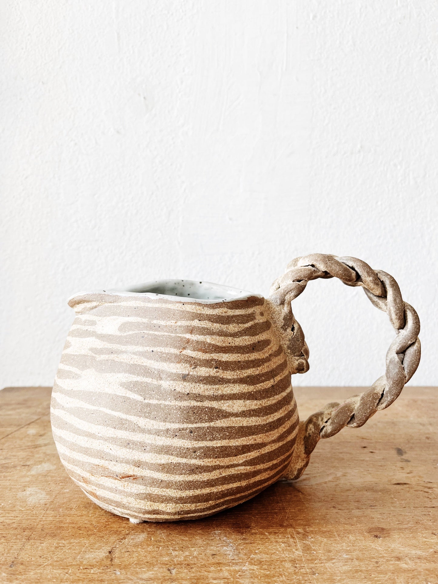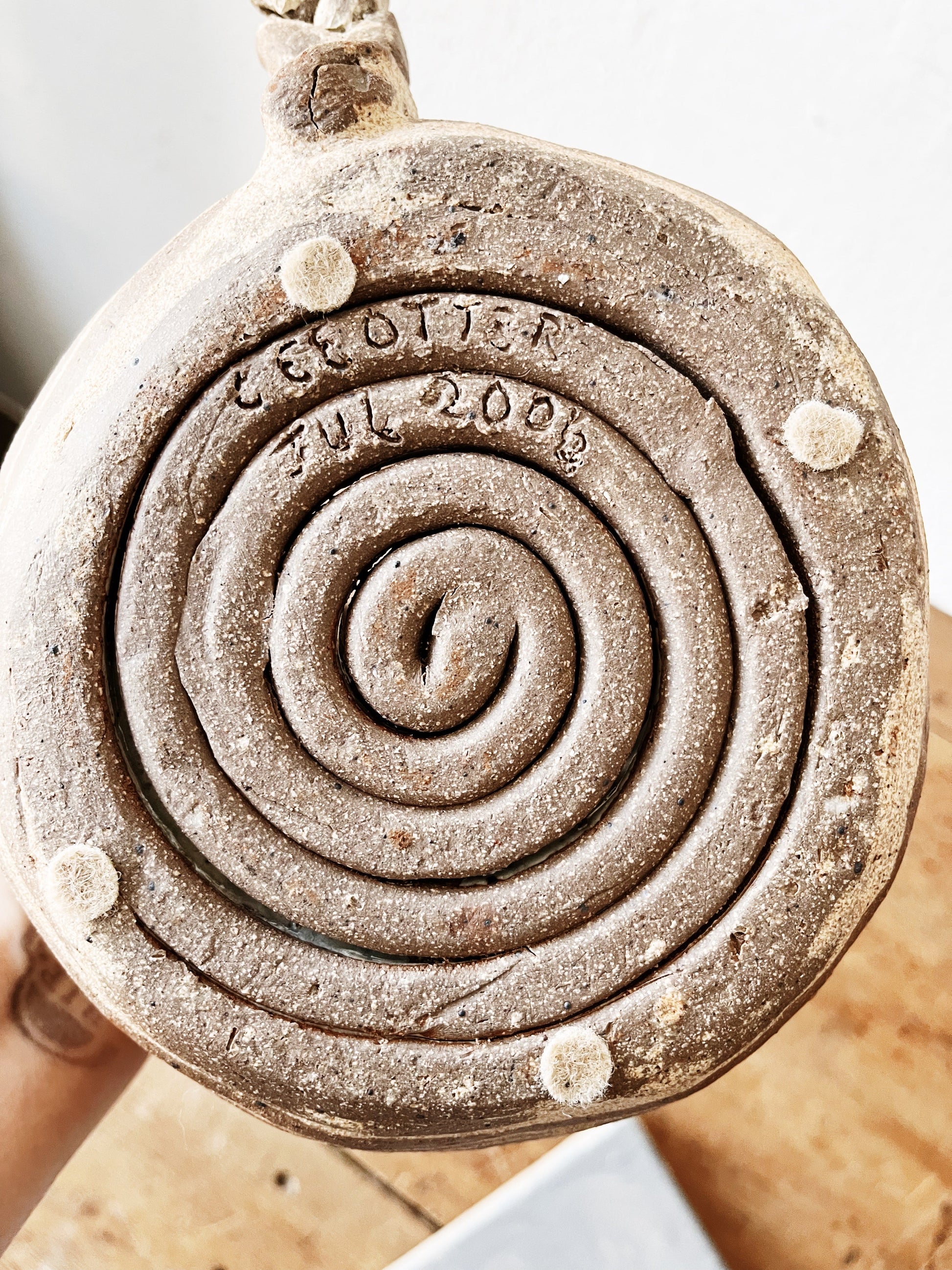 Nicely made vase with coil construction. Matte clay in a striped pattern. Braided handle is a great detail. This vessel won’t hold water but will hold dried blooms quite well. Insert a glass and voila! A vase for live flowers