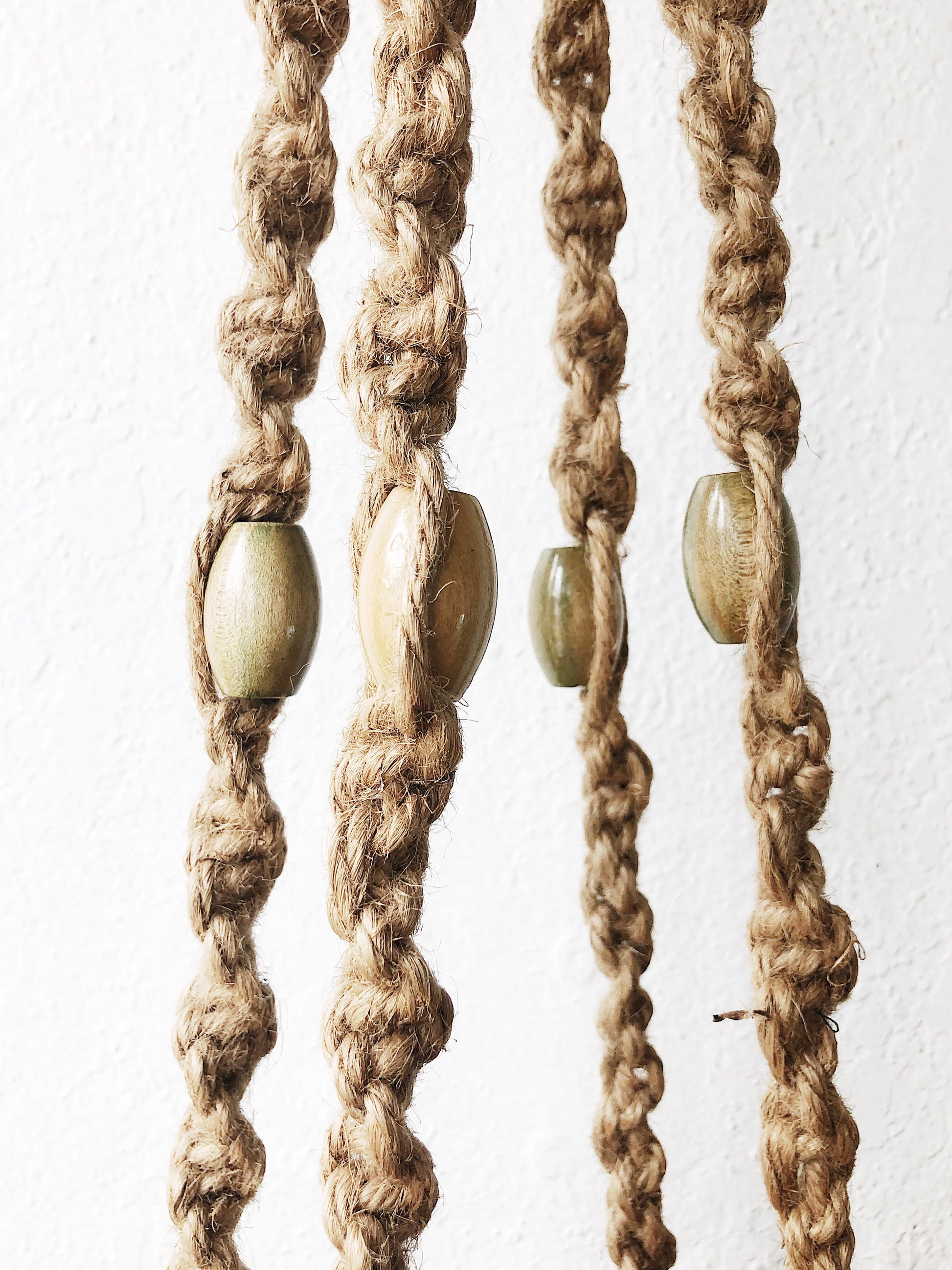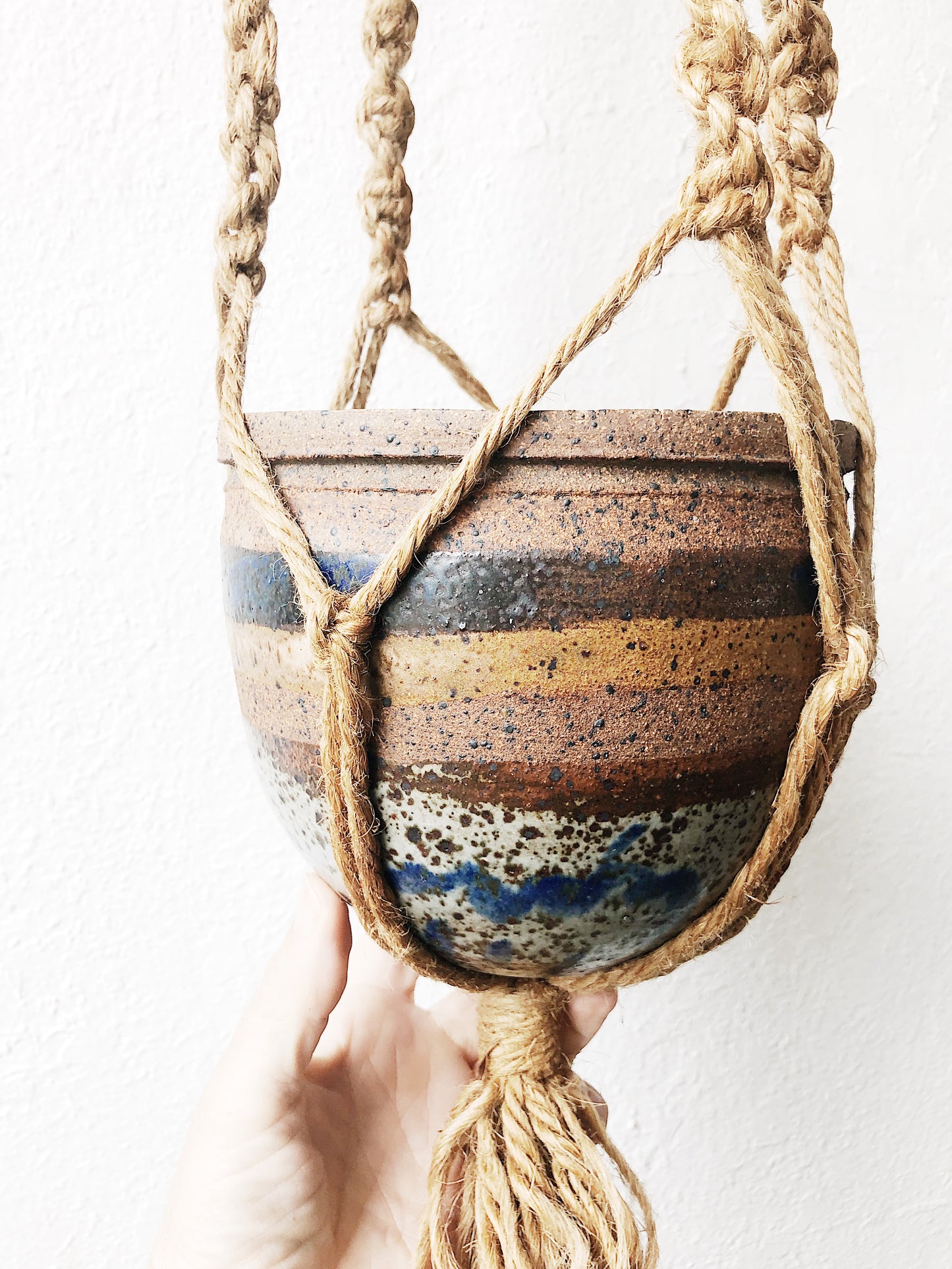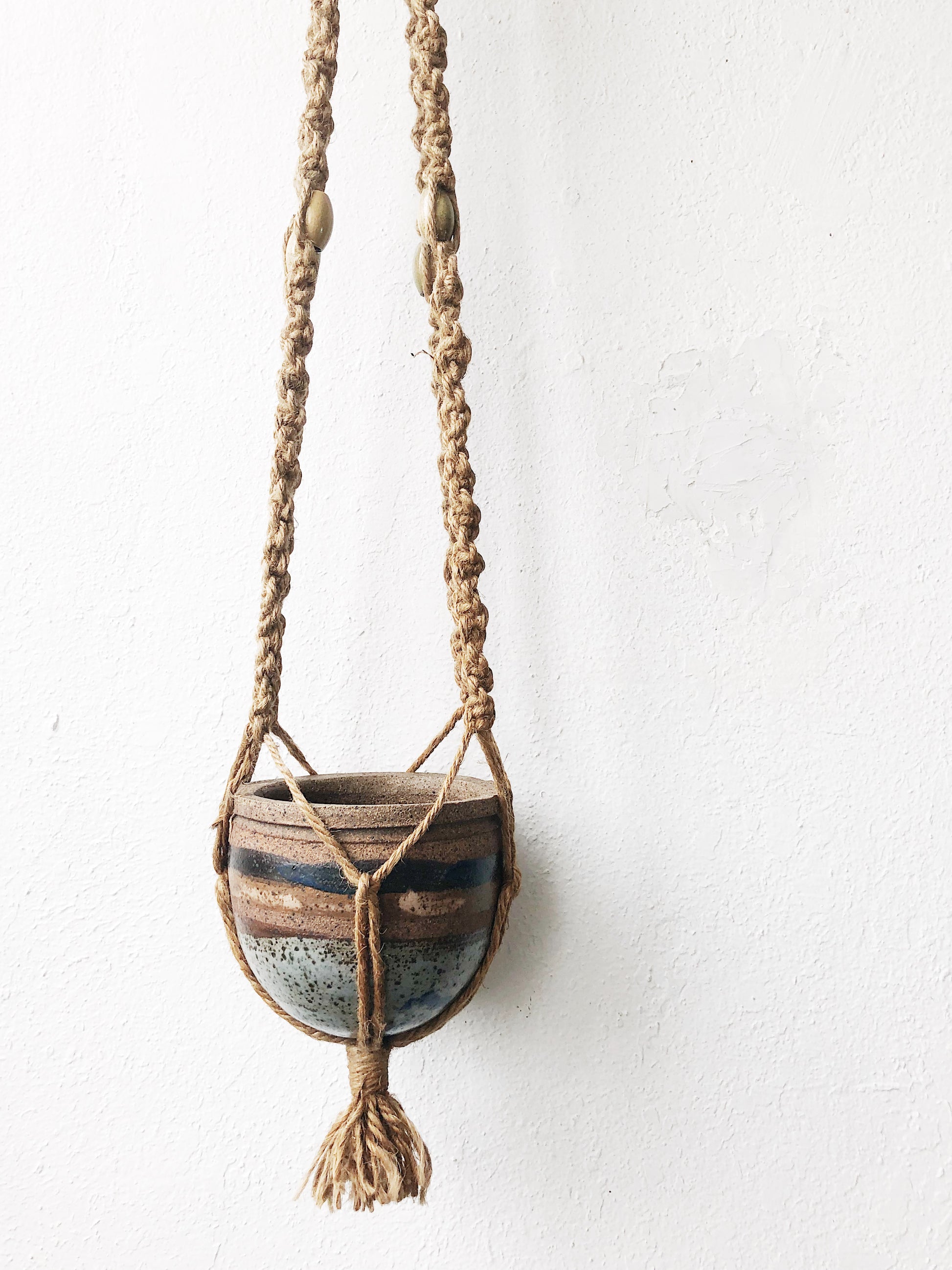 Glaze heaven! Thick stoneware planter hangs inside jute macrame with wood beads. Notice the bird underneath. The whole thing is a vision.