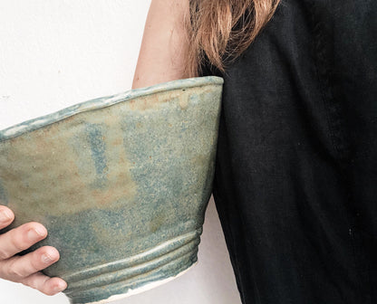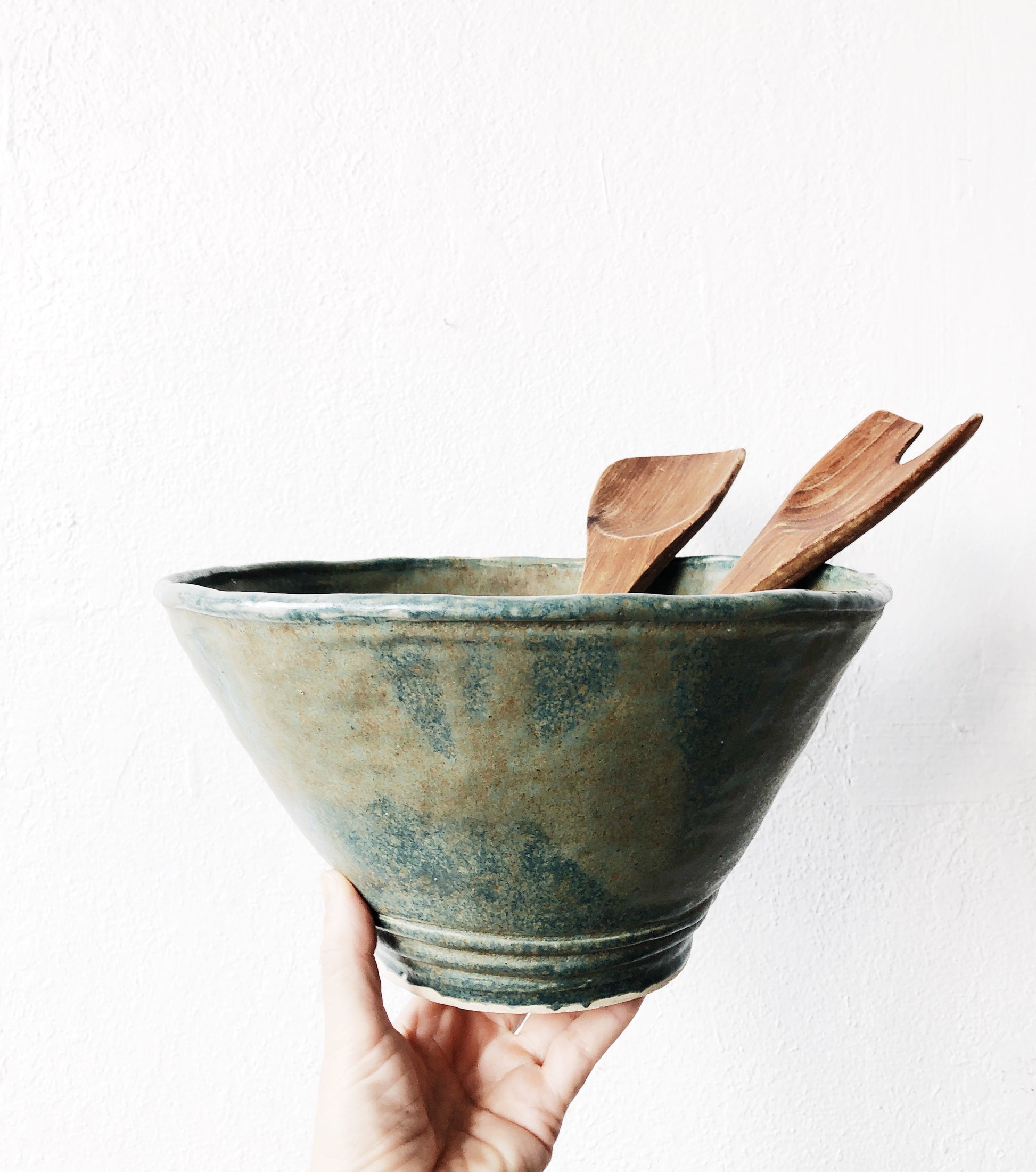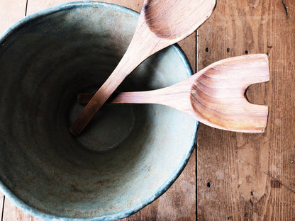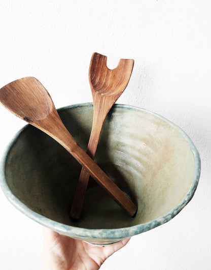 A handmade ceramic salad bowl with vintage teak Servers. Lovely glaze to the bowl and tone to the wood utensils