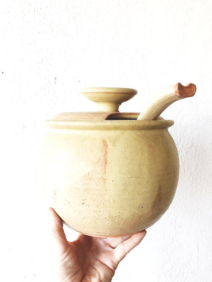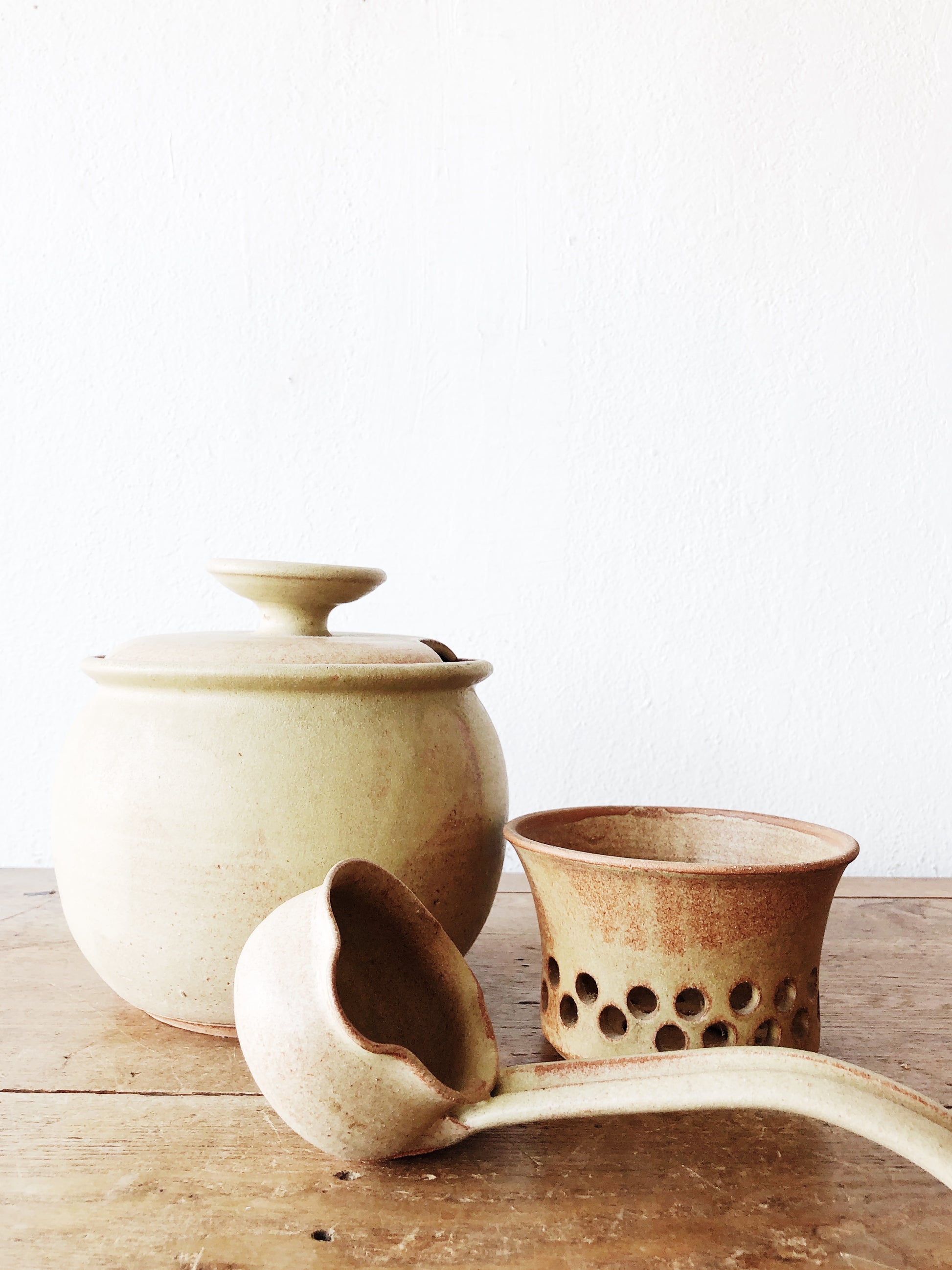Beautifully made tureen with ladle. We love it’s round shape and fat lid handle. Comes with a colander or strainer bowl. Glaze is an earthy ochre and maize color.
