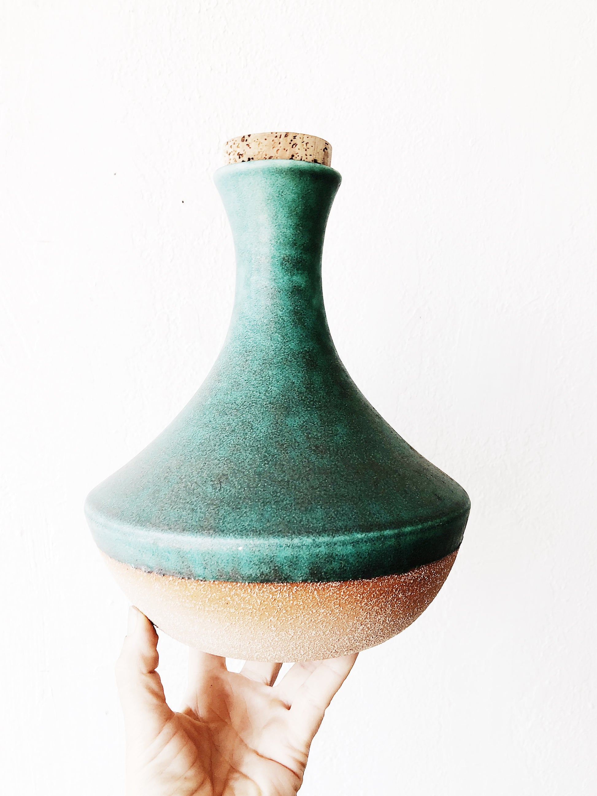 Heavy stoneware decanter in a beautiful turquoise. Combination of matte and unglazed clay. Cork stopper