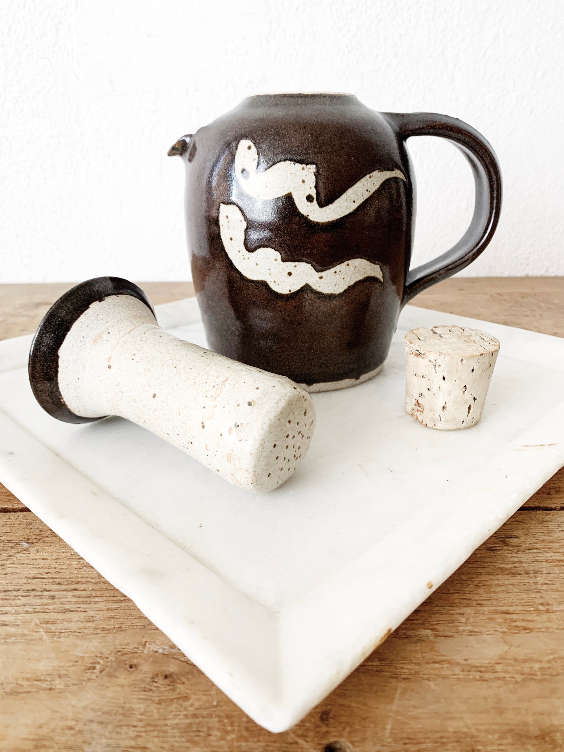Wonderful handmade stoneware tea set. Includes pitcher, strainer insert and cork stopper. Excellent condition.