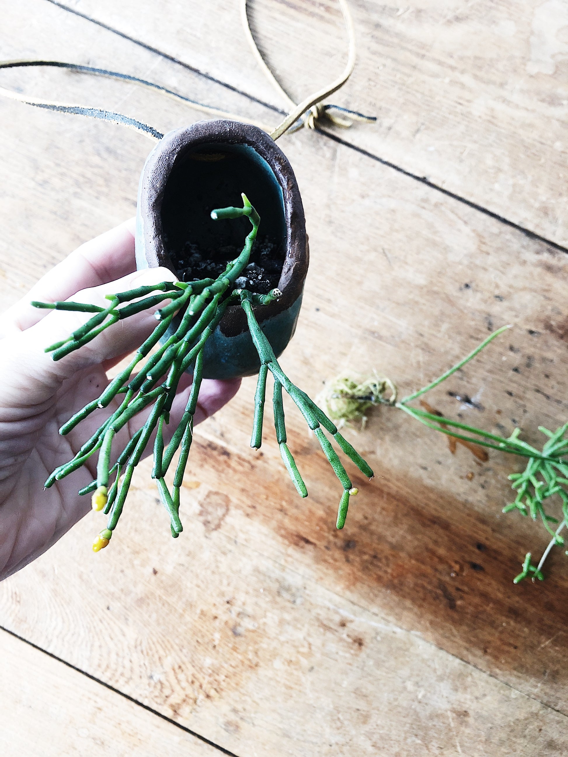A small pod shaped planter made of hand formed clay. Tiny drainage hole and leather hanger