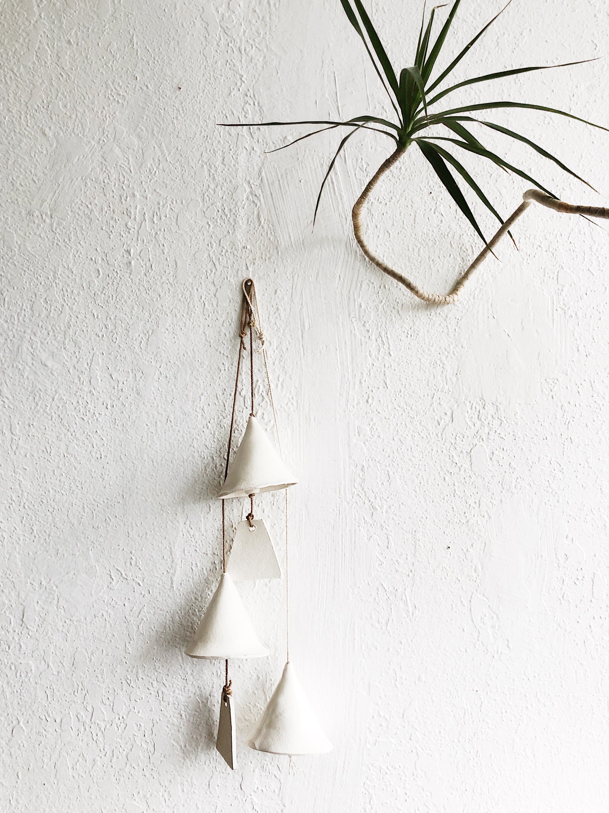 Beautiful subtly textured white clay chime. Lovely delicate shape. Hangs from cotton twine