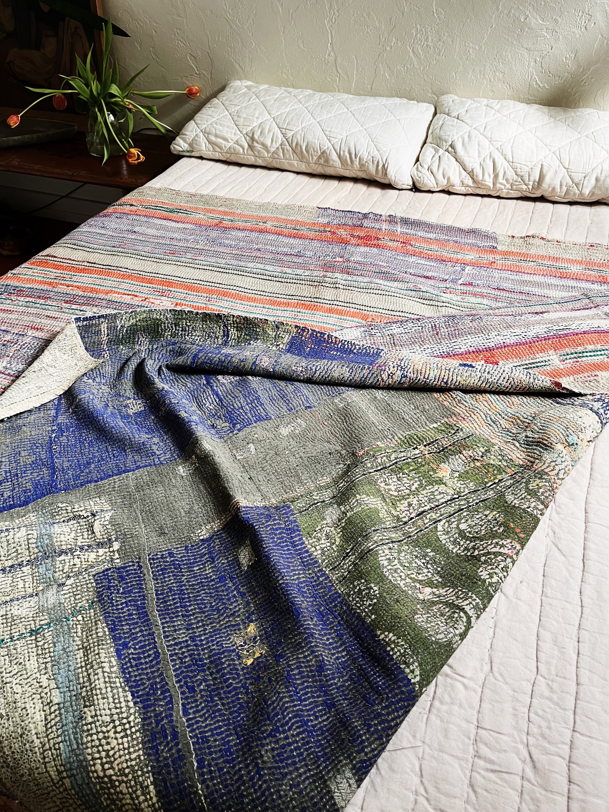 Another beautiful vintage cotton kantha quilt! This one is patchworked from the best parts of very old and newer quilts. Fun color blocked, mid weight and super soft. Many quilts in one depending how you fold it.