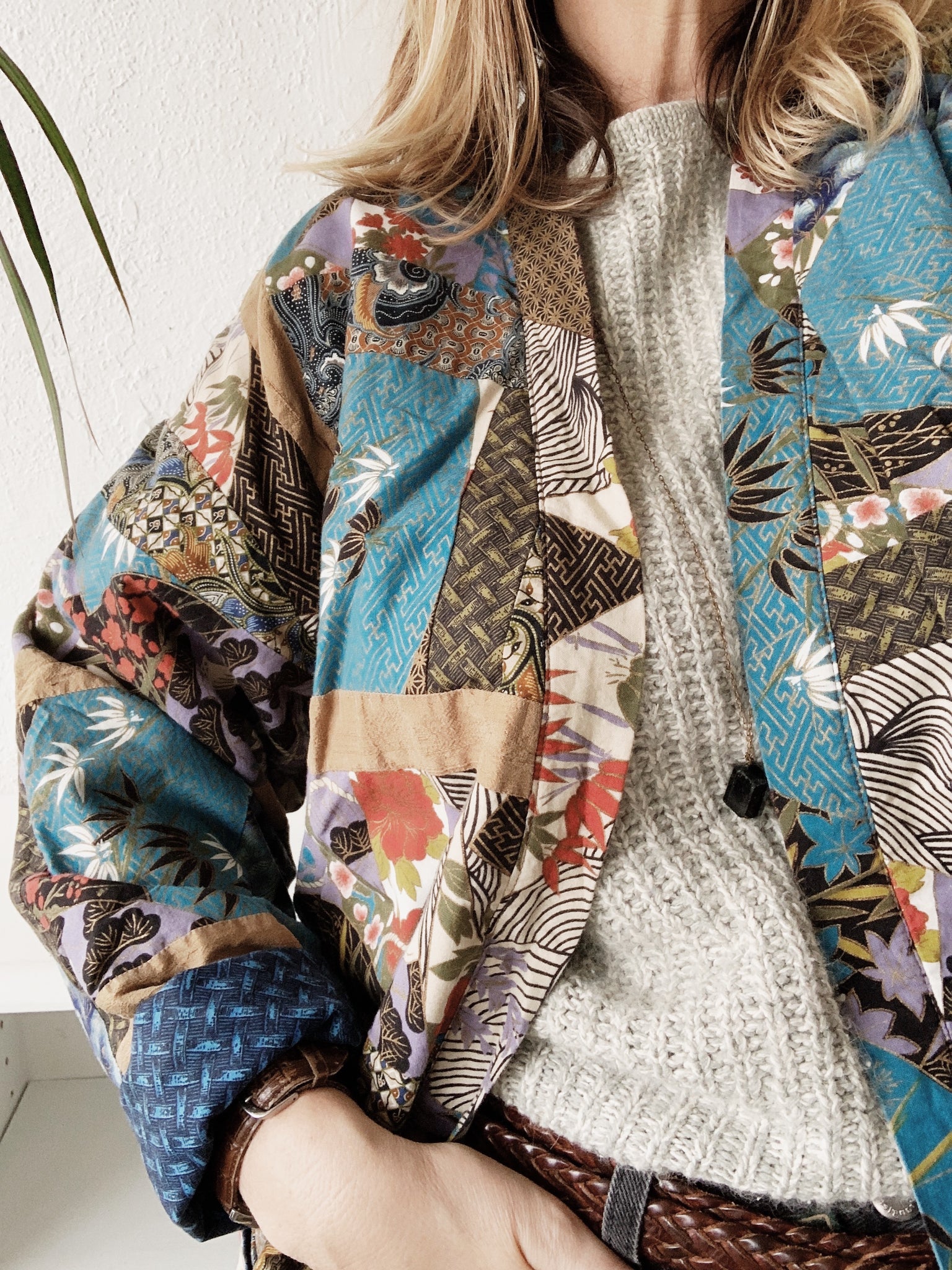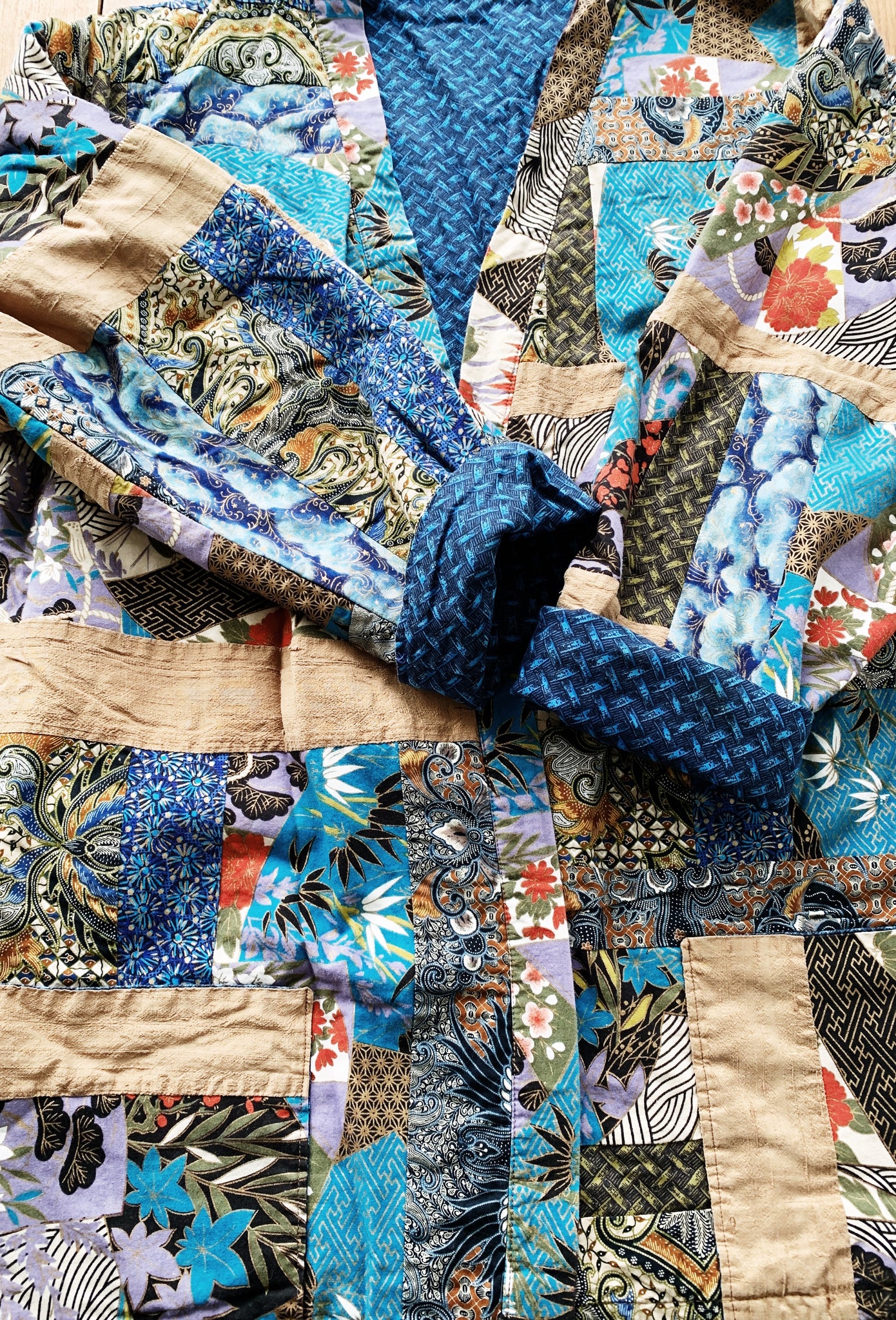 Gorgeous handmade cotton kimono jacket that’s reversible! Really beautiful. Colorful patchwork batik fabric on one side and indigo basket weave on the other. Pockets on the patchwork side.