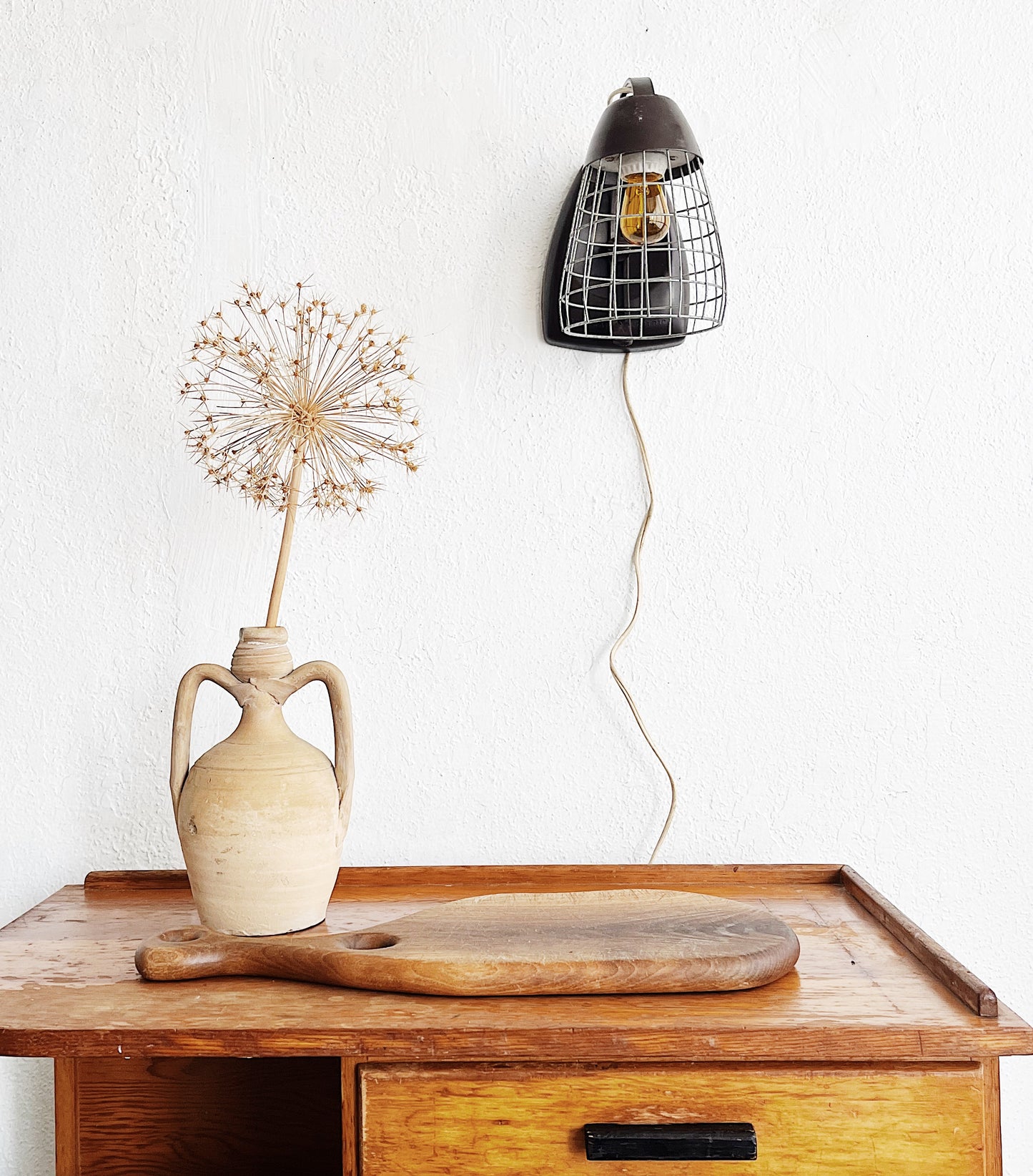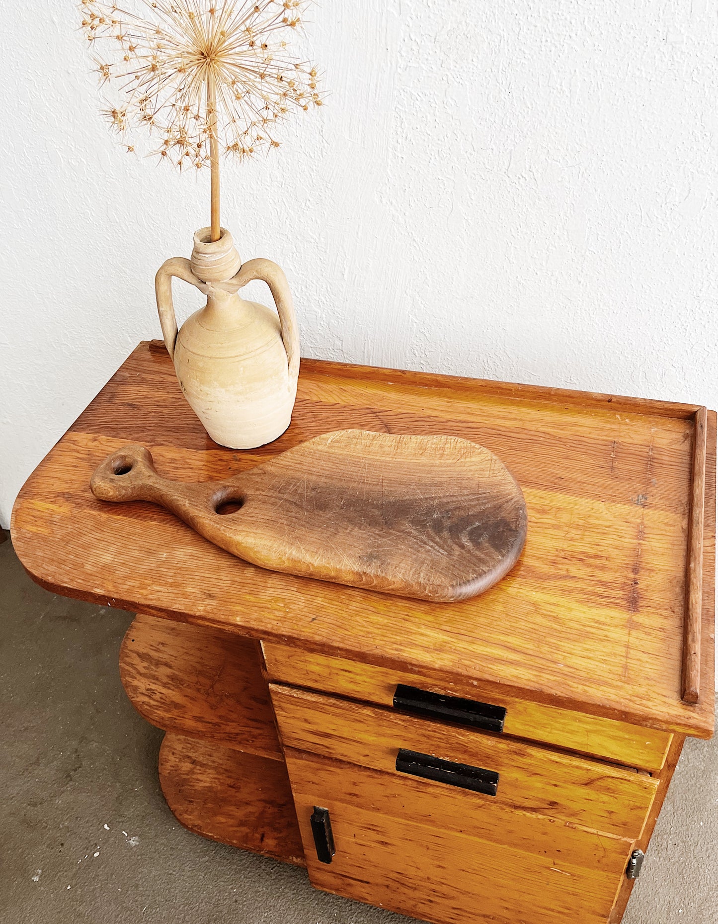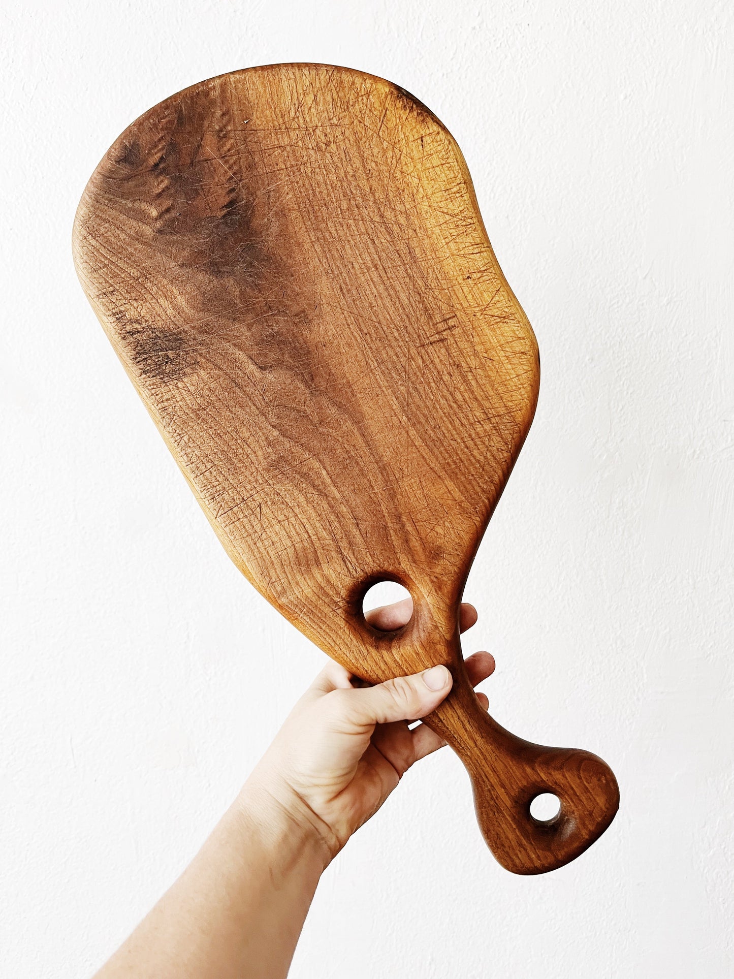 A lovely handmade board, smoothed with age. Would make a great cheese board display. Handle for hanging on a hook