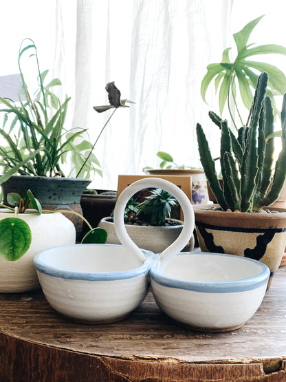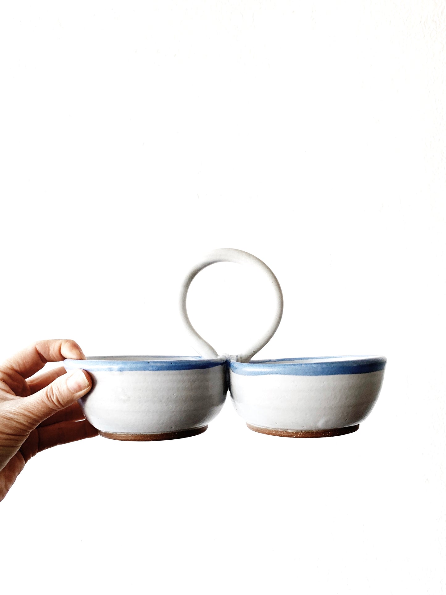 Fantastic Vintage handmade pottery double dish with handle. Several use: Great for pistachios! Or other snacks. OR use as a water/food dish for small pet. Or for jewelry, etc, you get the idea ;)