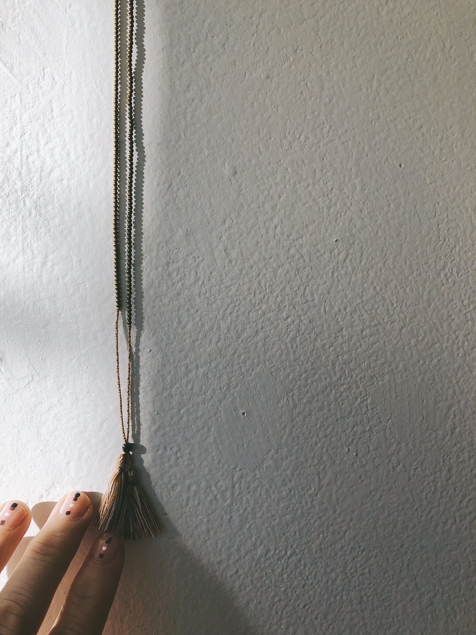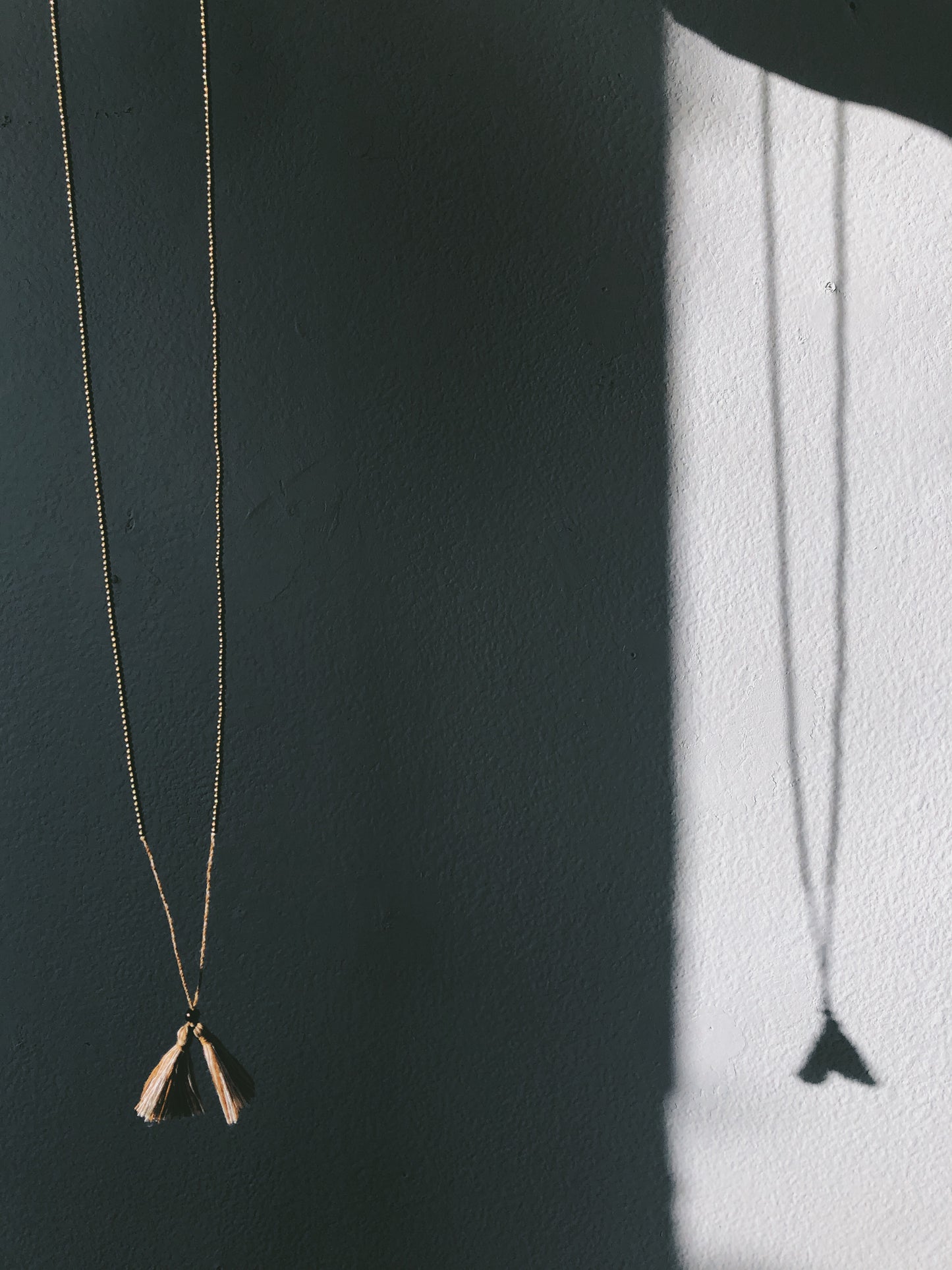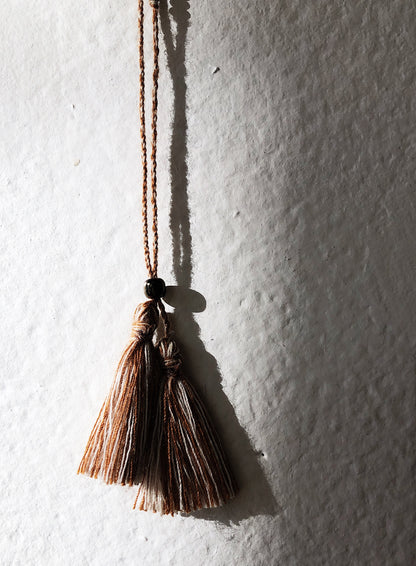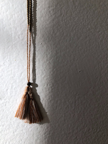 Stunning hand beaded necklace. Silk ochre cord strung with deep brassy glass beads