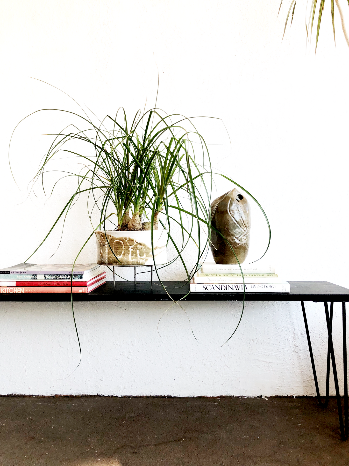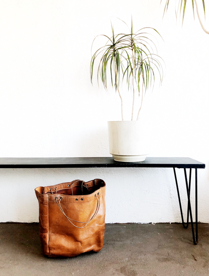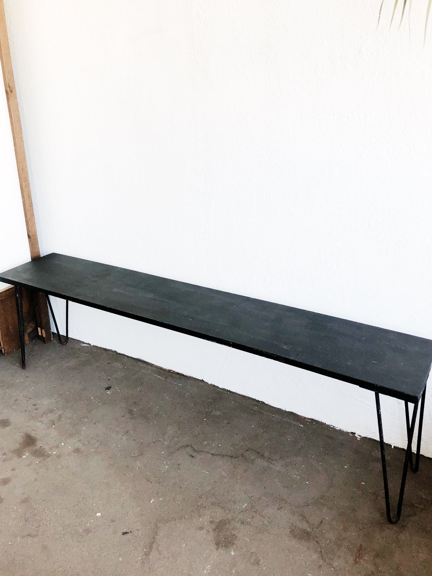 Matte black painted wood seat with mid century hairpin legs. Suited more as a shelf for plants and art books. Would need support for seating