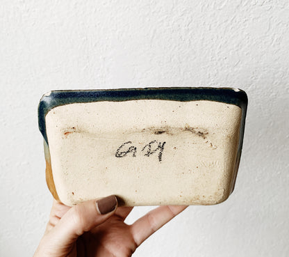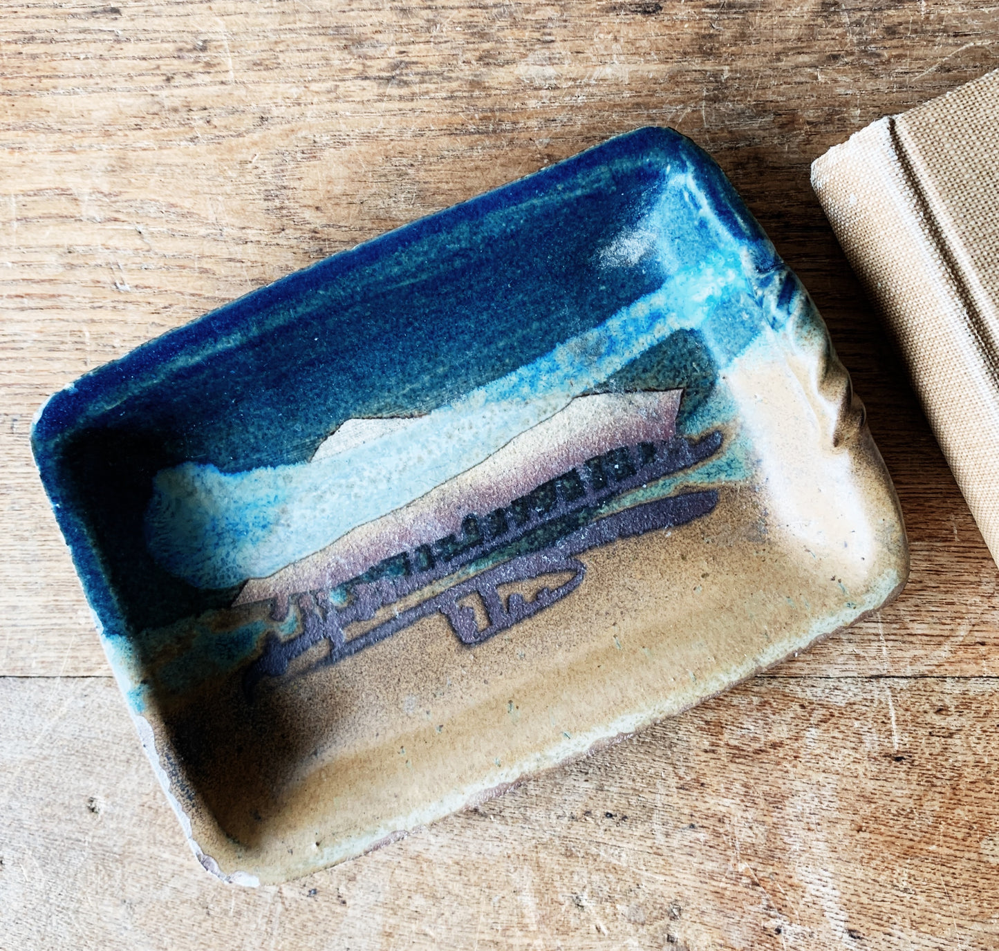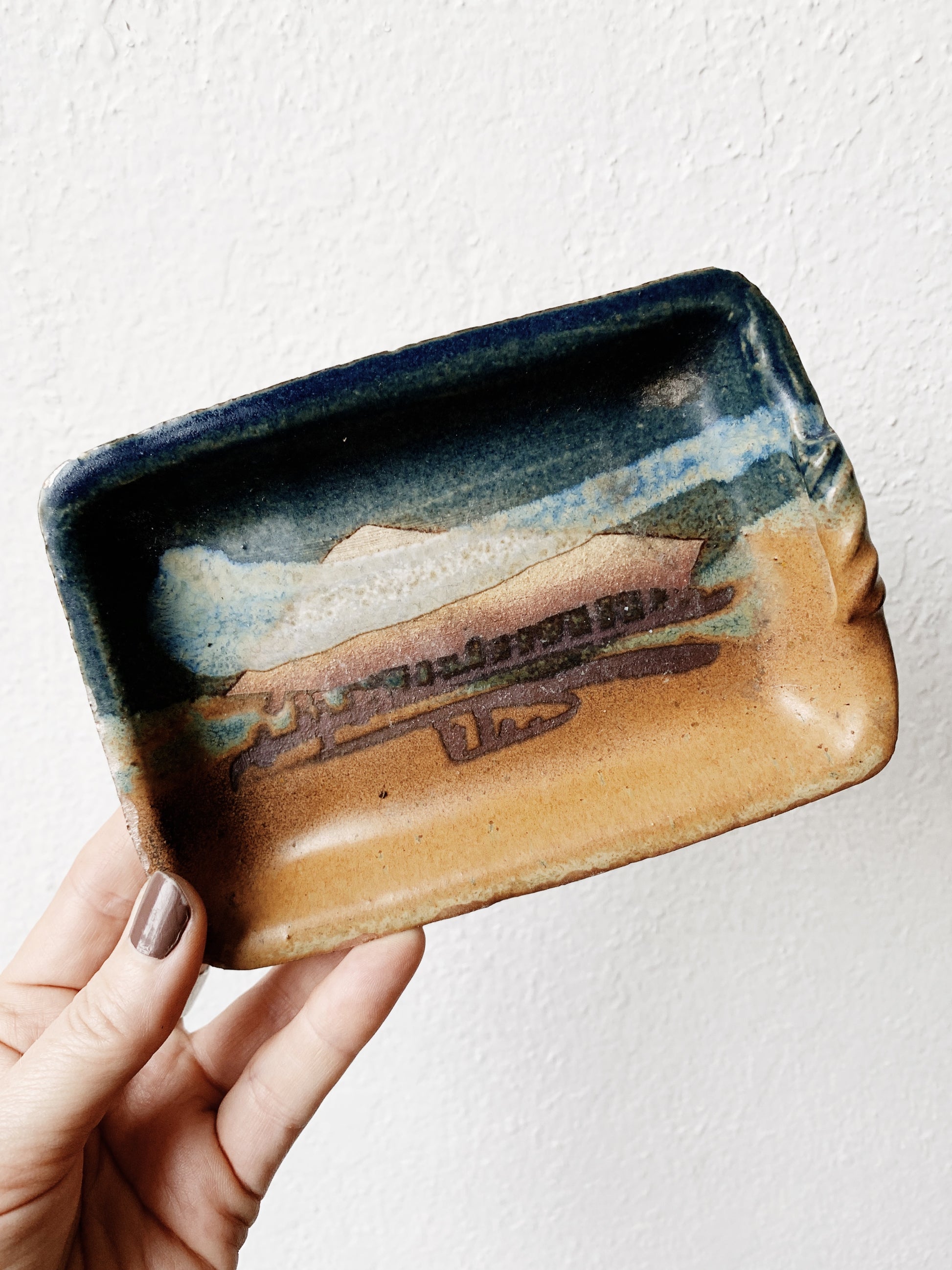 So lovely! Earthy matte glaze, landscape pottery dish. Perfect for jewelry/catchall. A few little chips underside, see pics. fantastic just the same
