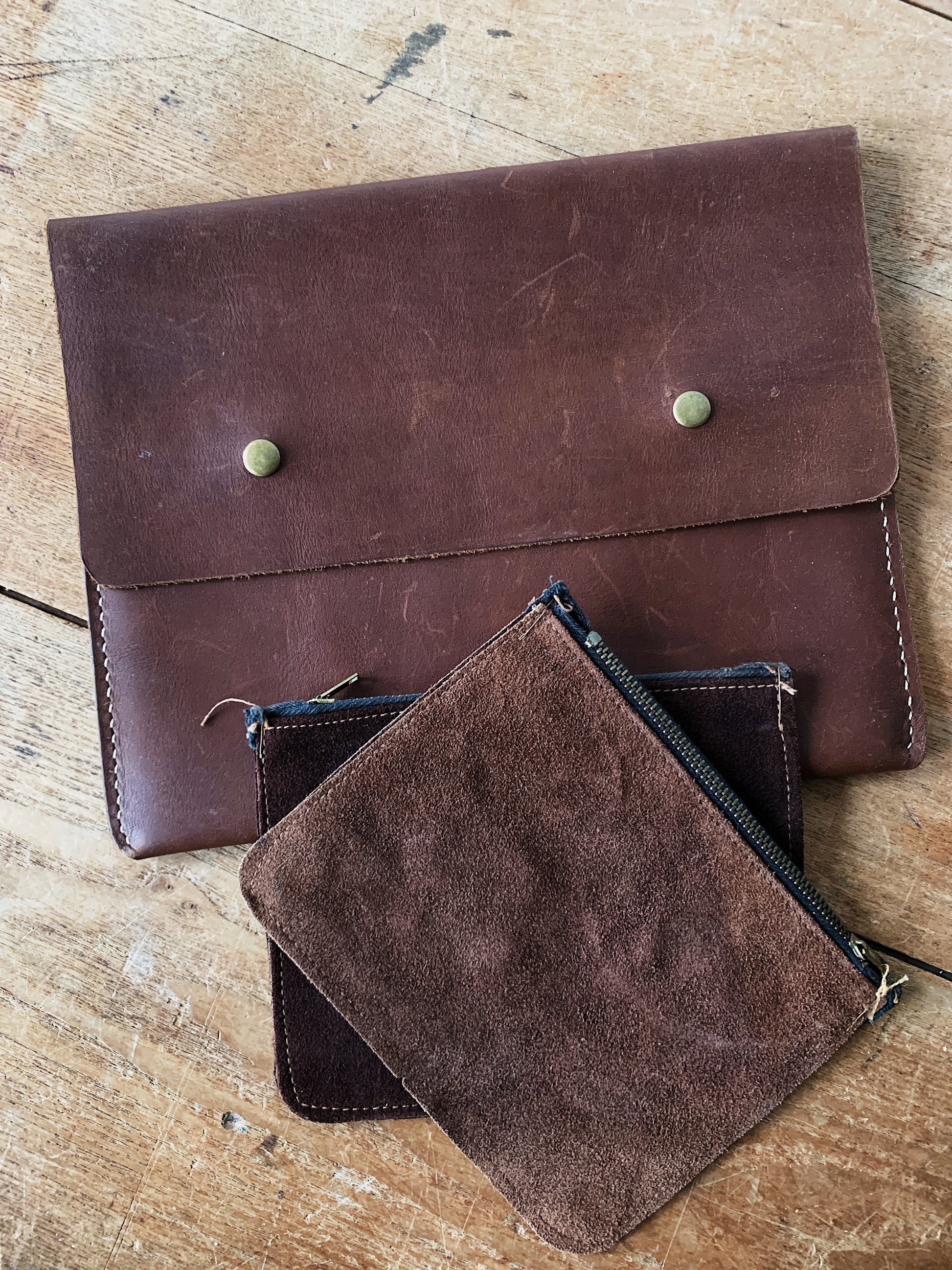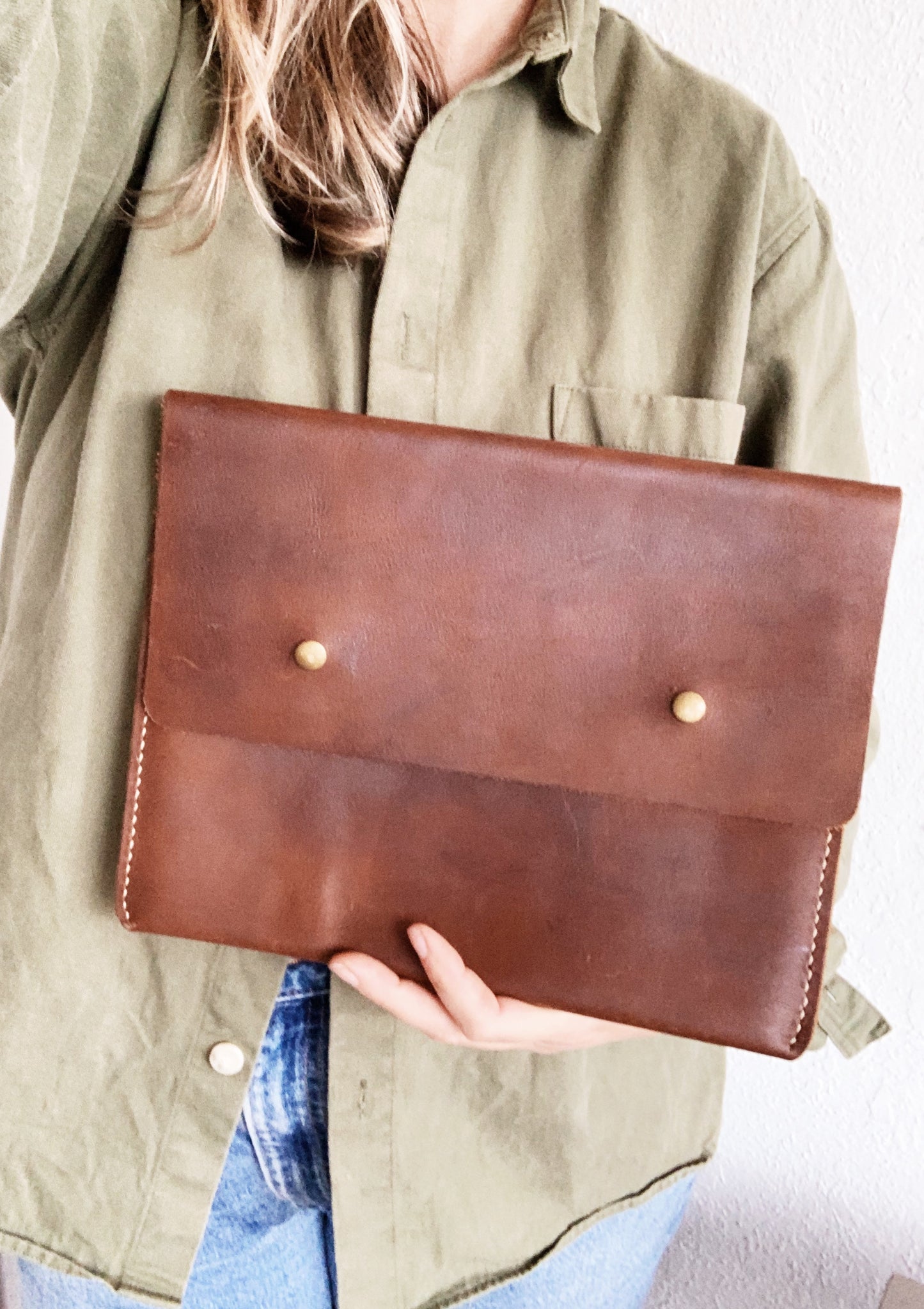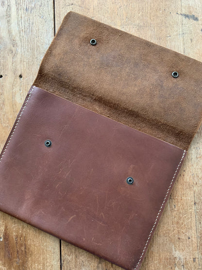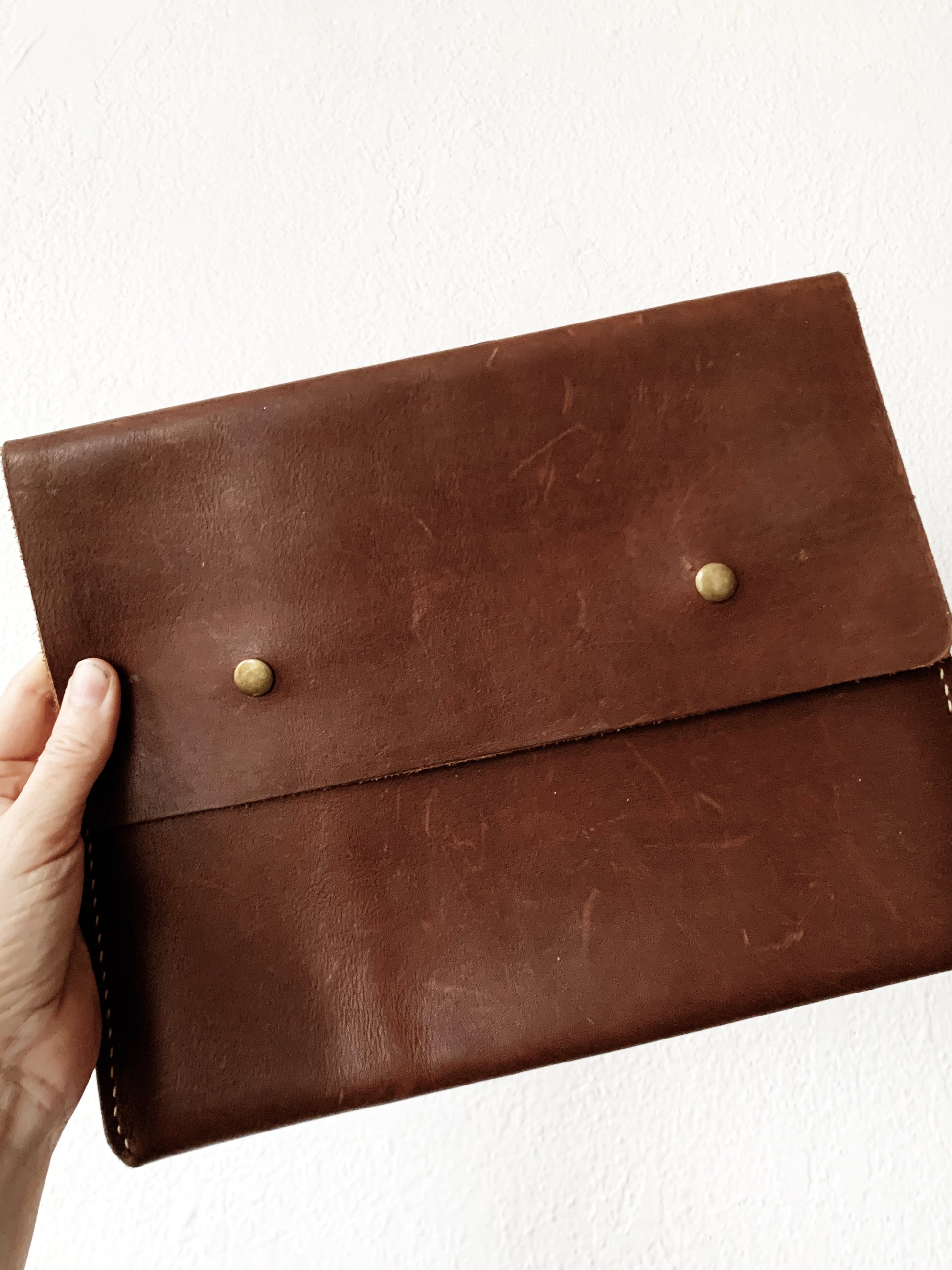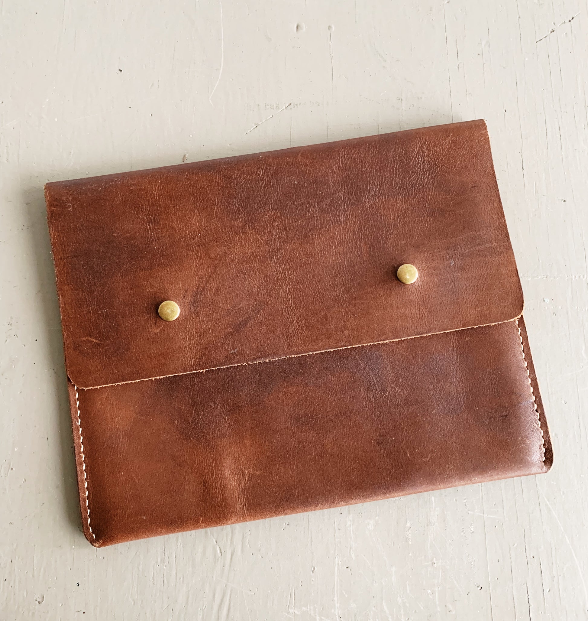 Thick beautifully handmade leather clutch with brass snaps. In excellent condition.