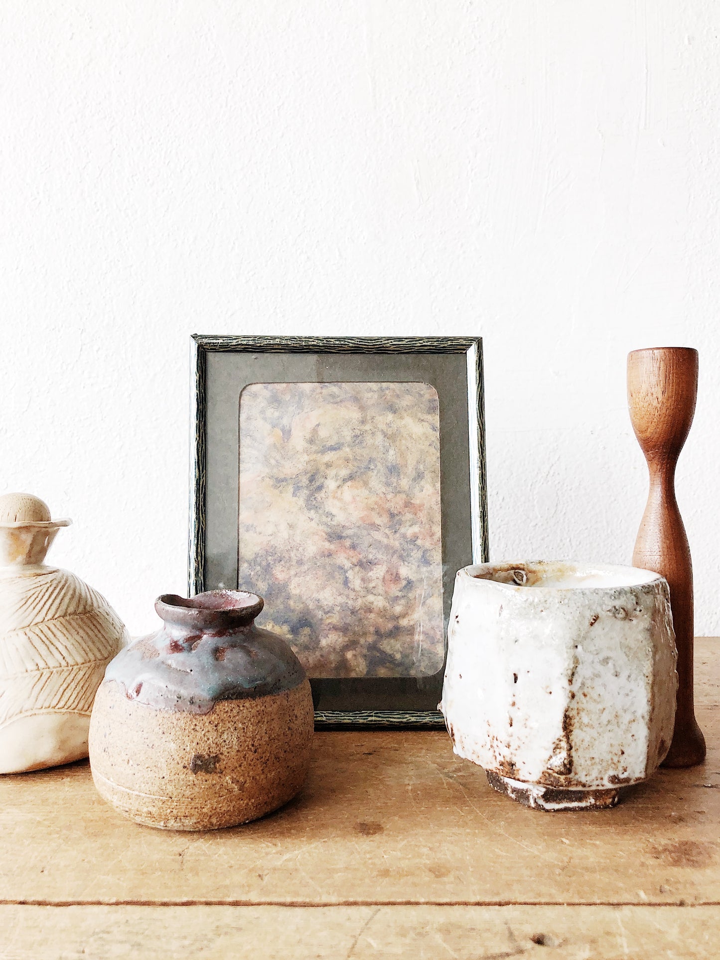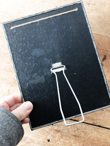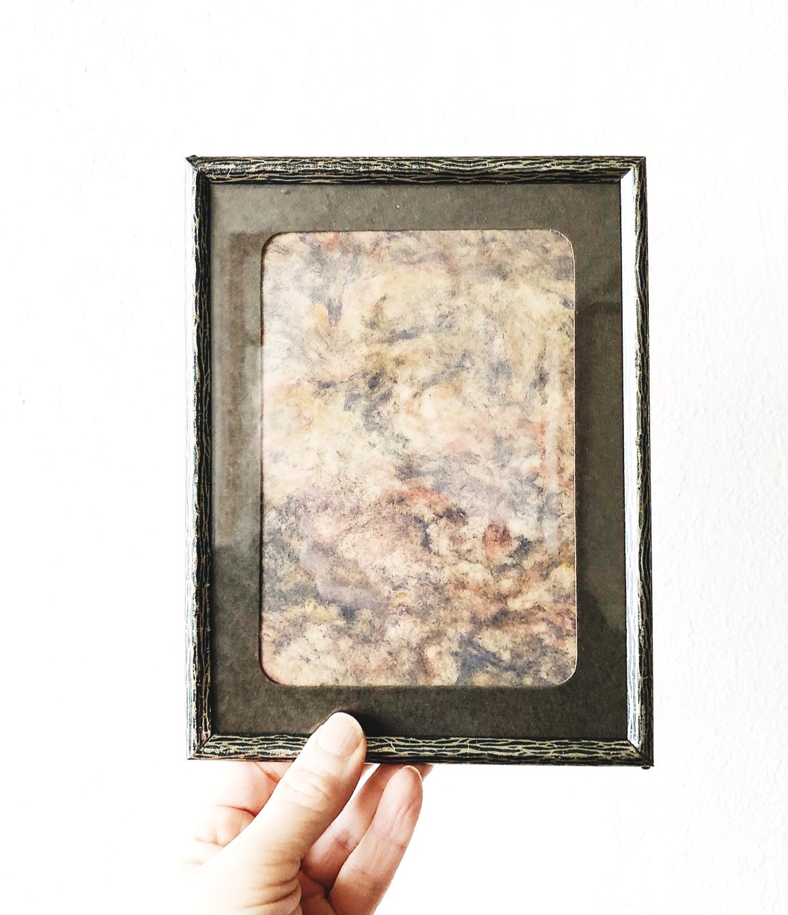 Handmade marbled paper framed in faux bois metal. Hanger / stand on reverse
