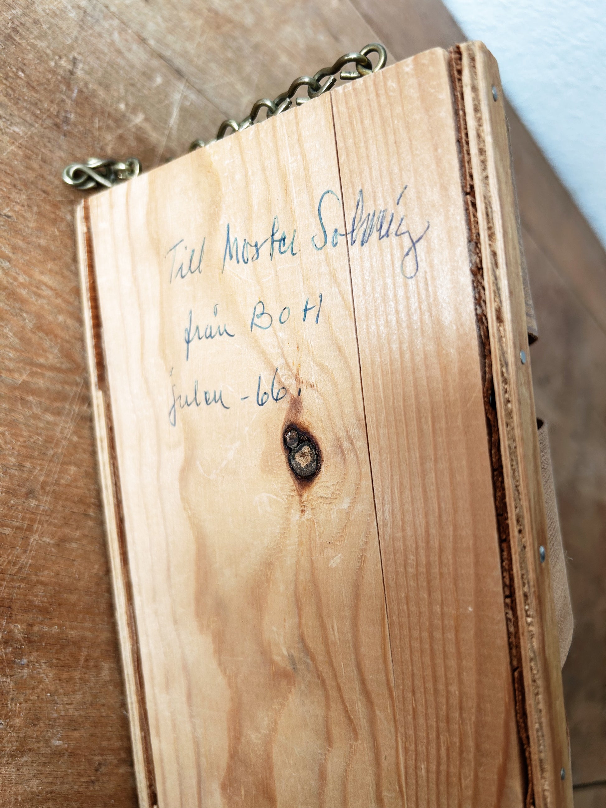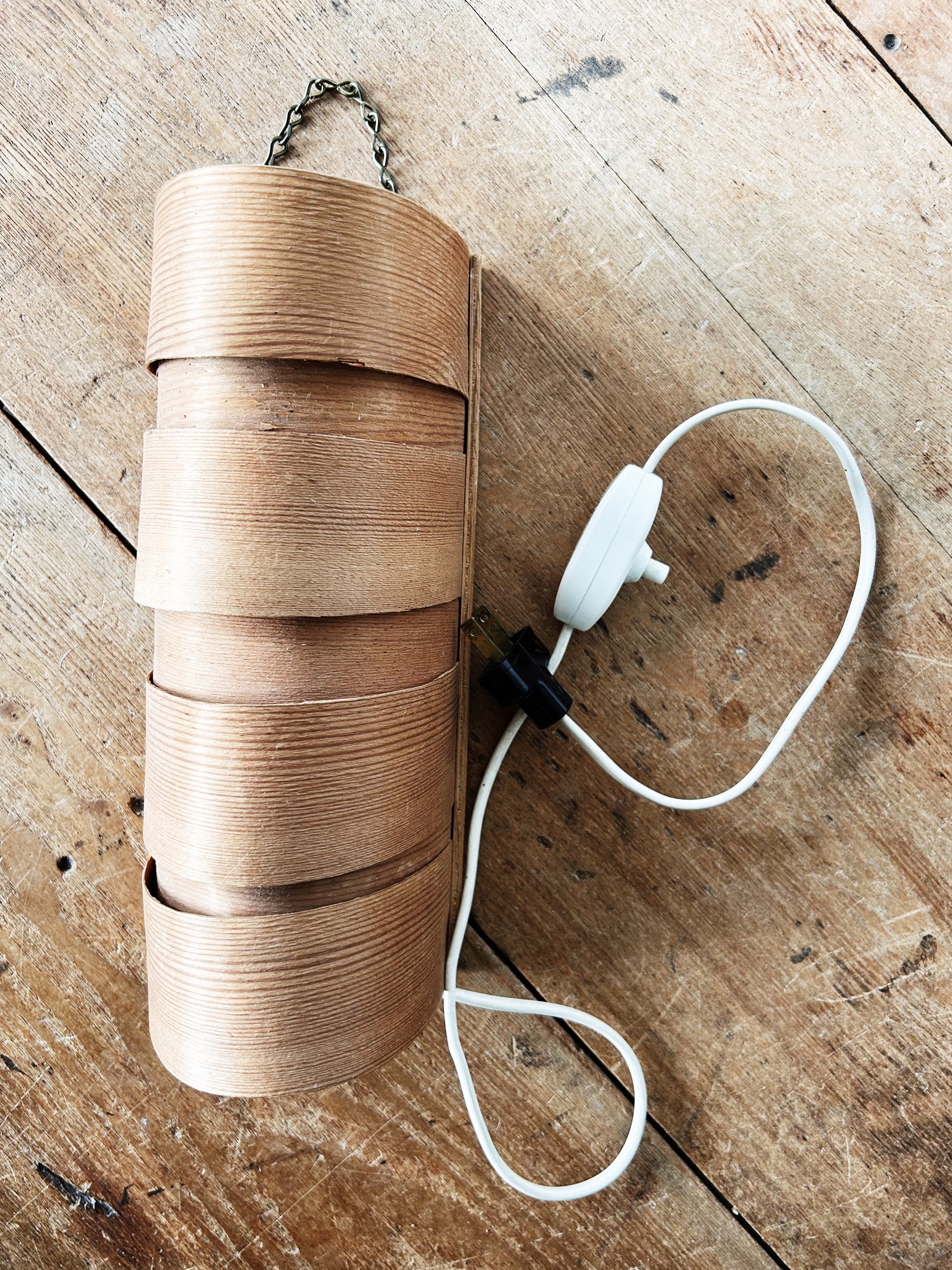 Charming handmade birch sconce with brass chain hanger and plug end cord. Takes a standard bulb