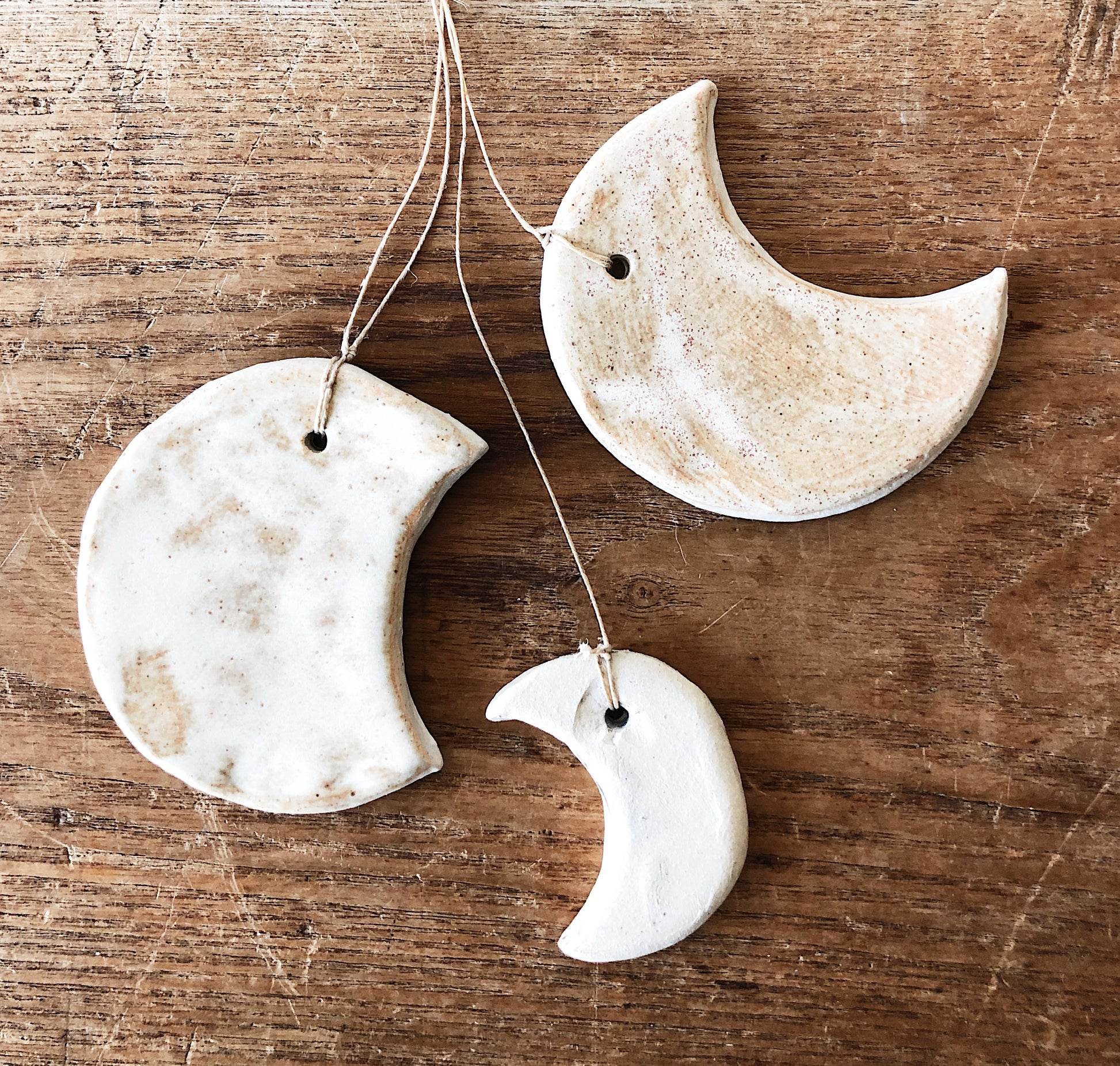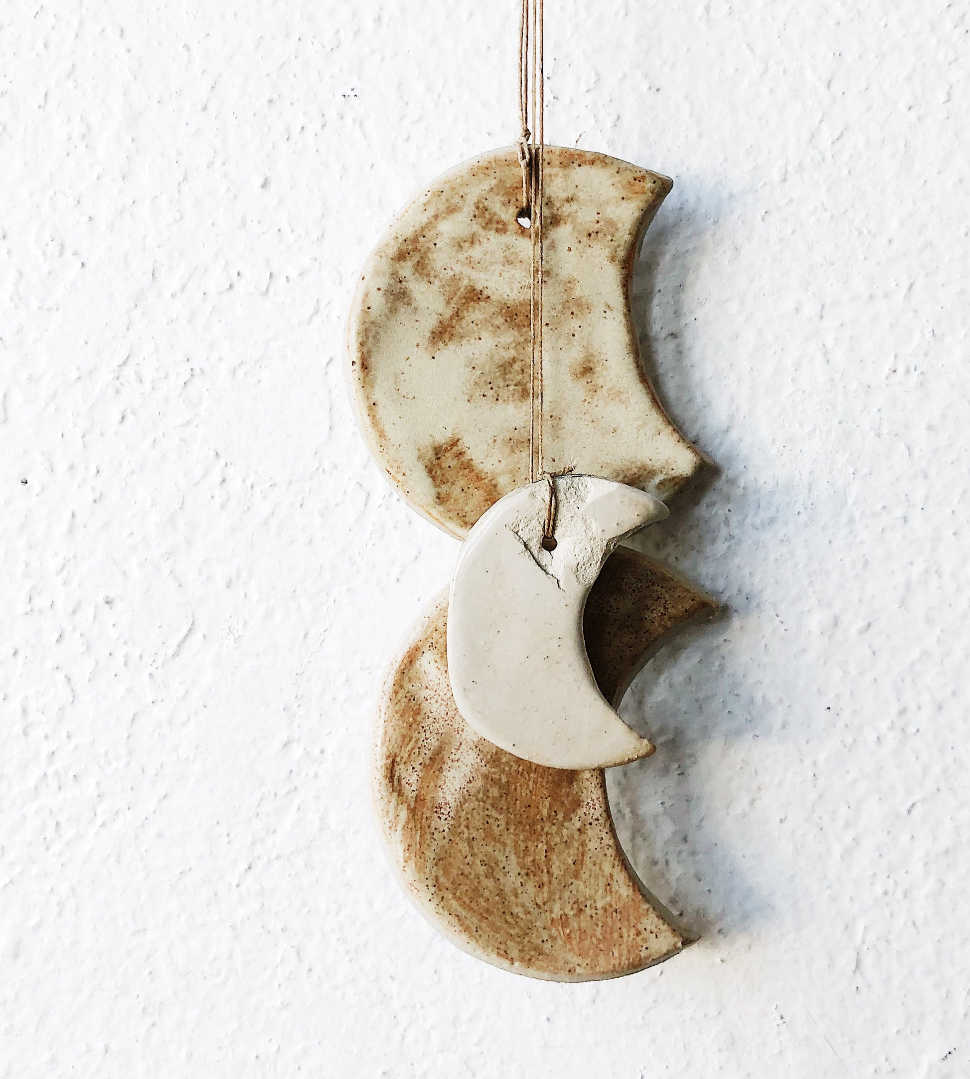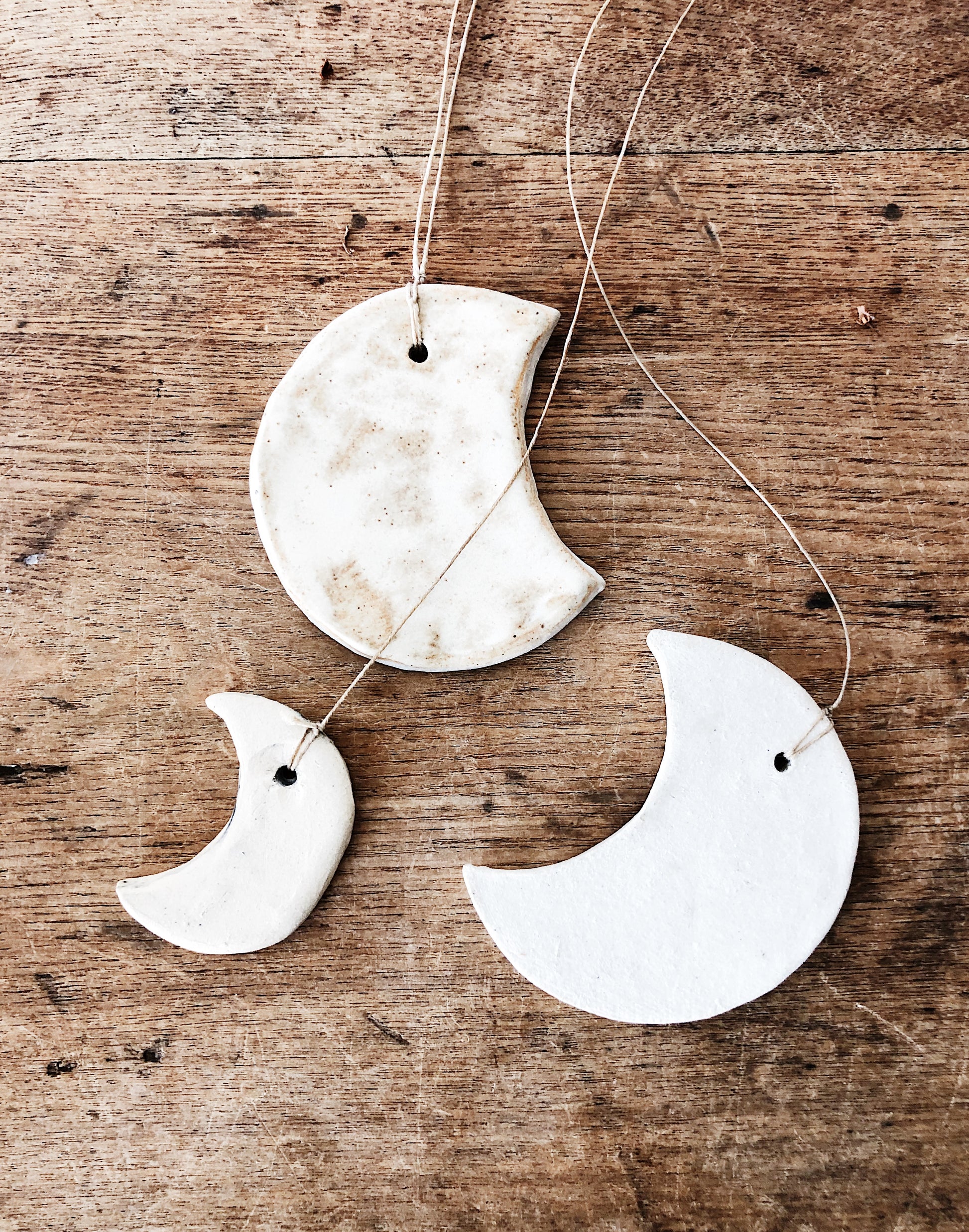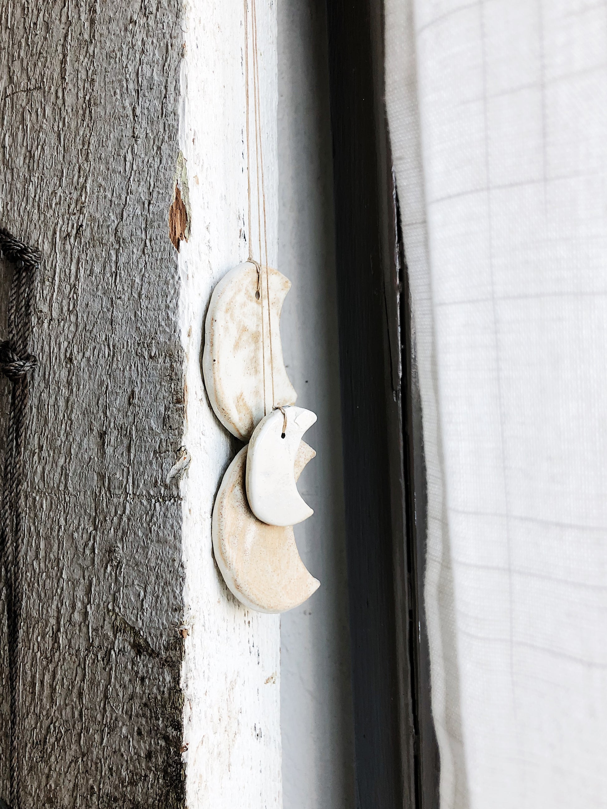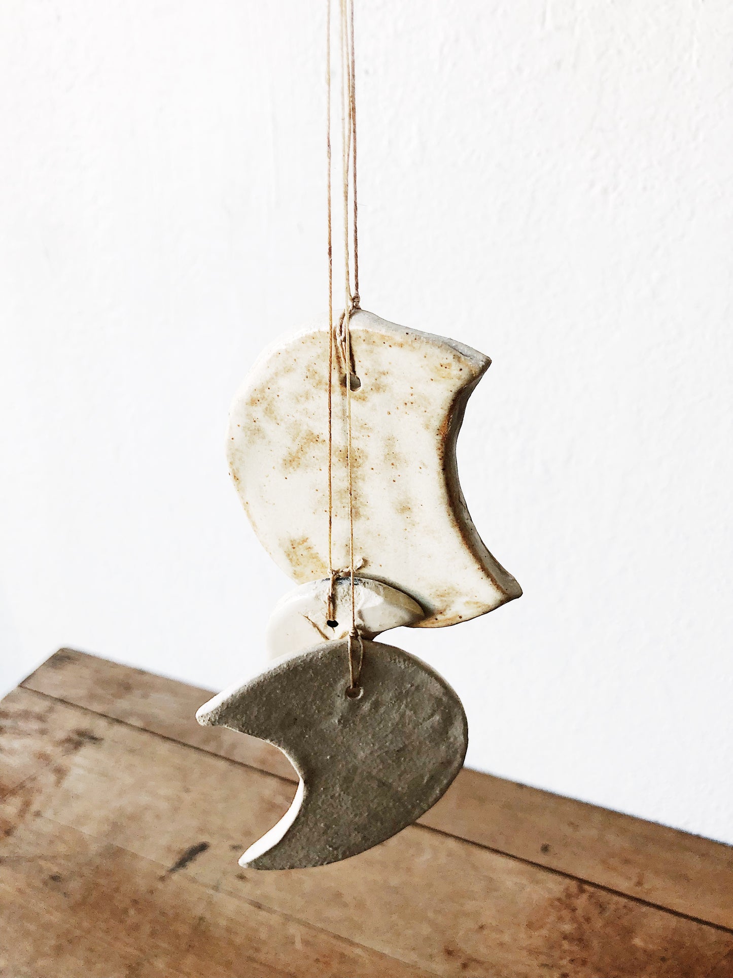 Ceramic moons strung together with waxed thread. Makes a subtle tinkling sound when the wind blows