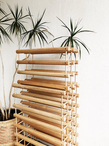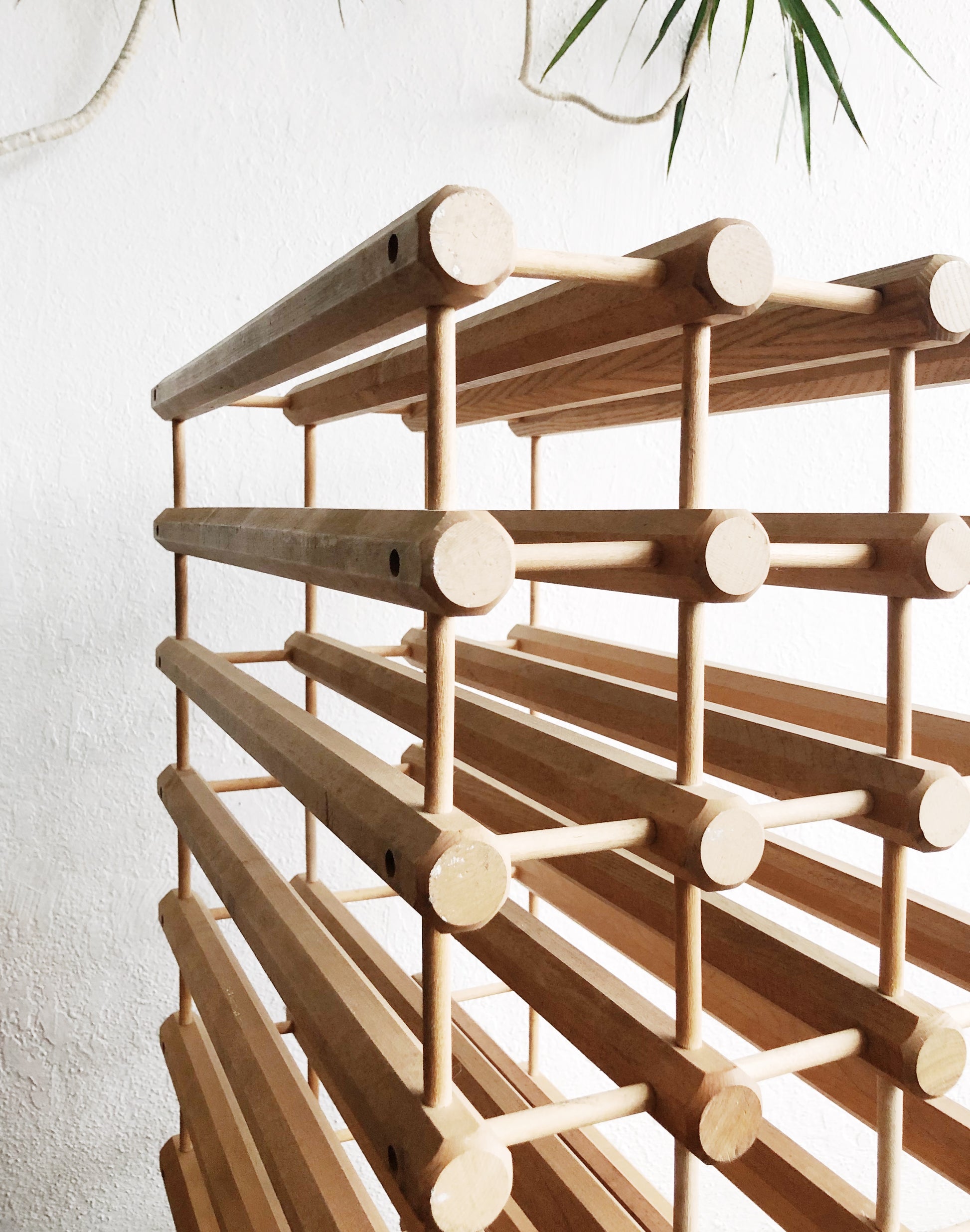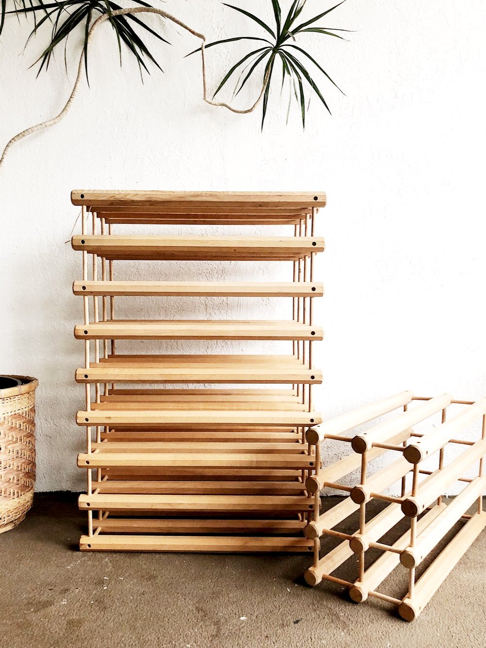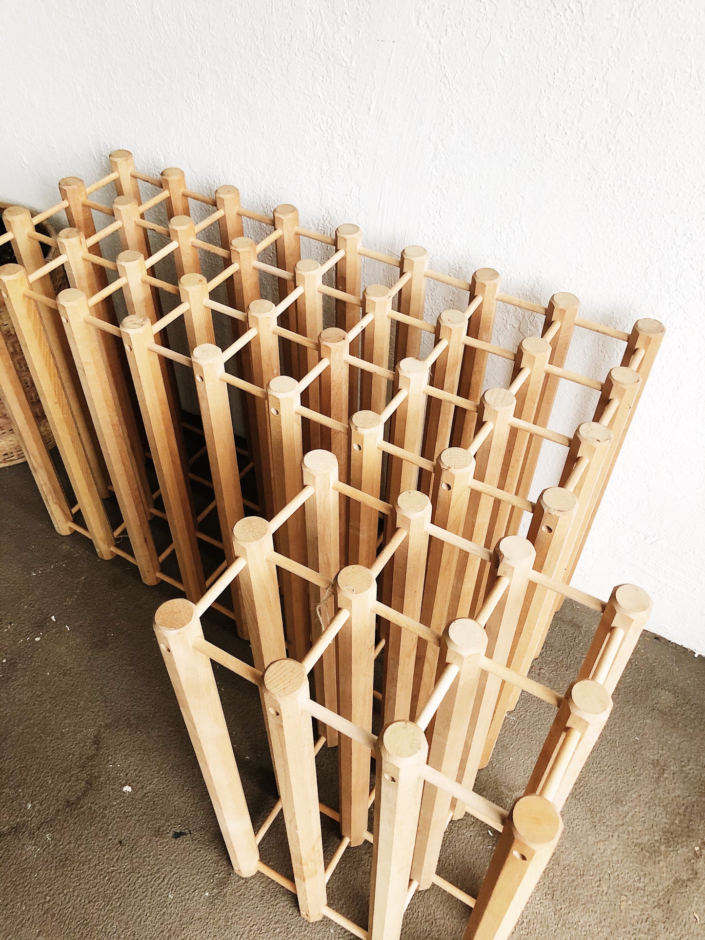 A popular design in the Conran style of the seventies and eighties. Natural untreated Ash wood. Strong dowel construction. Can be taken away from or added onto with dowel manipulation. Made by JK Adams, Vermont