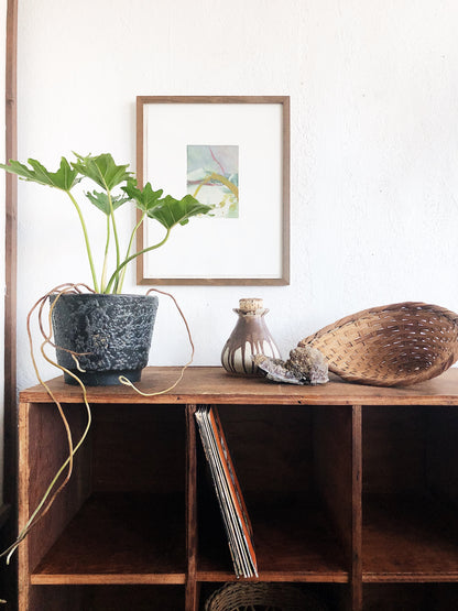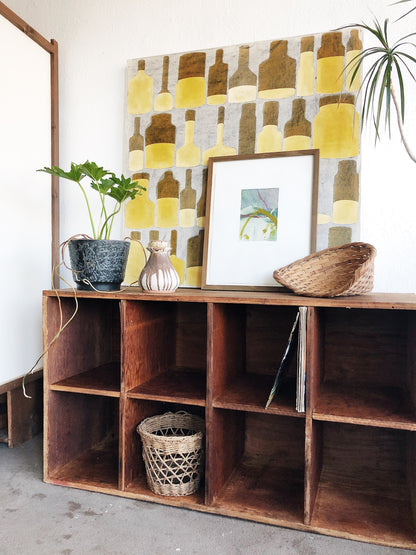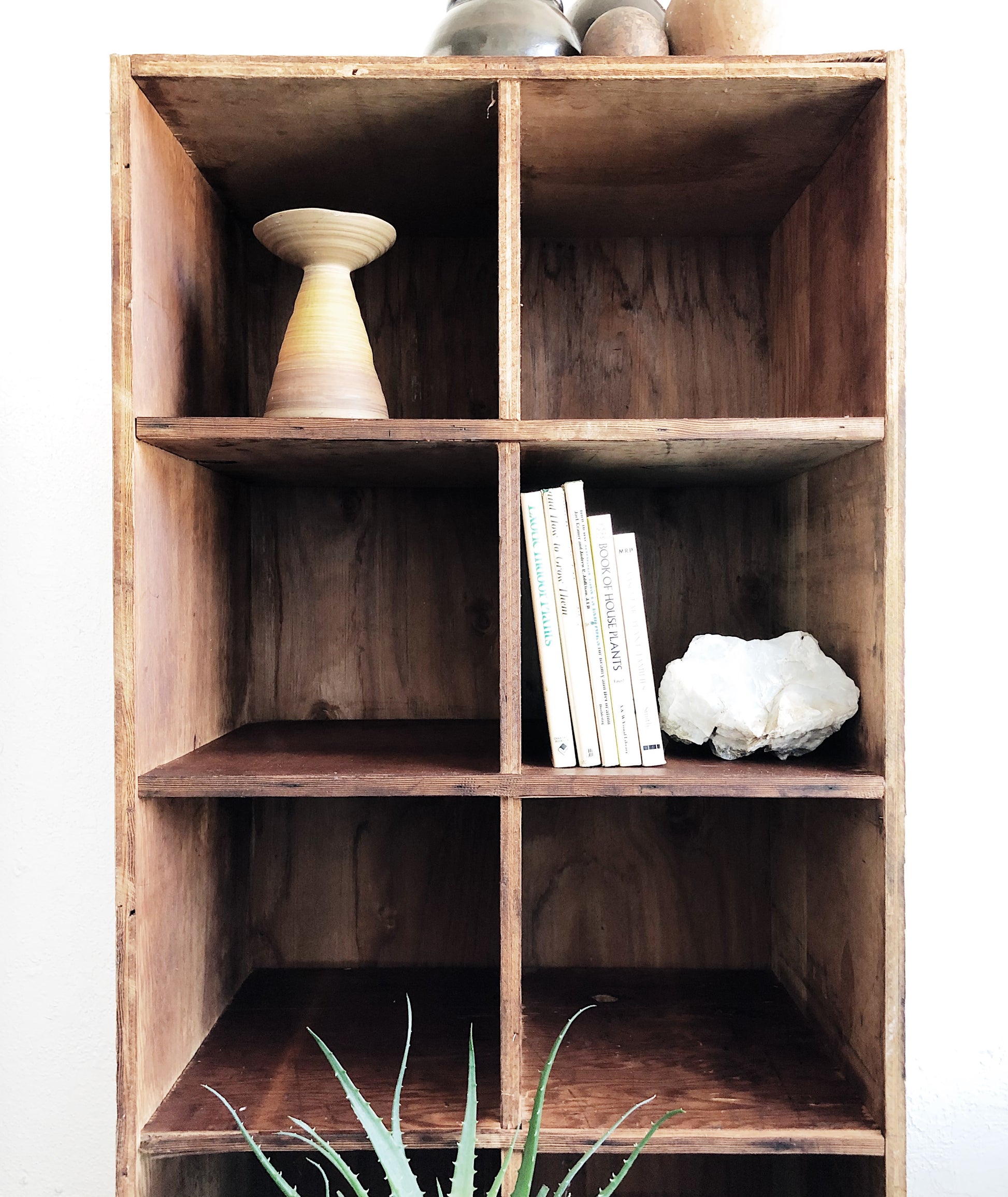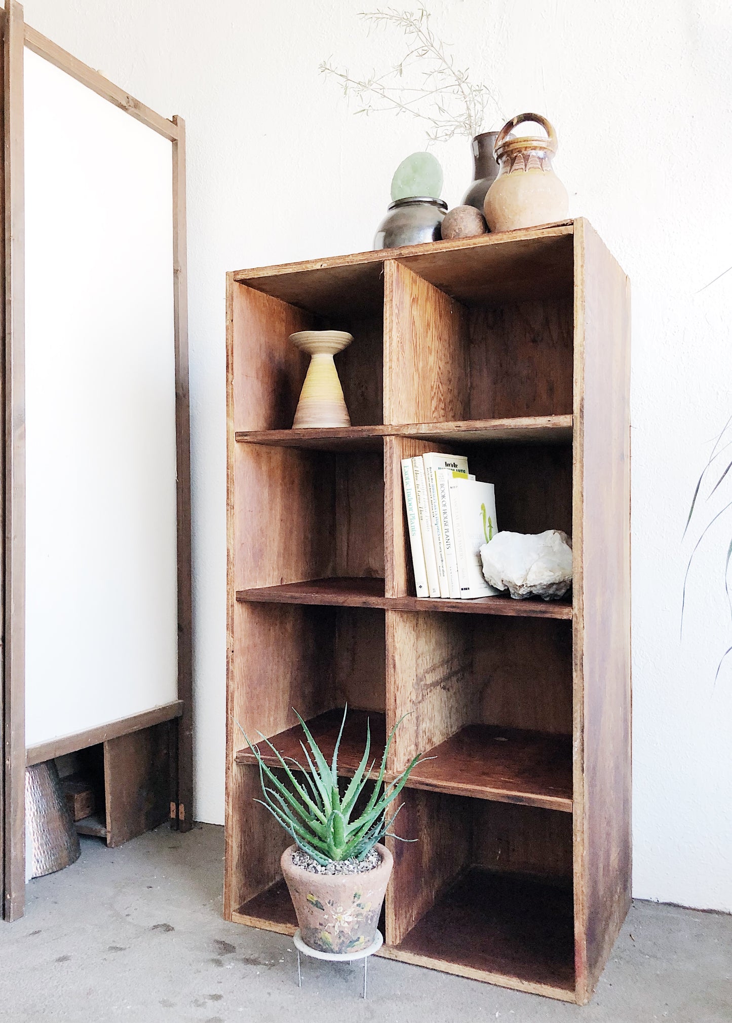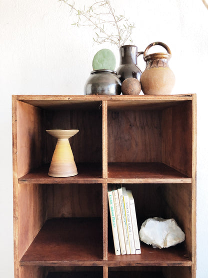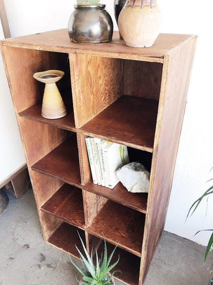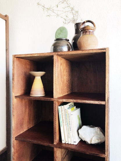 Great looking and sturdy handmade cubby shelf. Can be used in either orientation. Recently oiled. A few flaws here and there, some surface wear throughout but overall a great useful piece. Hold records in the horizontal orientation