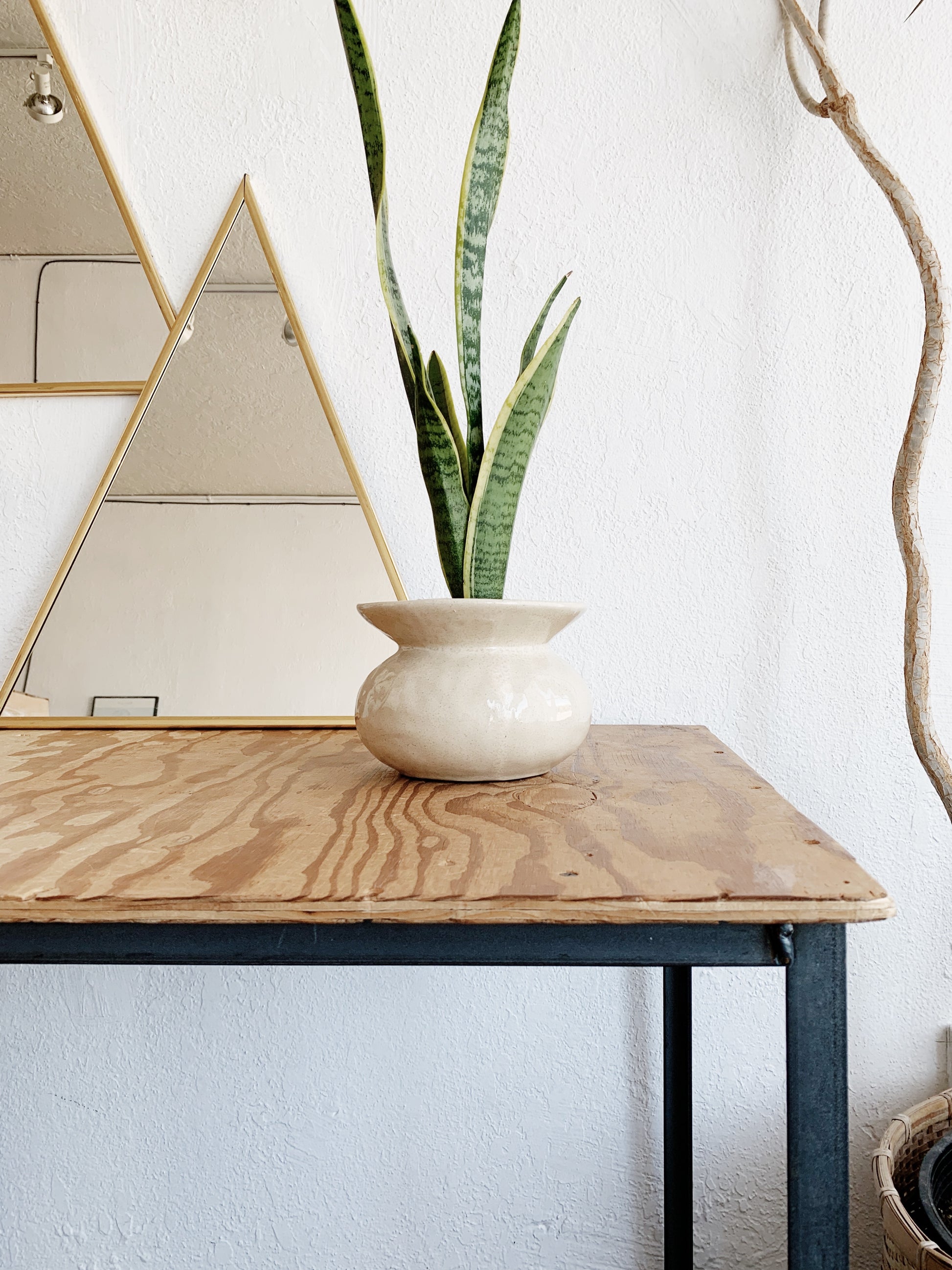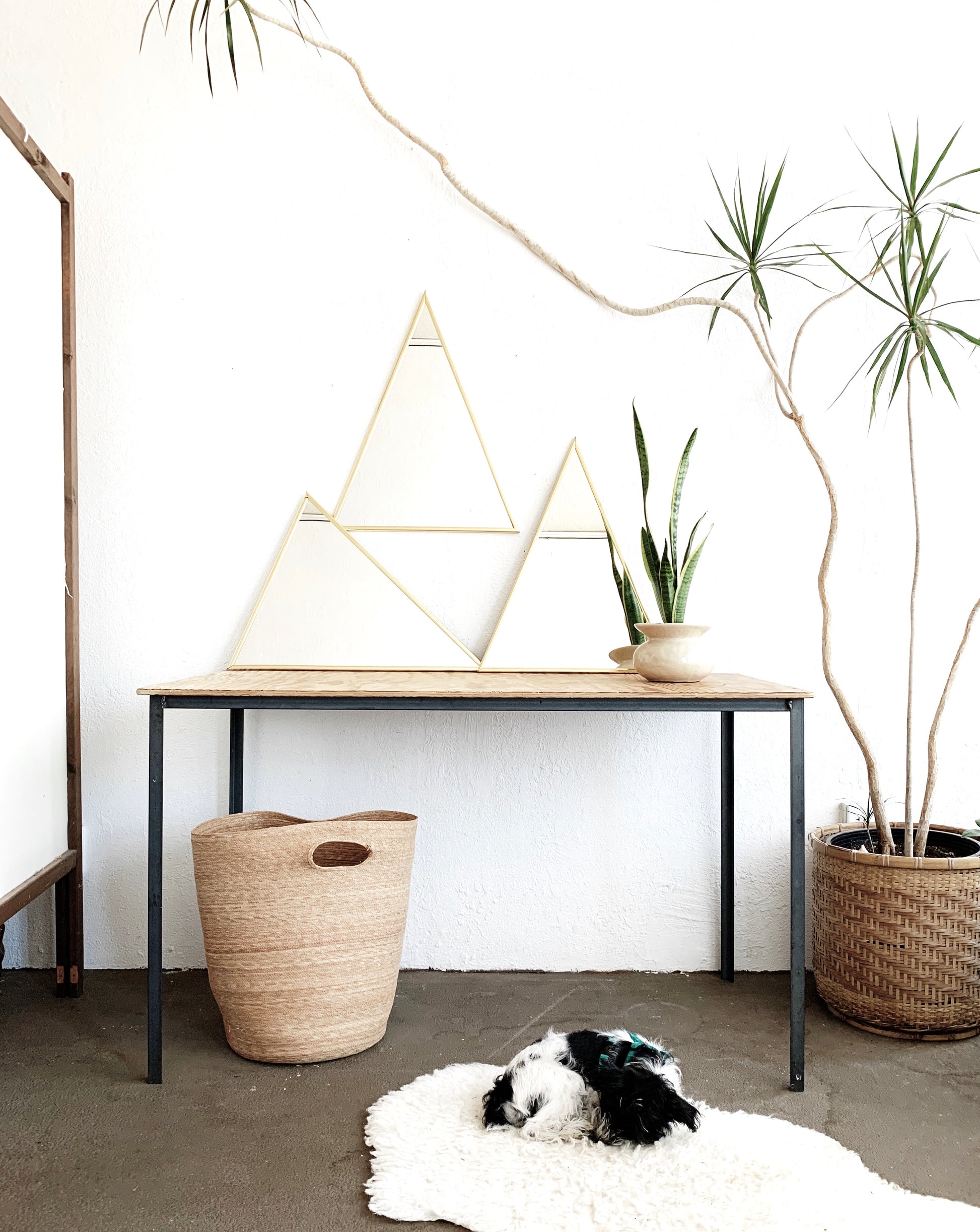 Love this handmade desk / work table. Nice old piece of ply for the top on a simple metal base. Great look, and sturdy.