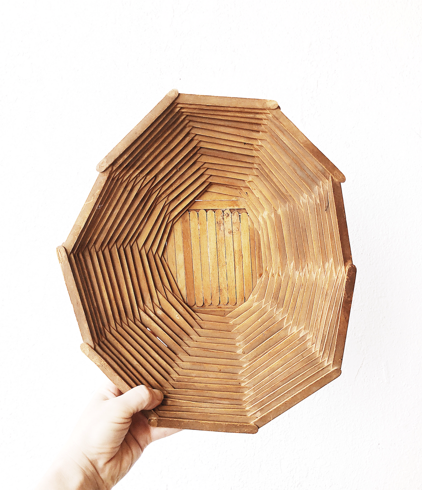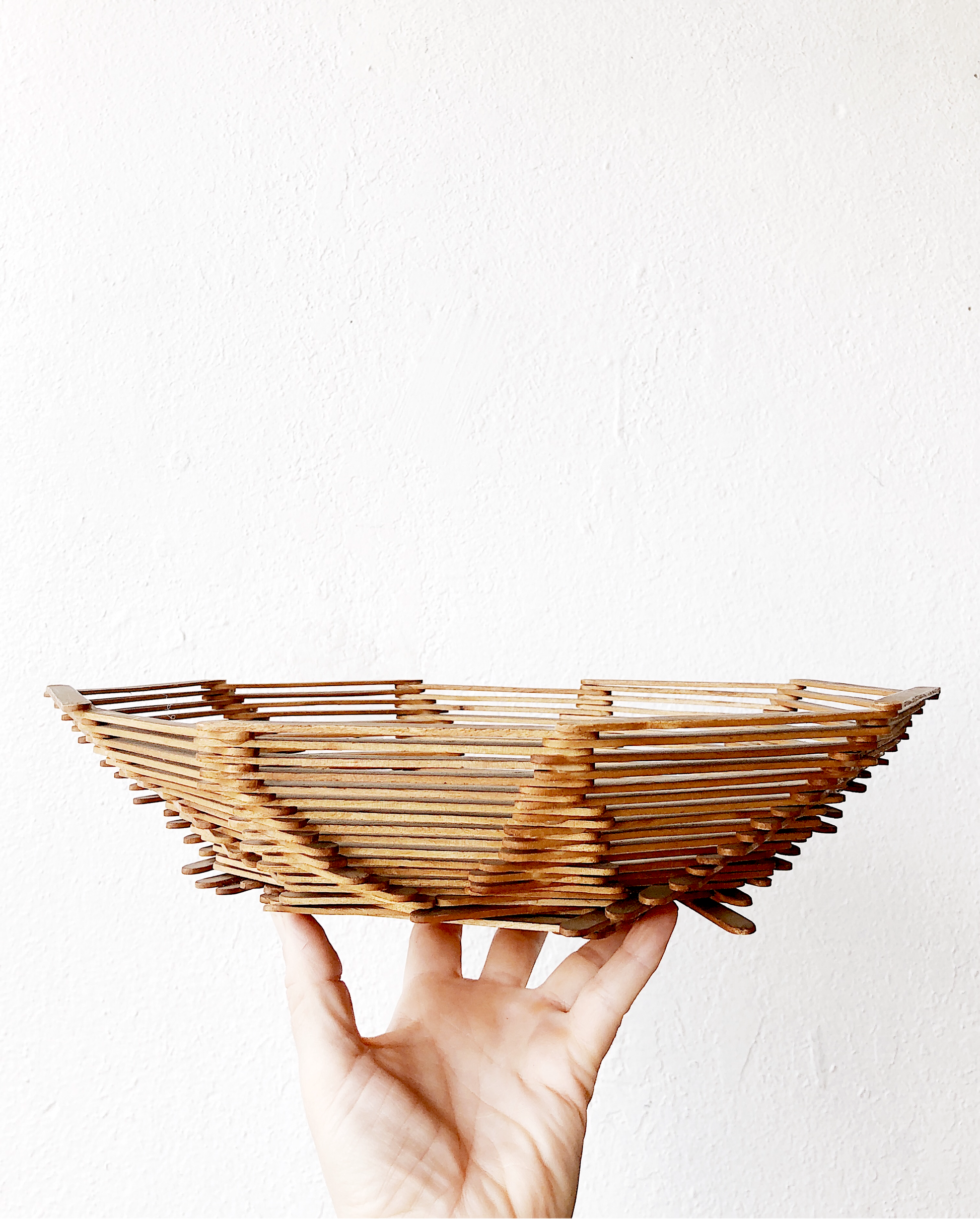 We love the tramp art influence on popsicle art. This bowl is great for fruit or holding mail in an entryway