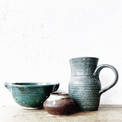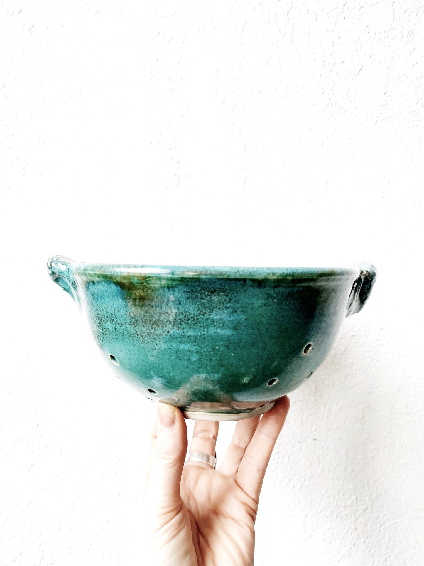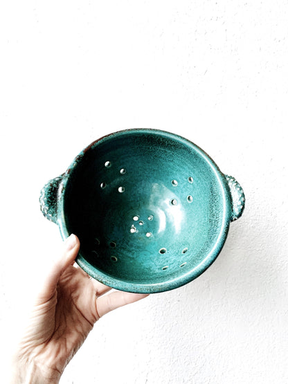 Beautiful handmade pottery berry bowl or colander with pretty turquoise glaze.