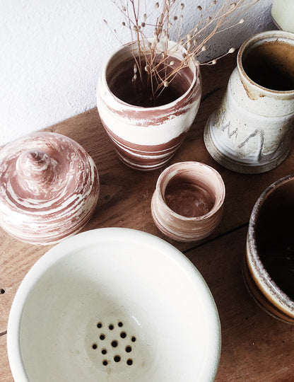 An beautiful neutral glaze to this handmade colander. Creamy white/ivory with slightest flecked interior. We love the slight pedestal base. Nice for serving fruit too!