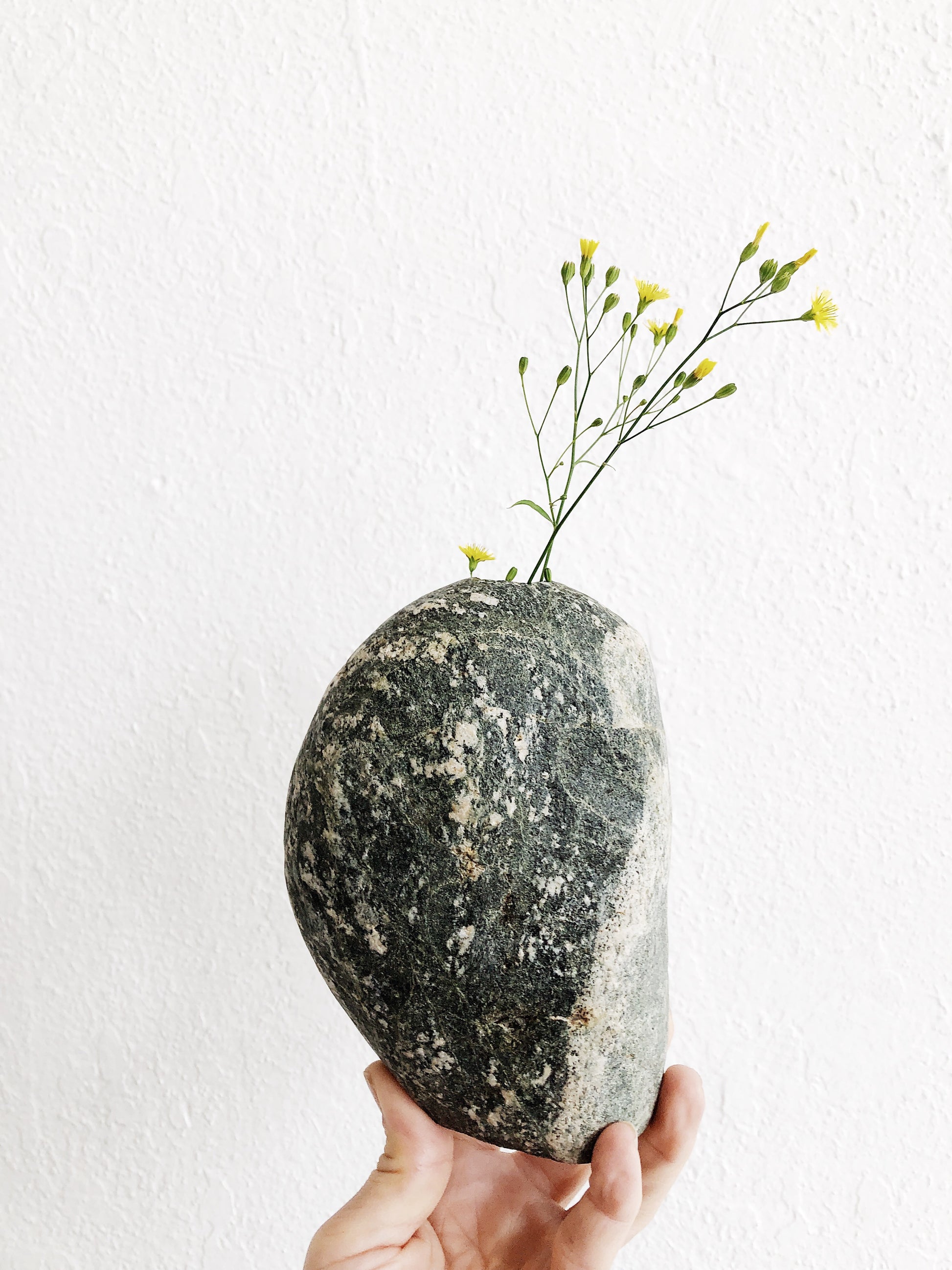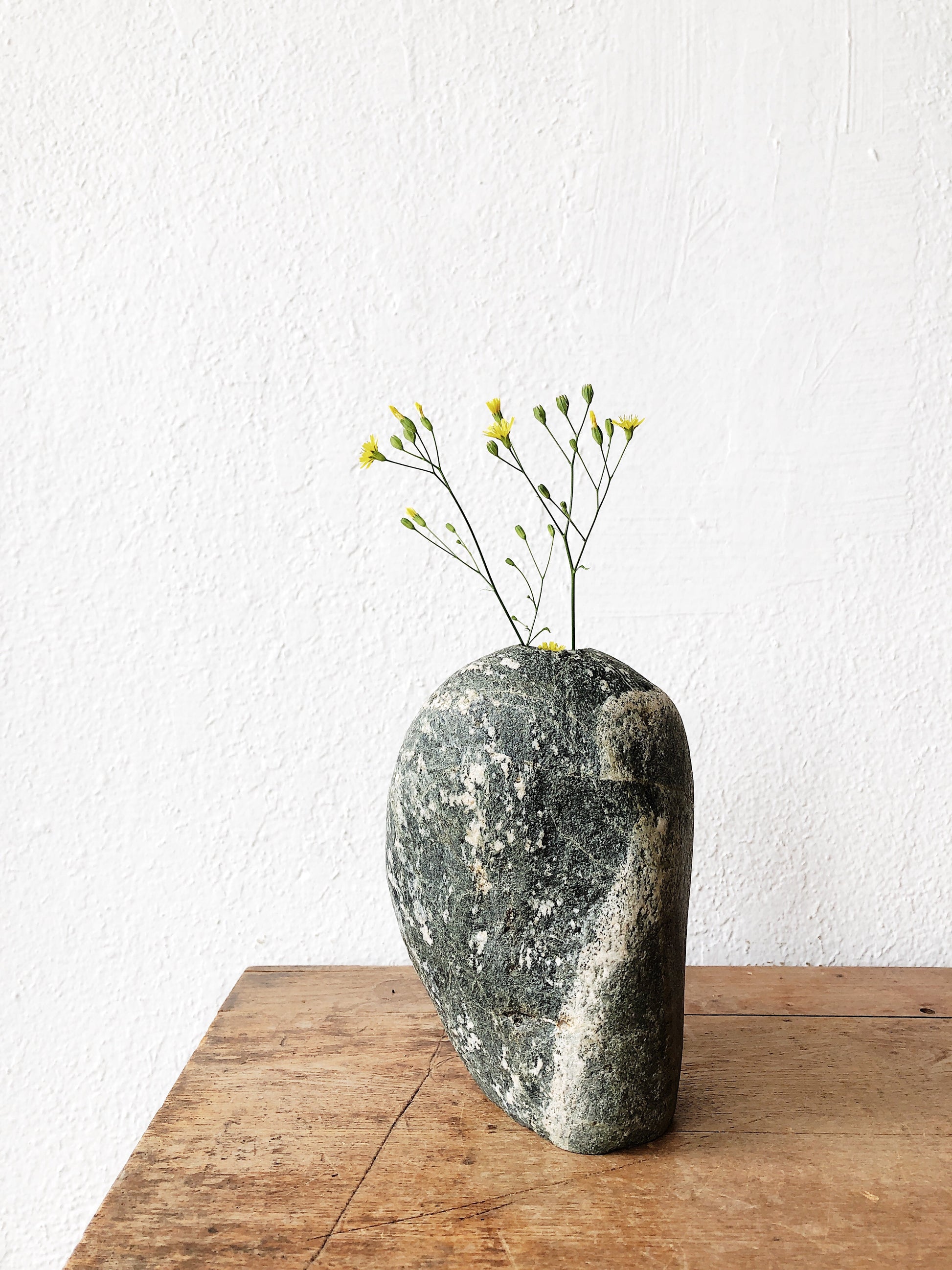 Another fantastic river rock vase. This one has a lovely abstract irregular shape. Very heavy, as rocks are apt to be. Signed by the artist.