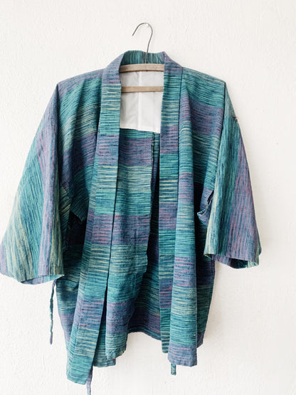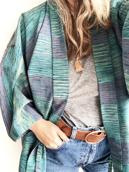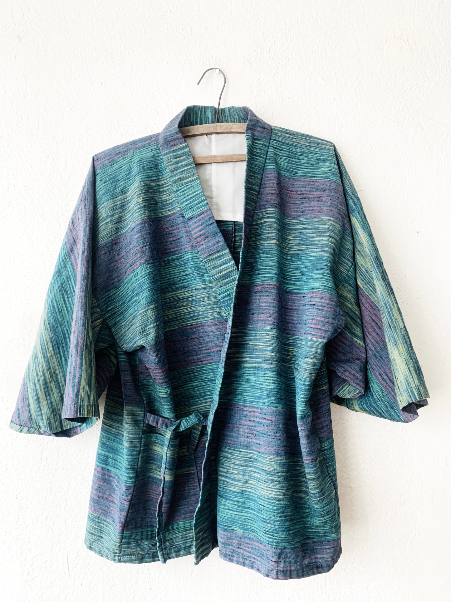 Lovely cotton/raw silk blend handmade shorty kimono with pocket. Excellent condition. It has an inner and outer tie or just wear open
