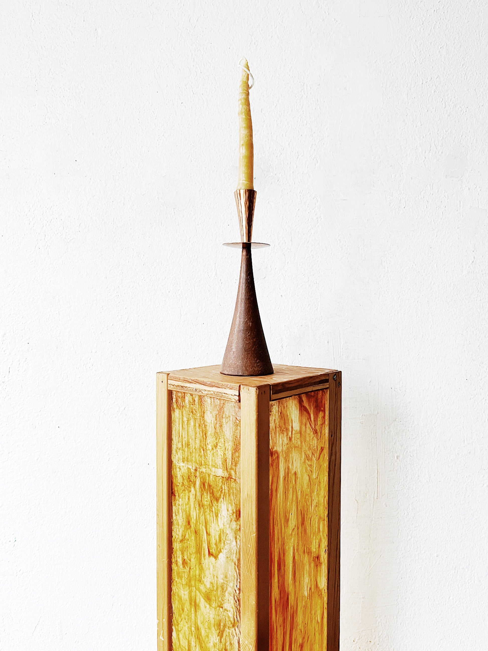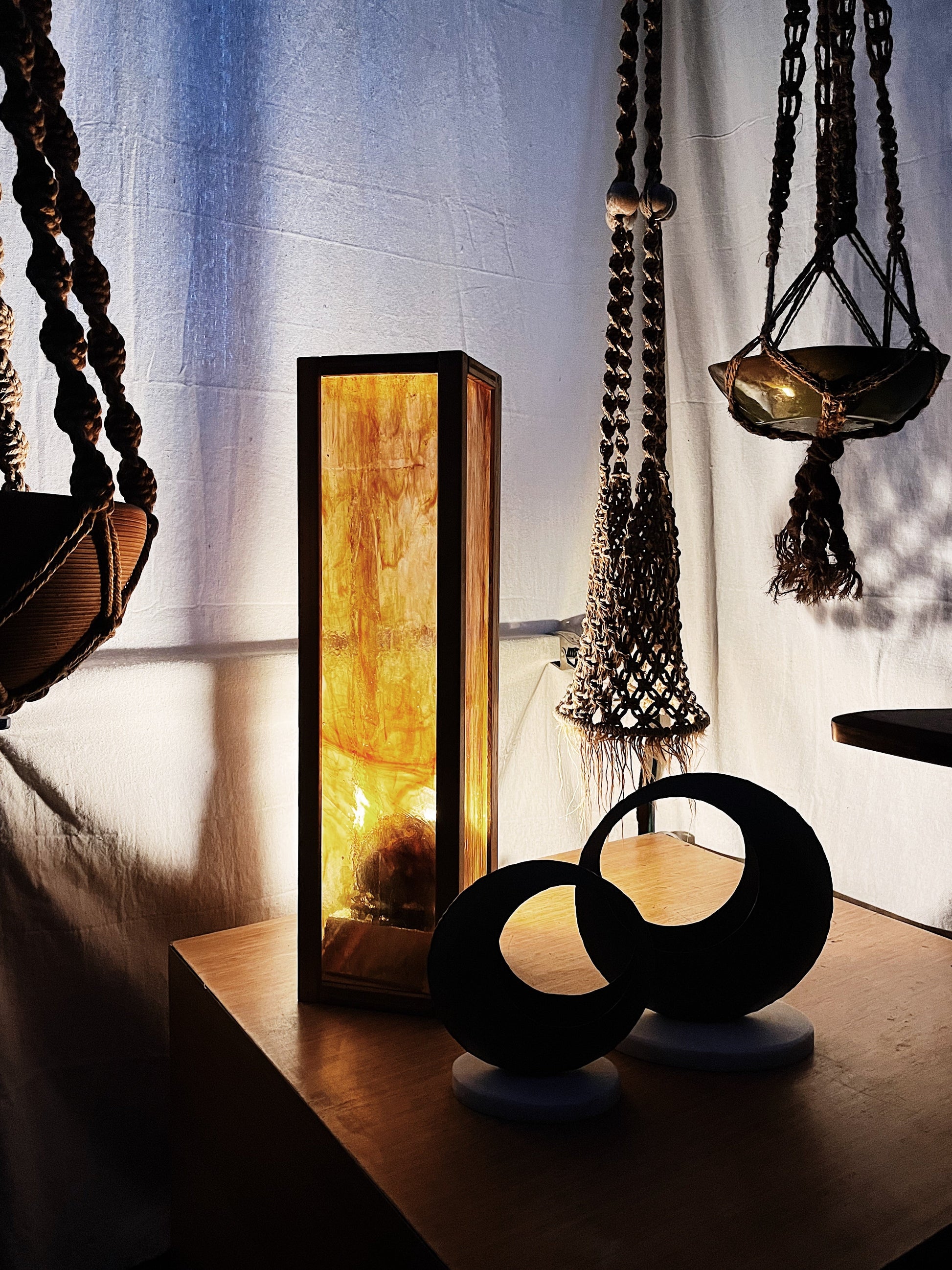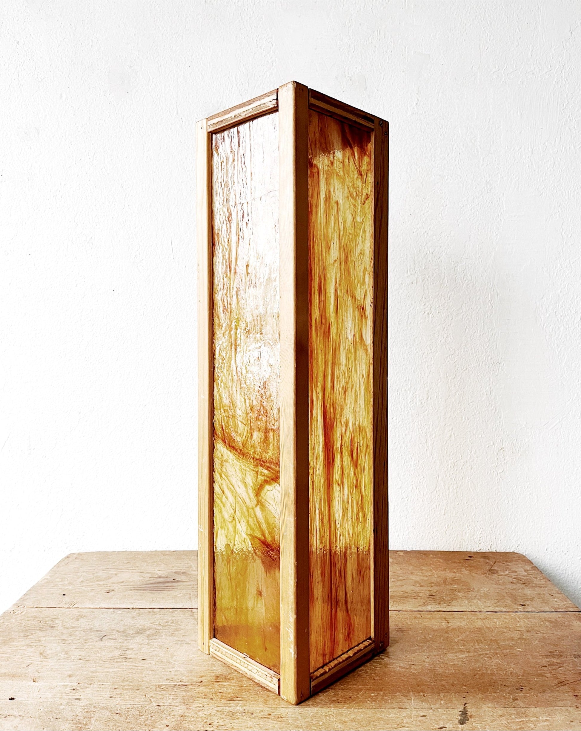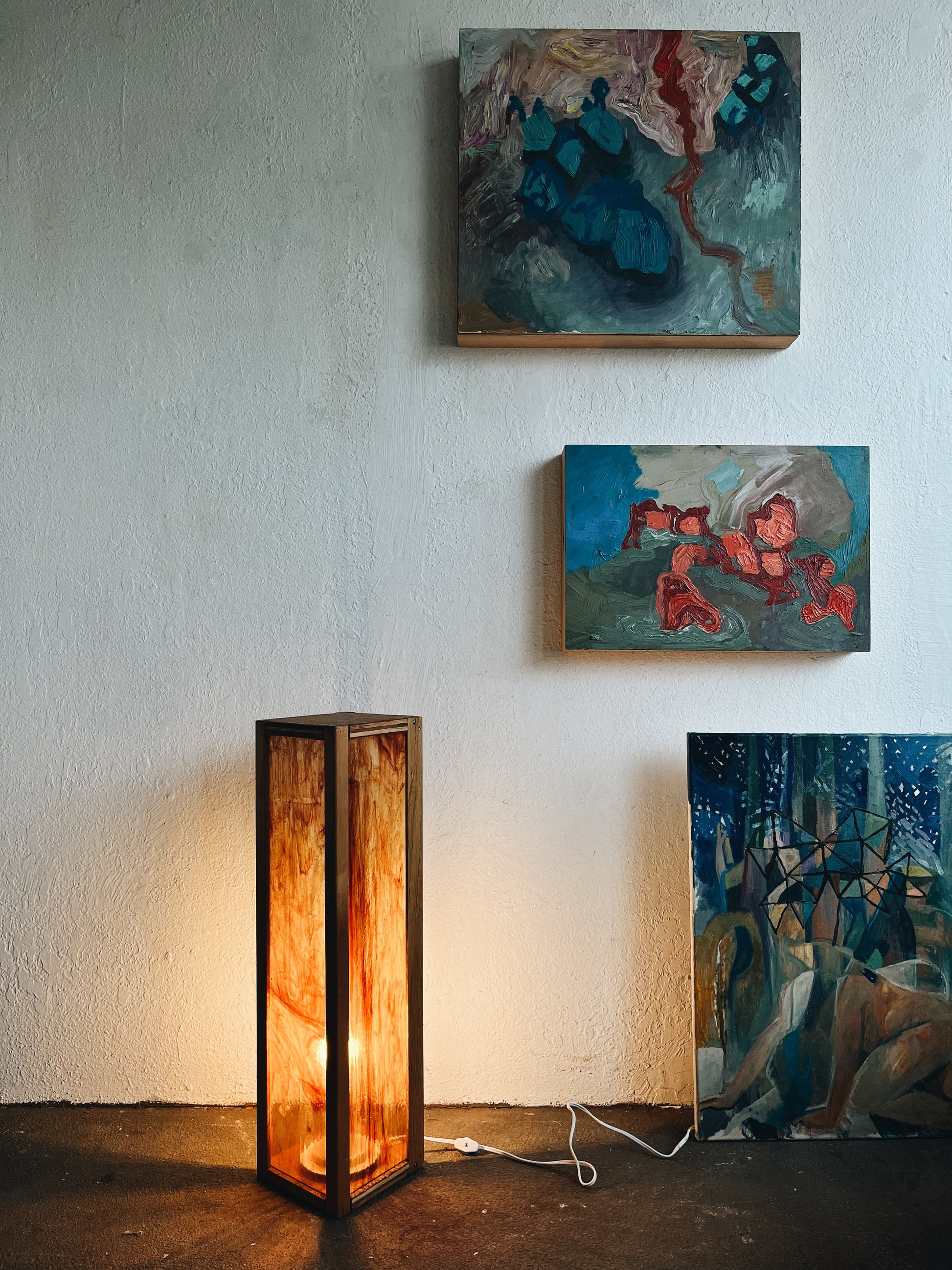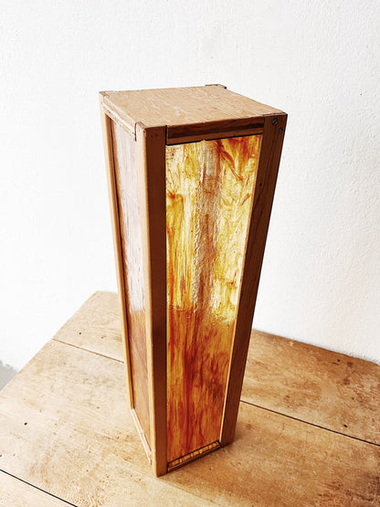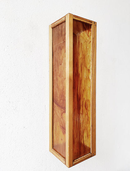 Cool wood framed corner shelf with slag glass panels. Open in back. Sturdy And works well either on the wall or on the floor. We’ve added a small light inside it and think it’s a wonderful way to display it.