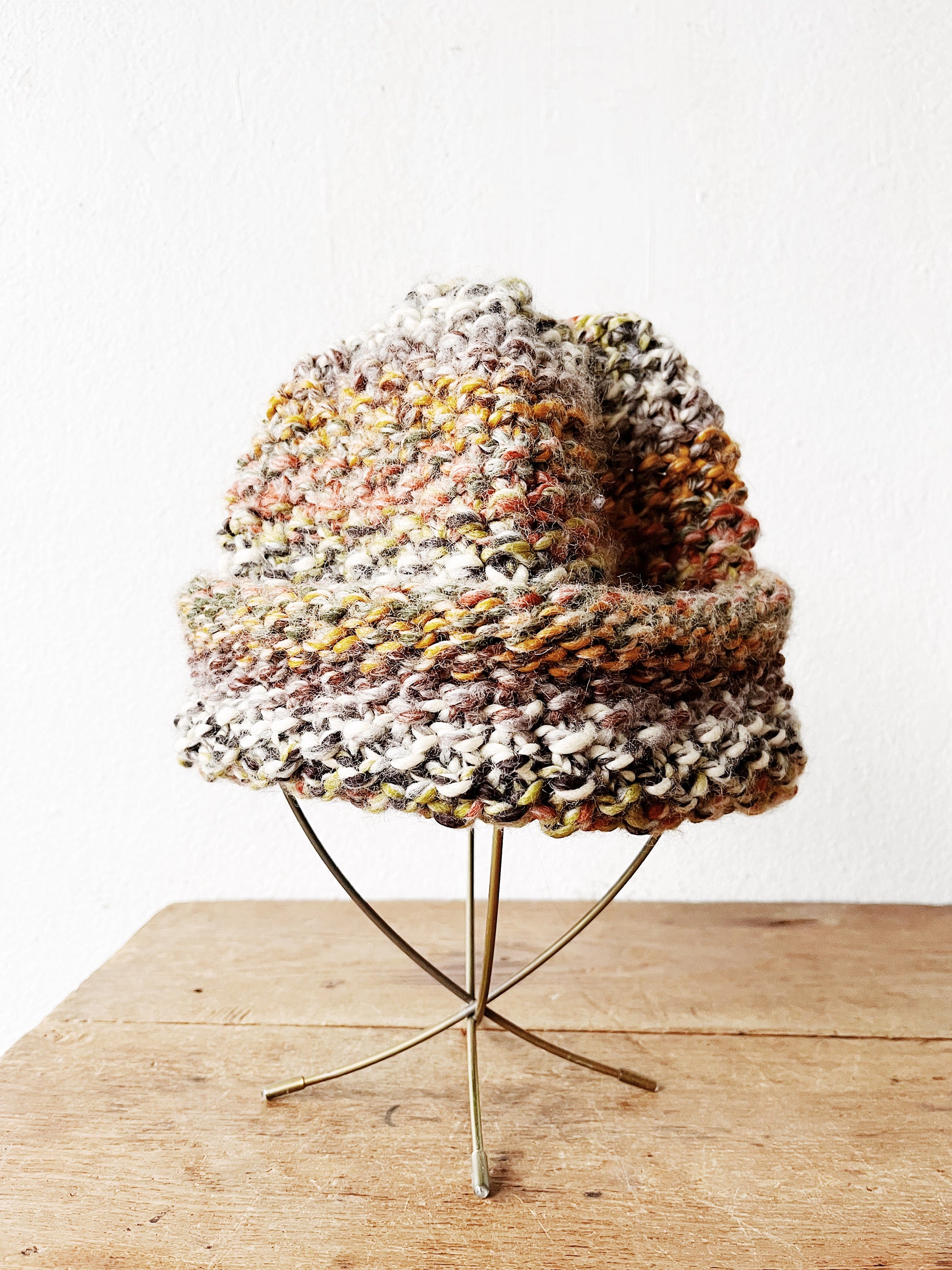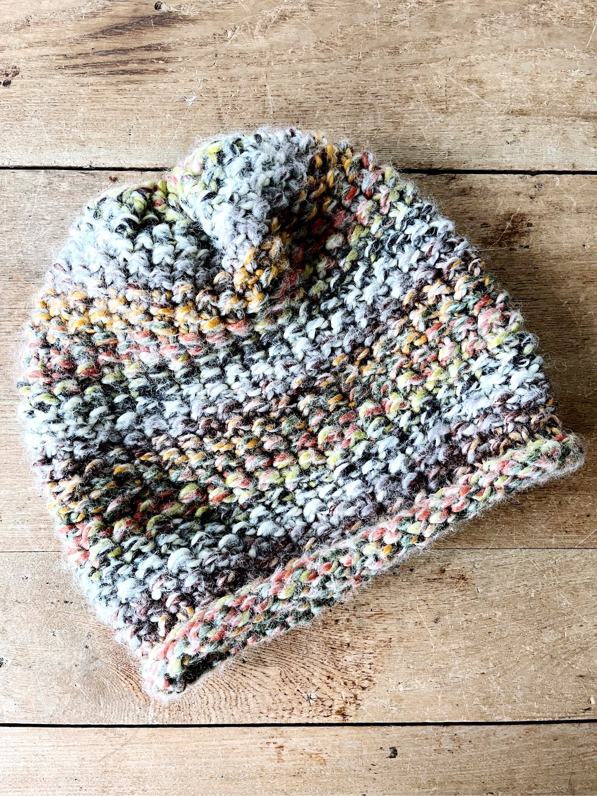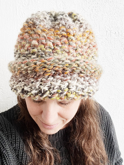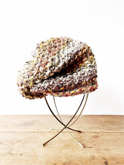 Pale pastel colors and a super soft slouchy fit. You can also cuff the hem and make it more fitted. Super soft cozy wool