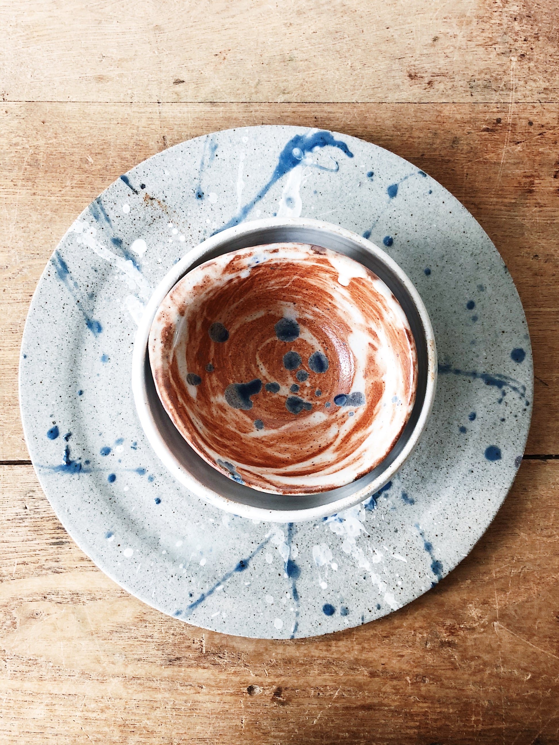 A collection of blue splatter pottery that goes well together for serving. The stoneware is heavy and substantial