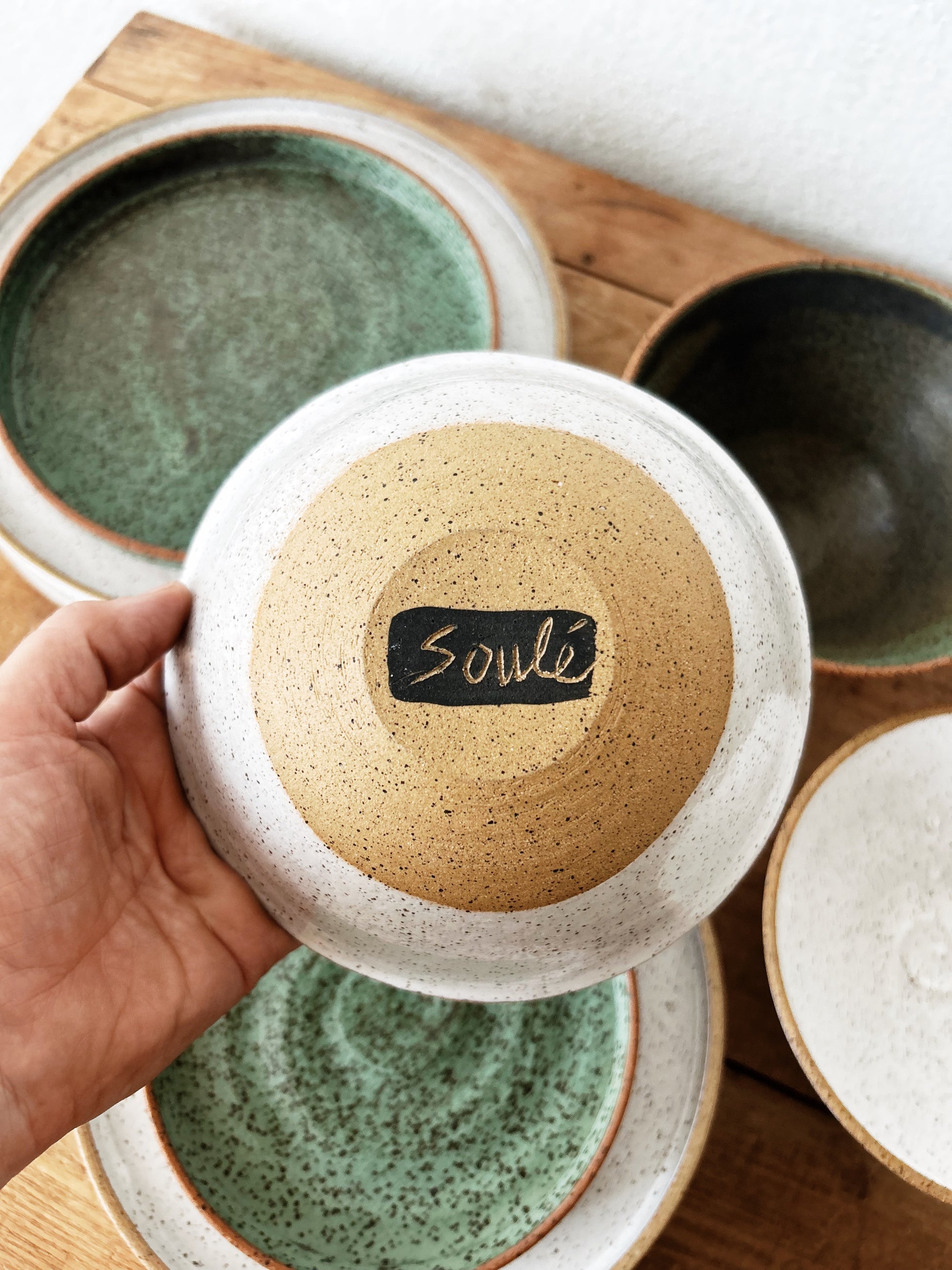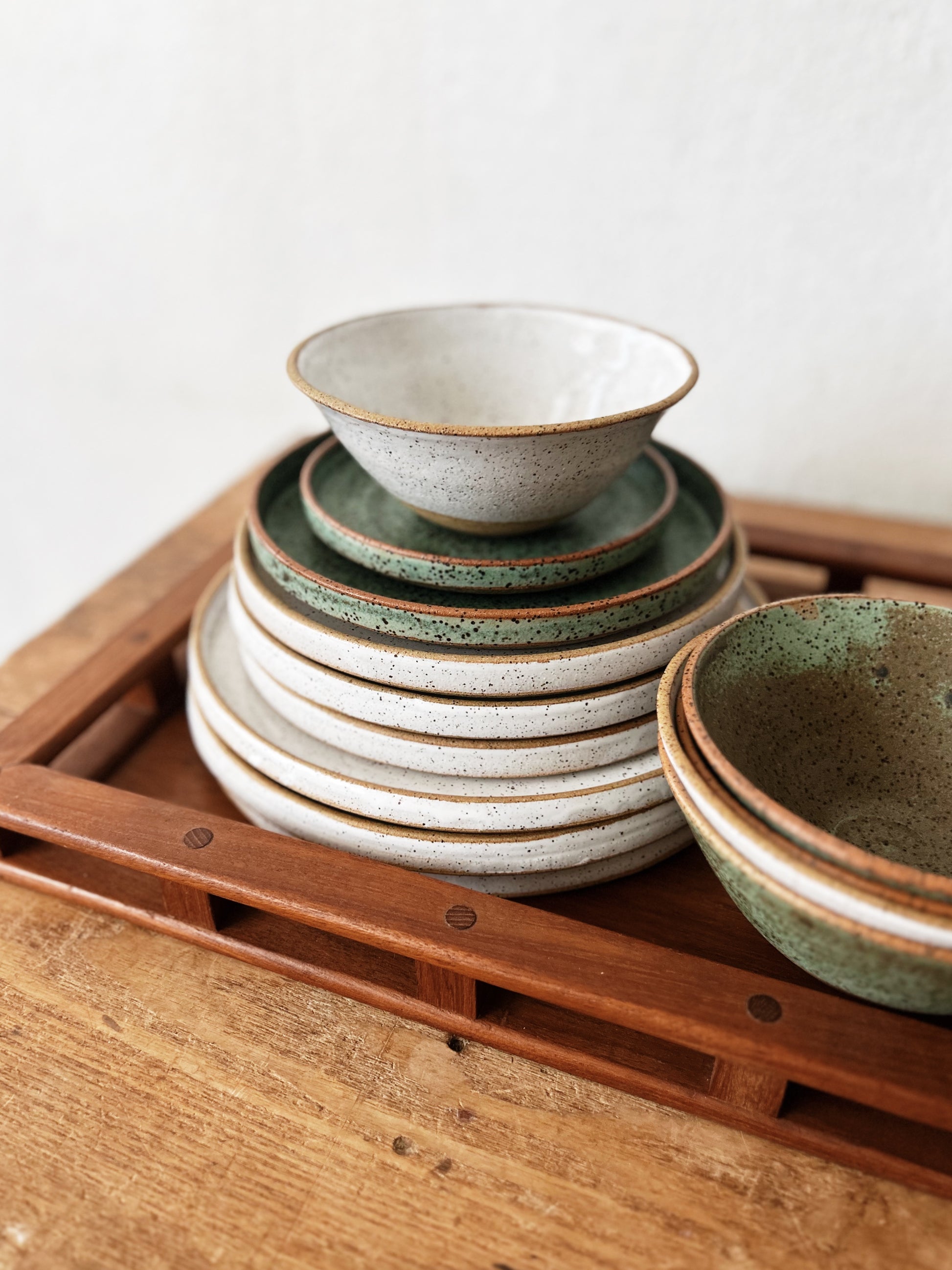 Beautful collection of handmade stoneware. Modern rim plates and simple fluted bowls. Not quite a full set but works for 2-4 mix and match style