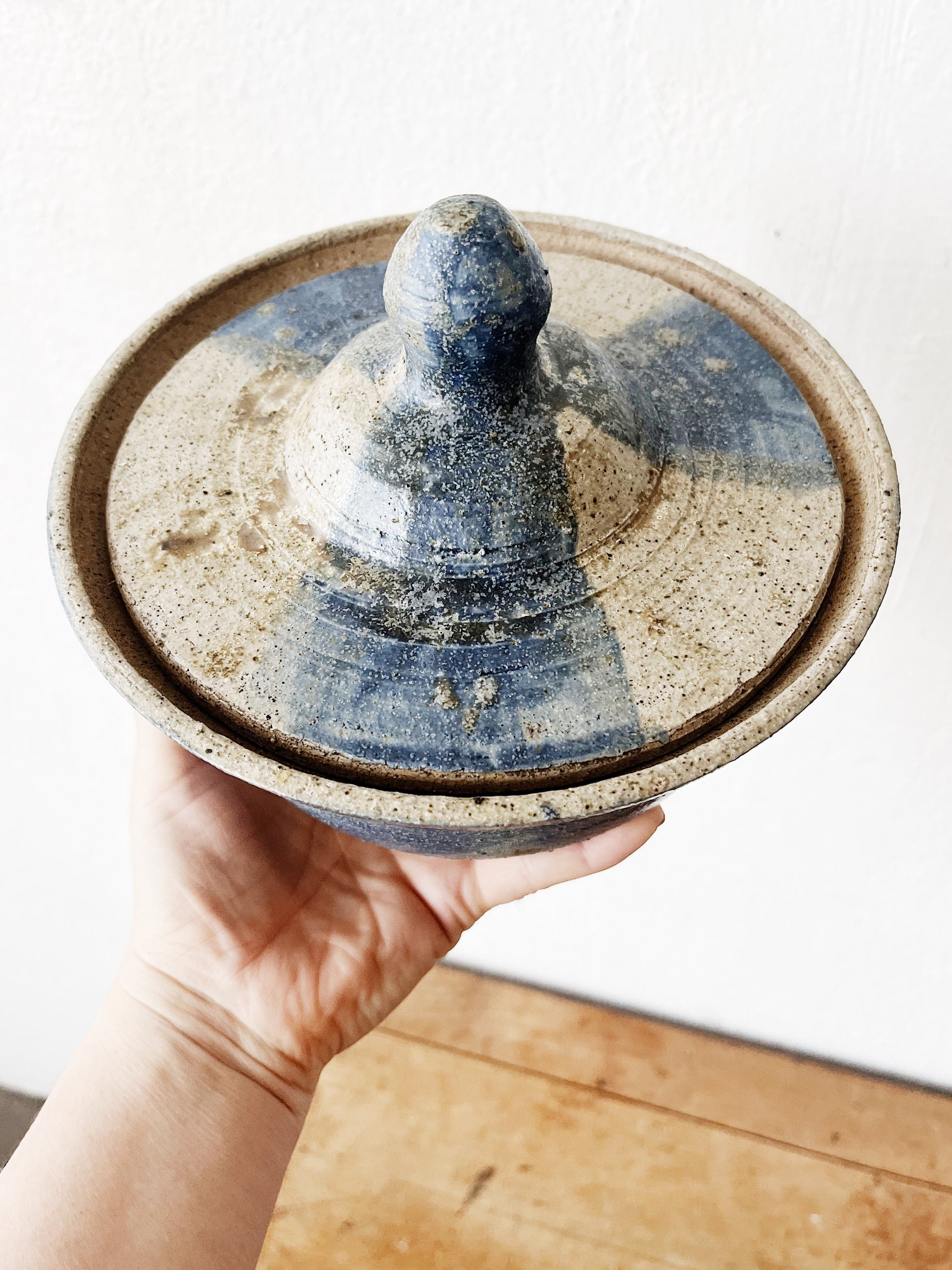 Handmade stoneware crock. Lidded vessel has a glazed interior, making it food safe. Colors and design are both aces