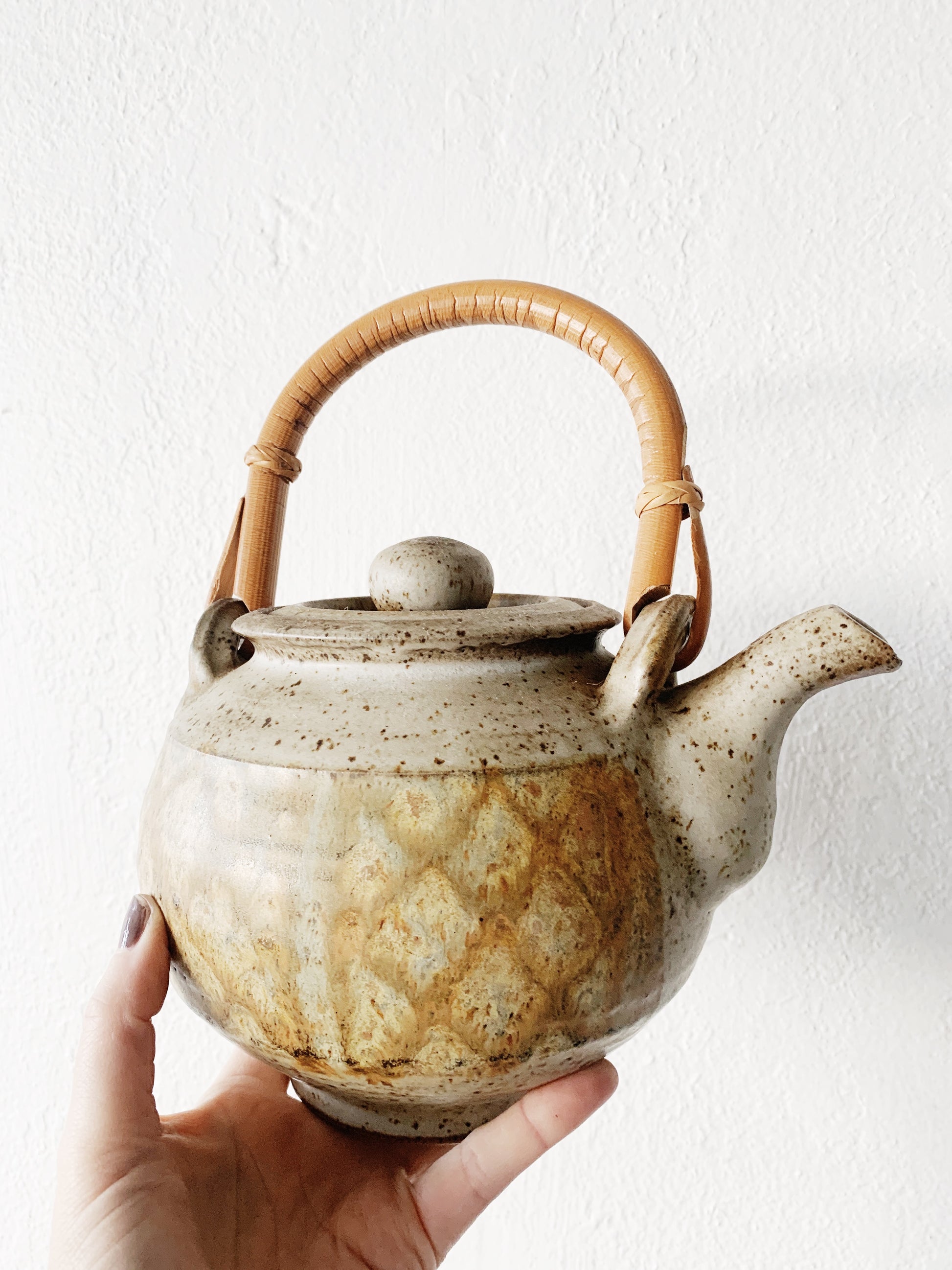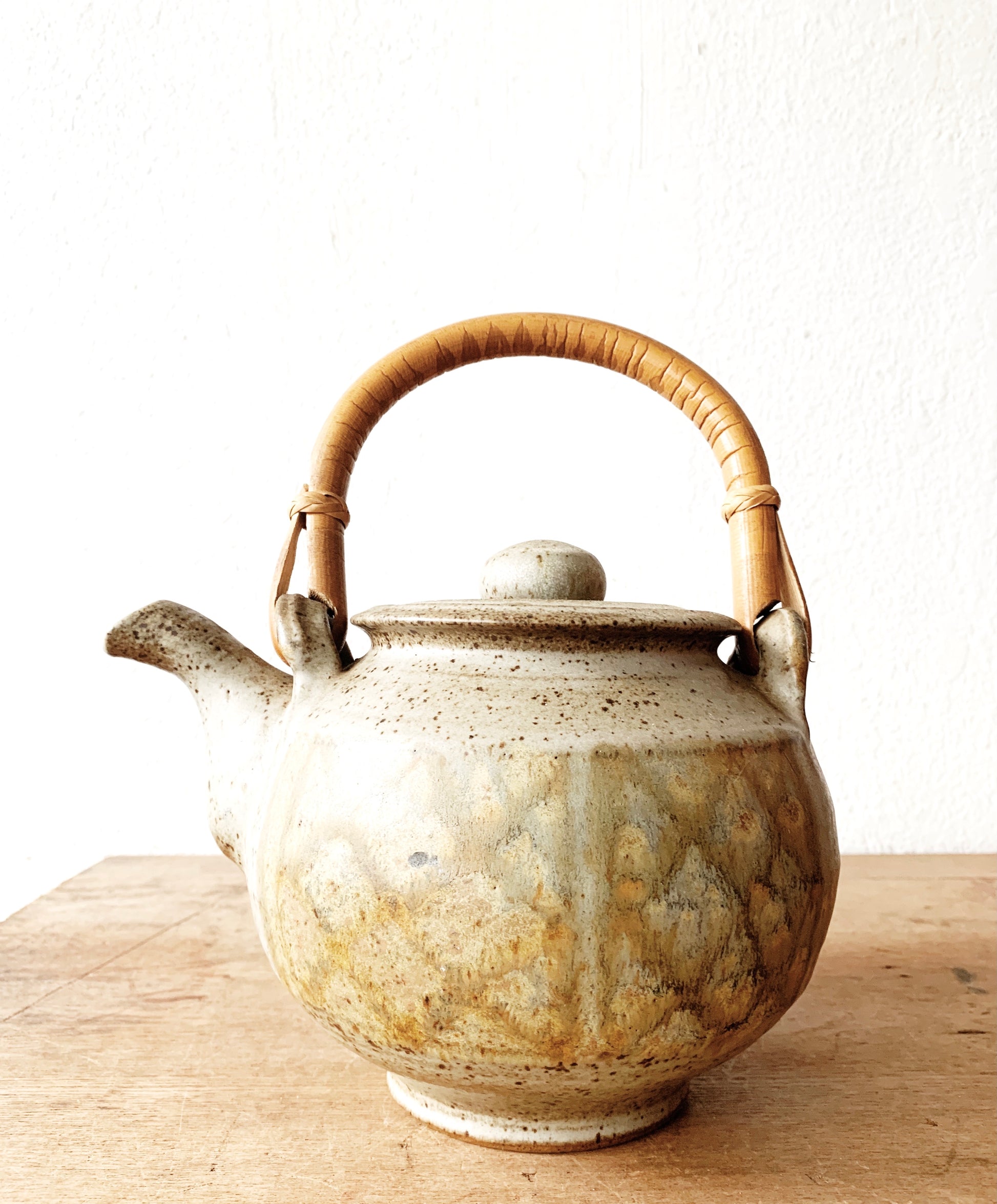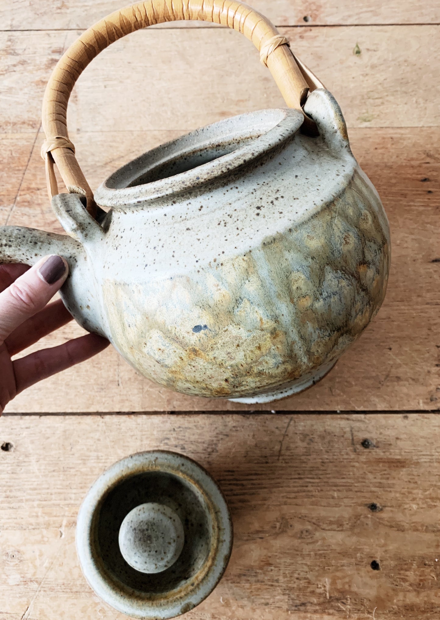 Beautiful vintage 70’s handmade stoneware kettle. Gorgeous patterning and matte glaze, bamboo handle. Overall beautiful, one little spout chip that is hardly noticeable. Priced accordingly.