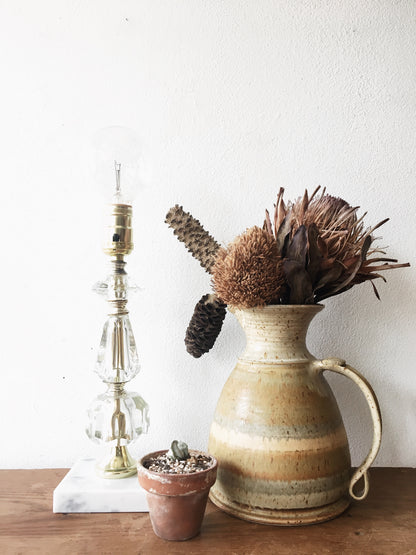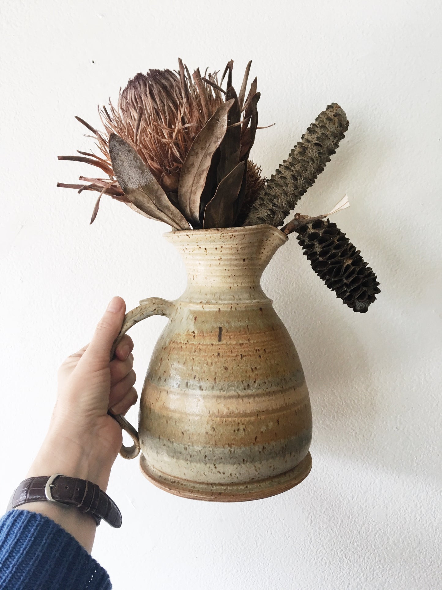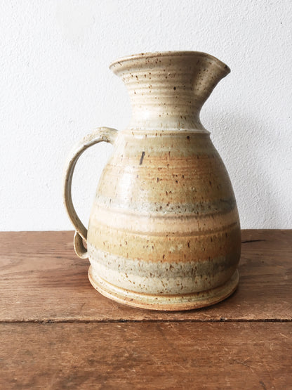 Lovely pitcher with matte glaze. Faint stripes of ecru, grayish blue and terra cotta.